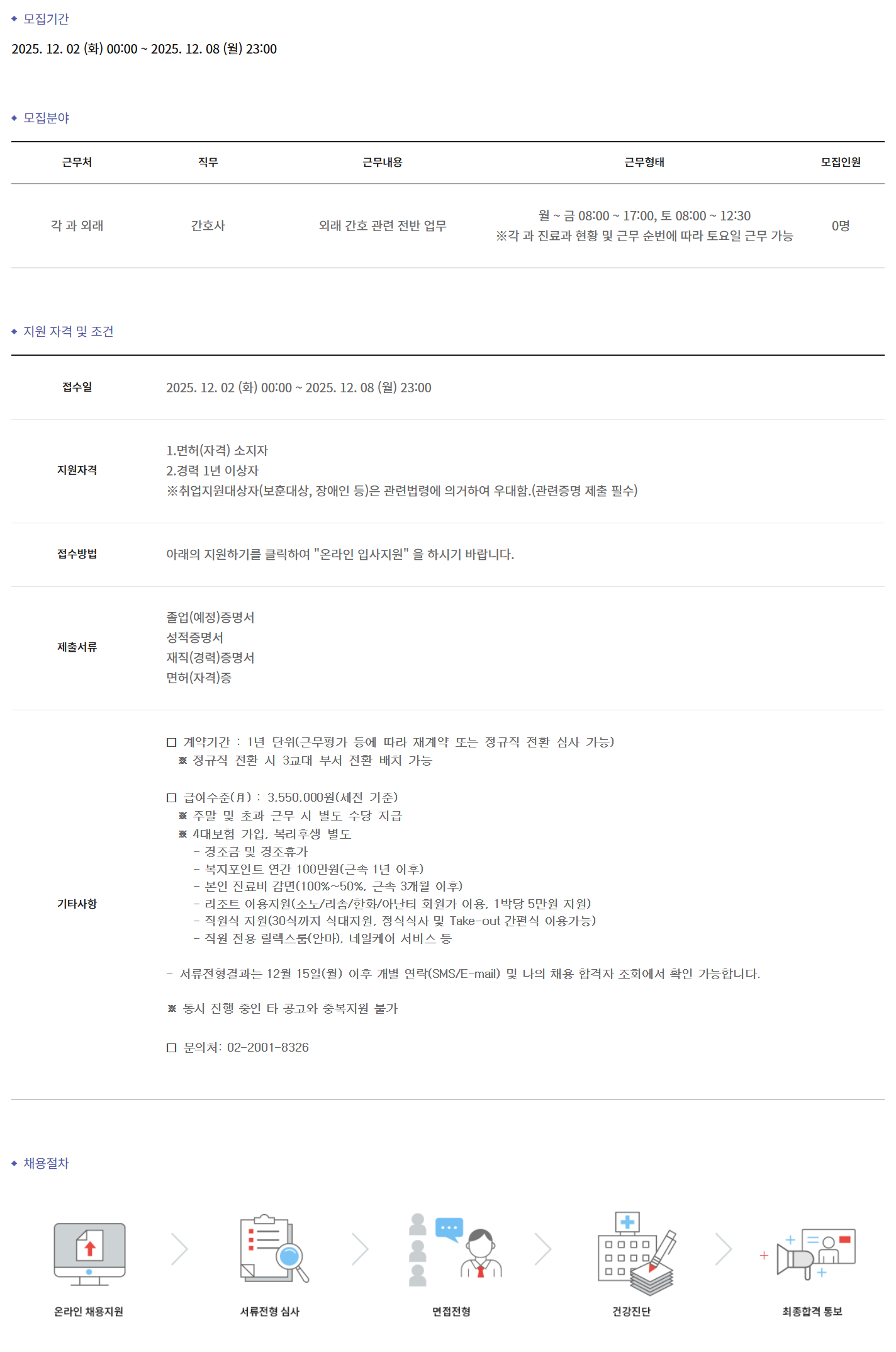 ±Ù¹«Ã³ Á÷¹« ±Ù¹«³»¿ë ±Ù¹«ÇüÅ ¸ðÁýÀοø °¢ °ú ¿Ü·¡ °£È£»ç ¿Ü·¡ °£È£ °ü·Ã Àü¹Ý ¾÷¹« ¿ù ~ ±Ý 08:00 ~ 17:00, Åä 08:00 ~ 12:30 ¡Ø°¢ °ú Áø·á°ú ÇöȲ ¹× ±Ù¹« ¼ø¹ø¿¡ µû¶ó Åä¿äÀÏ ±Ù¹« °¡´É 0¸í