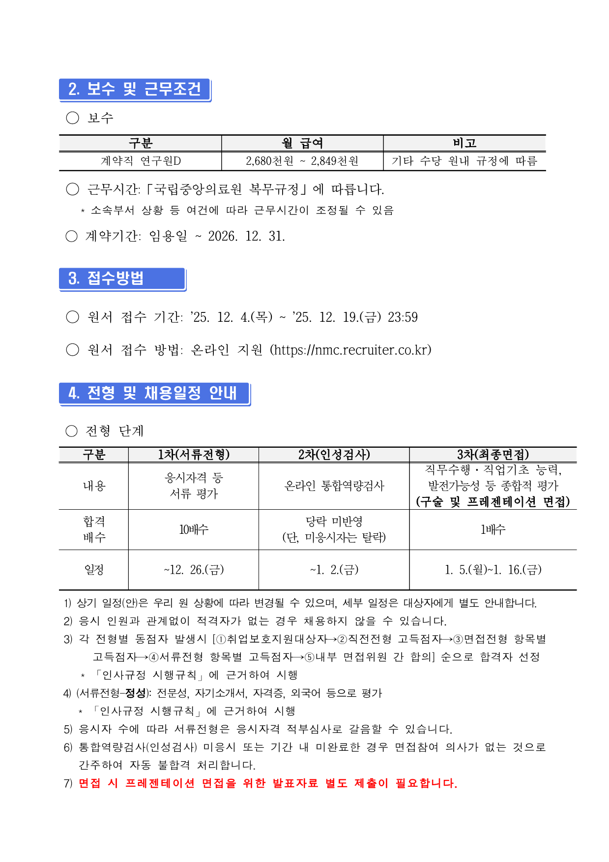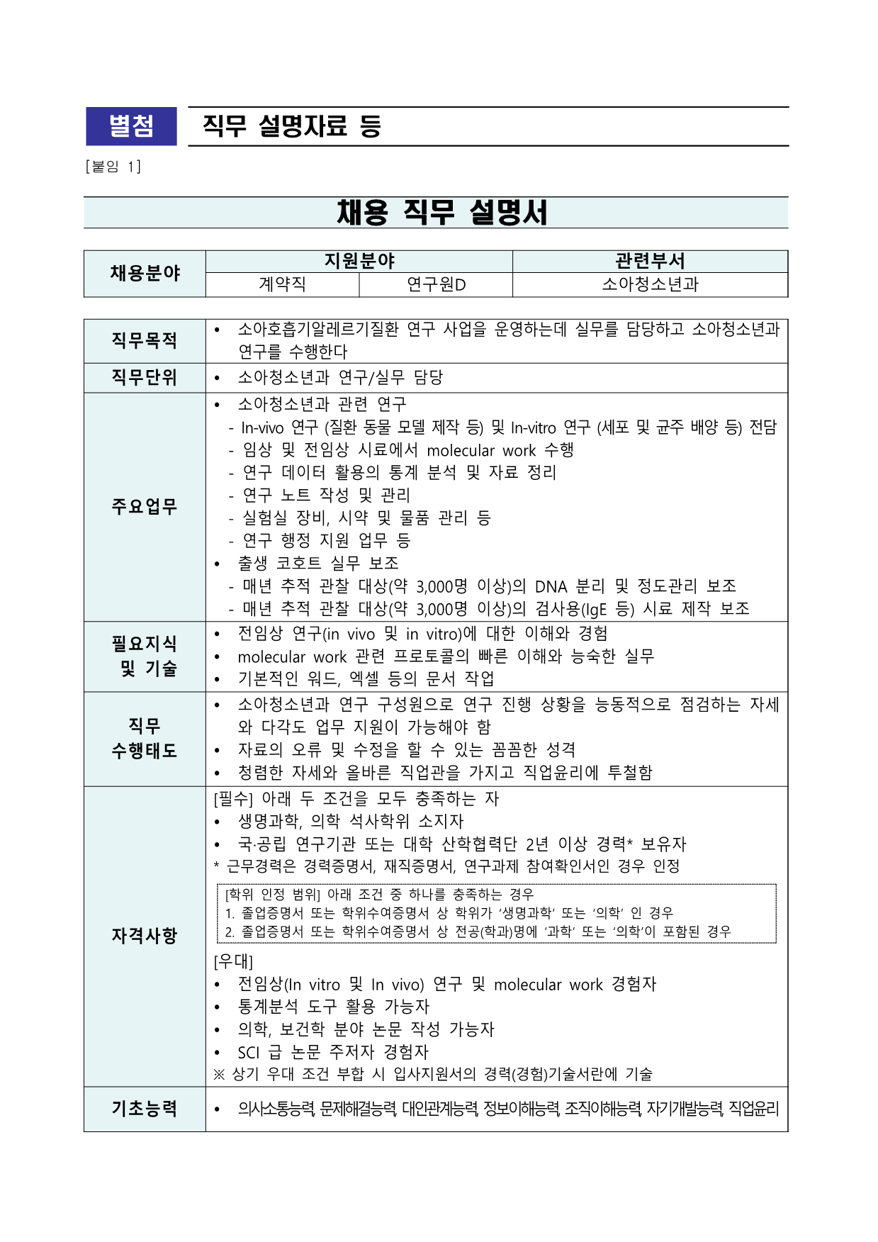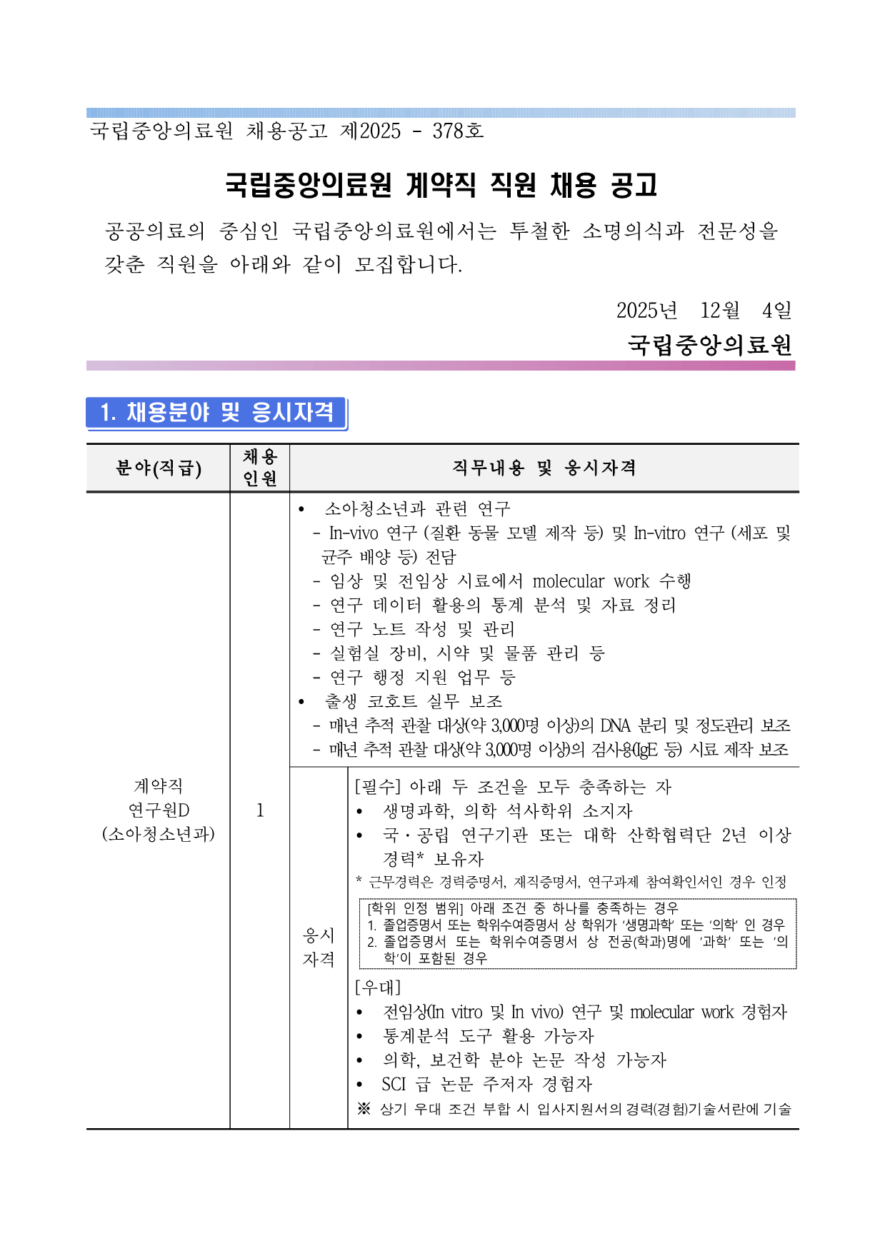 ±¹¸³Áß¾ÓÀÇ·á¿ø ä¿ë°ø°í Á¦2025 - 378È£ ±¹¸³Áß¾ÓÀÇ·á¿ø °è¾àÁ÷ Á÷¿ø ä¿ë °ø°í °ø°øÀÇ·áÀÇ Áß½ÉÀÎ ±¹¸³Áß¾ÓÀÇ·á¿ø¿¡¼´Â ÅõöÇÑ ¼Ò¸íÀǽİú Àü¹®¼ºÀ»°®Ãá Á÷¿øÀ» ¾Æ·¡¿Í °°ÀÌ ¸ðÁýÇÕ´Ï´Ù. 2025³â 12¿ù 4Àϱ¹¸³Áß¾ÓÀÇ·á¿ø1. ä¿ëºÐ¾ß ¹× ÀÀ½ÃÀÚ°Ý ºÐ¾ß(Á÷±Þ) ä¿ë Àοø Á÷¹«³»¿ë ¹× ÀÀ½ÃÀÚ°Ý °è¾àÁ÷ ¿¬±¸¿øD (¼Ò¾ÆÃ»¼Ò³â°ú) 1 Ÿ ¼Ò¾ÆÃ»¼Ò³â°ú °ü·Ã ¿¬±¸ - In-vivo ¿¬±¸ (Áúȯ µ¿¹° ¸ðµ¨ Á¦ÀÛ µî) ¹× In-vitro ¿¬±¸ (¼¼Æ÷ ¹× ±ÕÁÖ ¹è¾ç µî) Àü´ã - ÀÓ»ó ¹× ÀüÀÓ»ó ½Ã·á¿¡¼ molecular work ¼öÇà - ¿¬±¸ µ¥ÀÌÅÍ È°¿ëÀÇ Åë°è ºÐ¼® ¹× ÀÚ·á Á¤¸® - ¿¬±¸ ³ëÆ® ÀÛ¼º ¹× °ü¸® - ½ÇÇè½Ç Àåºñ, ½Ã¾à ¹× ¹°Ç° °ü¸® µî - ¿¬±¸ ÇàÁ¤ Áö¿ø ¾÷¹« µî Ÿ Ãâ»ý ÄÚȣƮ ½Ç¹« º¸Á¶ - ¸Å³â ÃßÀû °üÂû ´ë»ó(¾à 3,000¸í ÀÌ»ó)ÀÇ DNA ºÐ¸® ¹× Á¤µµ°ü¸® º¸Á¶- ¸Å³â ÃßÀû °üÂû ´ë»ó(¾à 3,000¸í ÀÌ»ó)ÀÇ °Ë»ç¿ë(IgE µî) ½Ã·á Á¦ÀÛ º¸Á¶ÀÀ½Ã ÀÚ°Ý [Çʼö] ¾Æ·¡ µÎ Á¶°ÇÀ» ¸ðµÎ ÃæÁ·ÇÏ´Â ÀÚ Ÿ »ý¸í°úÇÐ, ÀÇÇÐ ¼®»çÇÐÀ§ ¼ÒÁöÀÚ Ÿ ±¹¡¤°ø¸³ ¿¬±¸±â°ü ¶Ç´Â ´ëÇÐ »êÇÐÇù·Â´Ü 2³â ÀÌ»ó °æ·Â* º¸À¯ÀÚ * ±Ù¹«°æ·ÂÀº °æ·ÂÁõ¸í¼, ÀçÁ÷Áõ¸í¼, ¿¬±¸°úÁ¦ Âü¿©È®ÀμÀÎ °æ¿ì ÀÎÁ¤[ÇÐÀ§ ÀÎÁ¤ ¹üÀ§] ¾Æ·¡ Á¶°Ç Áß Çϳª¸¦ ÃæÁ·ÇÏ´Â °æ¿ì 1. Á¹¾÷Áõ¸í¼ ¶Ç´Â ÇÐÀ§¼ö¿©Áõ¸í¼ »ó ÇÐÀ§°¡ ¡®»ý¸í°úÇС¯ ¶Ç´Â ¡®ÀÇÇС¯ ÀÎ °æ¿ì 2. Á¹¾÷Áõ¸í¼ ¶Ç´Â ÇÐÀ§¼ö¿©Áõ¸í¼ »ó Àü°ø(Çаú)¸í¿¡ ¡®°úÇС¯ ¶Ç´Â ¡®ÀÇÇС¯ÀÌ Æ÷ÇÔµÈ °æ¿ì [¿ì´ë] Ÿ ÀüÀÓ»ó(In vitro ¹× In vivo) ¿¬±¸ ¹× molecular work °æÇèÀÚŸ Åë°èºÐ¼® µµ±¸ Ȱ¿ë °¡´ÉÀÚ Ÿ ÀÇÇÐ, º¸°ÇÇÐ ºÐ¾ß ³í¹® ÀÛ¼º °¡´ÉÀÚ Ÿ SCI ±Þ ³í¹® ÁÖÀúÀÚ °æÇèÀÚ ¡Ø »ó±â ¿ì´ë Á¶°Ç ºÎÇÕ ½Ã ÀÔ»çÁö¿ø¼ÀÇ °æ·Â(°æÇè)±â¼ú¼¶õ¿¡ ±â¼ú