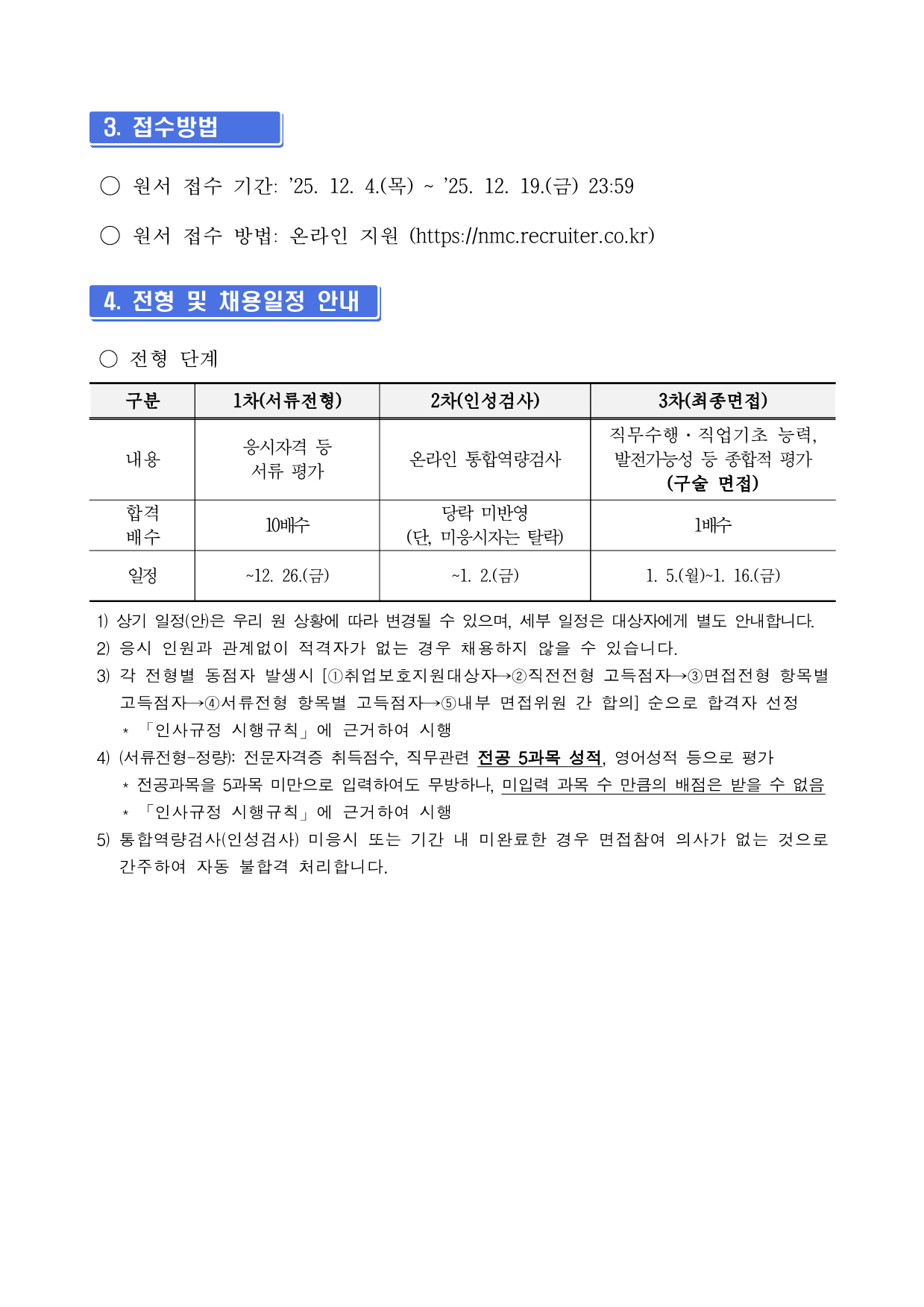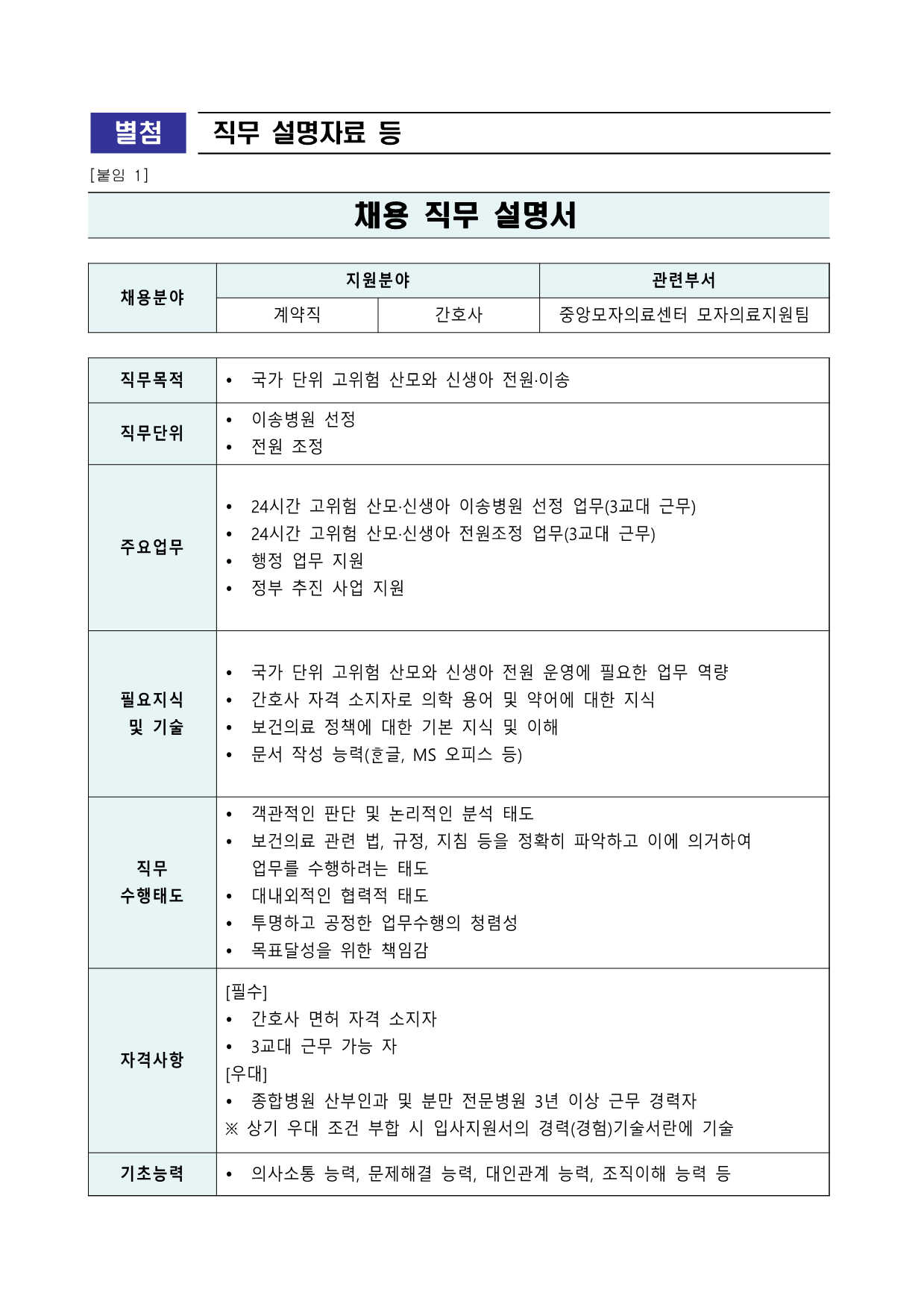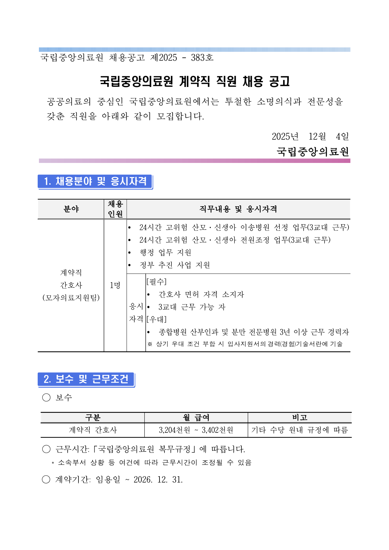 ±¹¸³Áß¾ÓÀÇ·á¿ø ä¿ë°ø°í Á¦2025 - 383È£ ±¹¸³Áß¾ÓÀÇ·á¿ø °è¾àÁ÷ Á÷¿ø ä¿ë °ø°í °ø°øÀÇ·áÀÇ Áß½ÉÀÎ ±¹¸³Áß¾ÓÀÇ·á¿ø¿¡¼´Â ÅõöÇÑ ¼Ò¸íÀǽİú Àü¹®¼ºÀ»°®Ãá Á÷¿øÀ» ¾Æ·¡¿Í °°ÀÌ ¸ðÁýÇÕ´Ï´Ù. 2025³â 12¿ù 4Àϱ¹¸³Áß¾ÓÀÇ·á¿ø1. ä¿ëºÐ¾ß ¹× ÀÀ½ÃÀÚ°Ý ºÐ¾ß ä¿ë Àοø Á÷¹«³»¿ë ¹× ÀÀ½ÃÀÚ°Ý °è¾àÁ÷ °£È£»ç (¸ðÀÚÀÇ·áÁö¿øÆÀ) 1¸í Ÿ 24½Ã°£ °íÀ§Çè »ê¸ð¡¤½Å»ý¾Æ À̼ۺ´¿ø ¼±Á¤ ¾÷¹«(3±³´ë ±Ù¹«) Ÿ 24½Ã°£ °íÀ§Çè »ê¸ð¡¤½Å»ý¾Æ Àü¿øÁ¶Á¤ ¾÷¹«(3±³´ë ±Ù¹«) Ÿ ÇàÁ¤ ¾÷¹« Áö¿ø Ÿ Á¤ºÎ ÃßÁø »ç¾÷ Áö¿ø ÀÀ½Ã ÀÚ°Ý [Çʼö] Ÿ °£È£»ç ¸éÇã ÀÚ°Ý ¼ÒÁöÀÚ Ÿ 3±³´ë ±Ù¹« °¡´É ÀÚ [¿ì´ë] Ÿ Á¾ÇÕº´¿ø »êºÎÀΰú ¹× ºÐ¸¸ Àü¹®º´¿ø 3³â ÀÌ»ó ±Ù¹« °æ·ÂÀÚ¡Ø »ó±â ¿ì´ë Á¶°Ç ºÎÇÕ ½Ã ÀÔ»çÁö¿ø¼ÀÇ °æ·Â(°æÇè)±â¼ú¼¶õ¿¡ ±â¼ú2. º¸¼ö ¹× ±Ù¹«Á¶°Ç ¡Û º¸¼ö ±¸ºÐ ¿ù ±Þ¿© ºñ°í °è¾àÁ÷ °£È£»ç 3,204õ¿ø ~ 3,402õ¿ø ±âŸ ¼ö´ç ¿ø³» ±ÔÁ¤¿¡ µû¸§¡Û ±Ù¹«½Ã°£:¡¸±¹¸³Áß¾ÓÀÇ·á¿ø º¹¹«±ÔÁ¤¡¹¿¡ µû¸¨´Ï´Ù. * ¼Ò¼ÓºÎ¼ »óȲ µî ¿©°Ç¿¡ µû¶ó ±Ù¹«½Ã°£ÀÌ Á¶Á¤µÉ ¼ö ÀÖÀ½ ¡Û °è¾à±â°£: ÀÓ¿ëÀÏ ~ 2026. 12. 31.