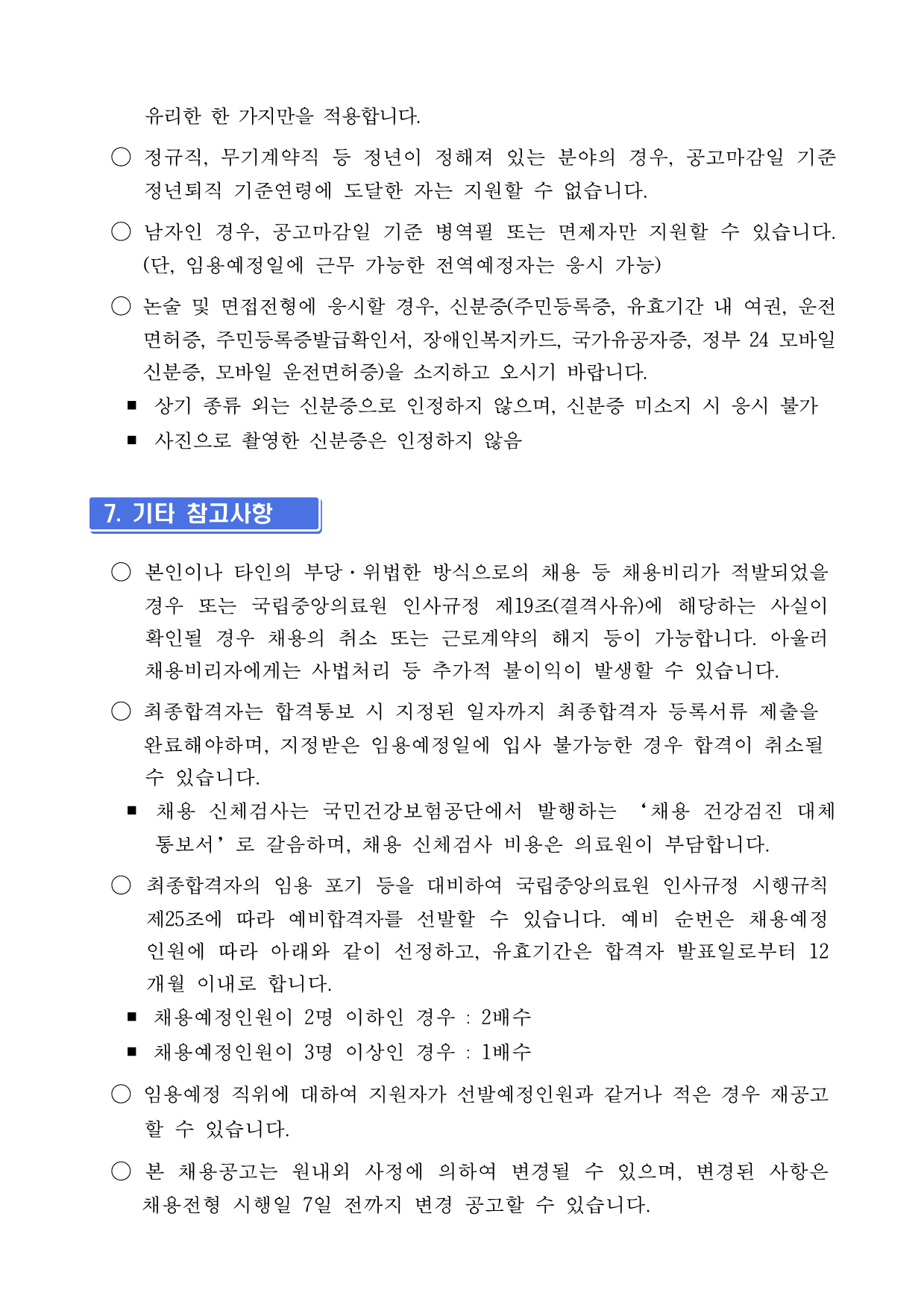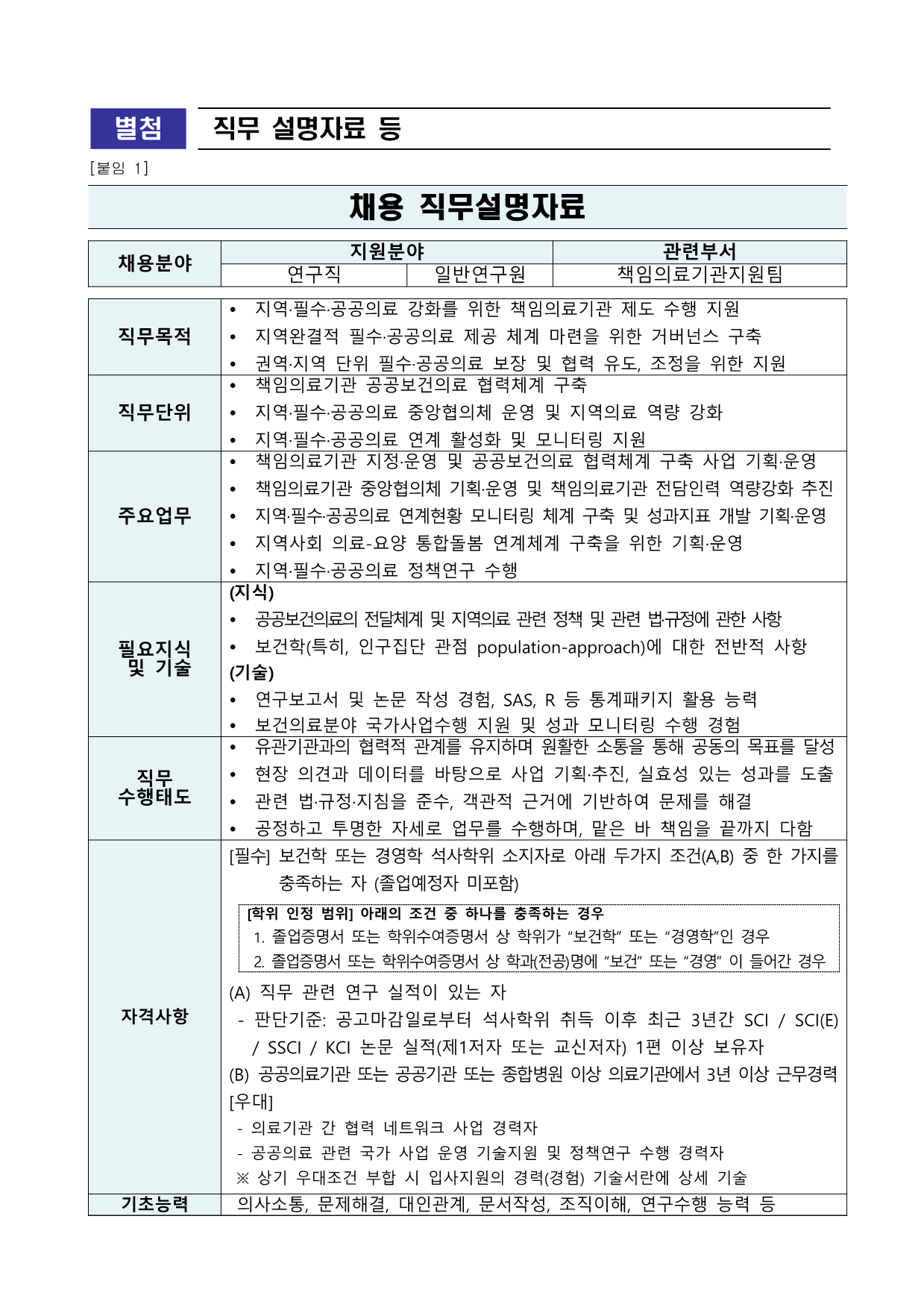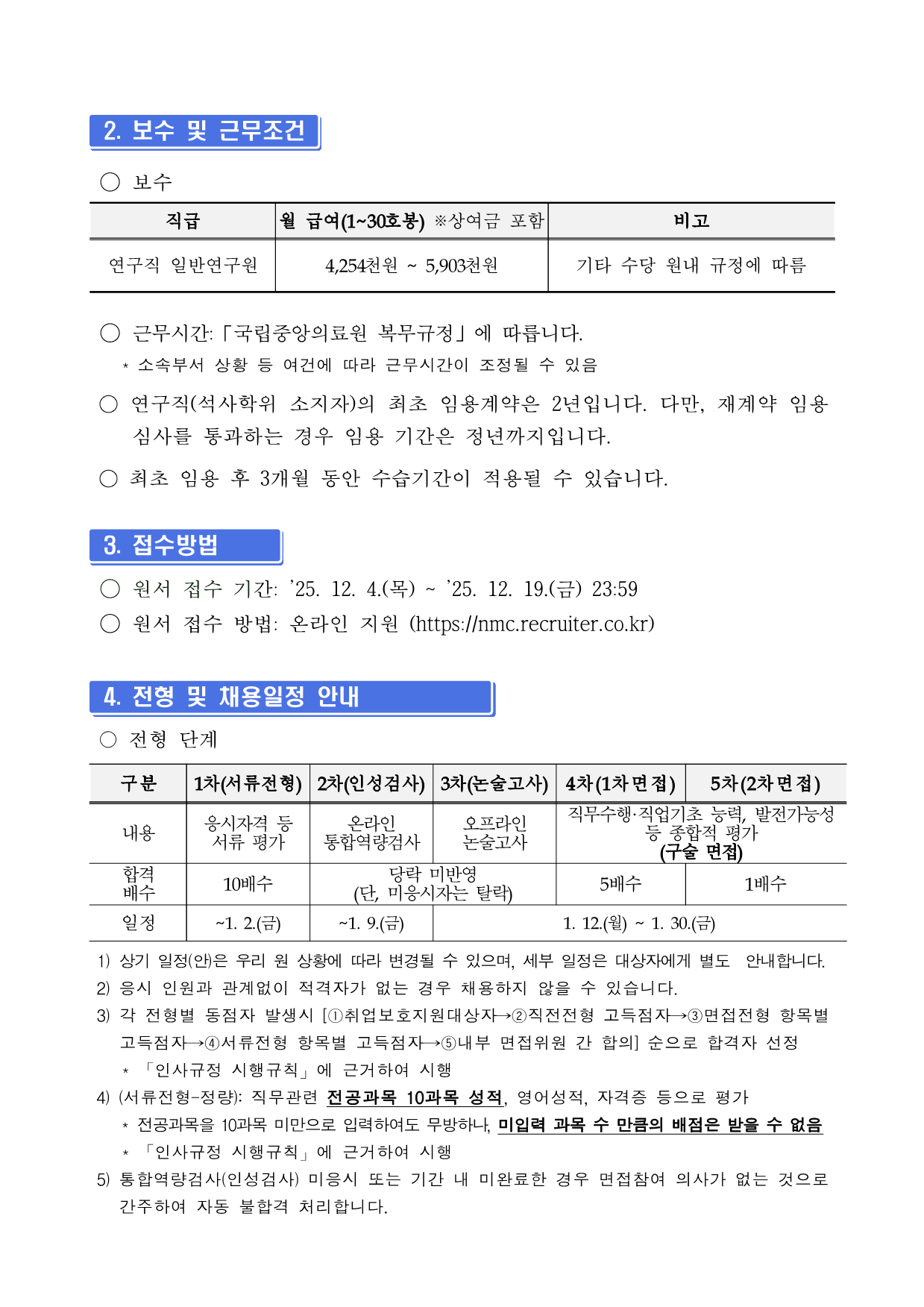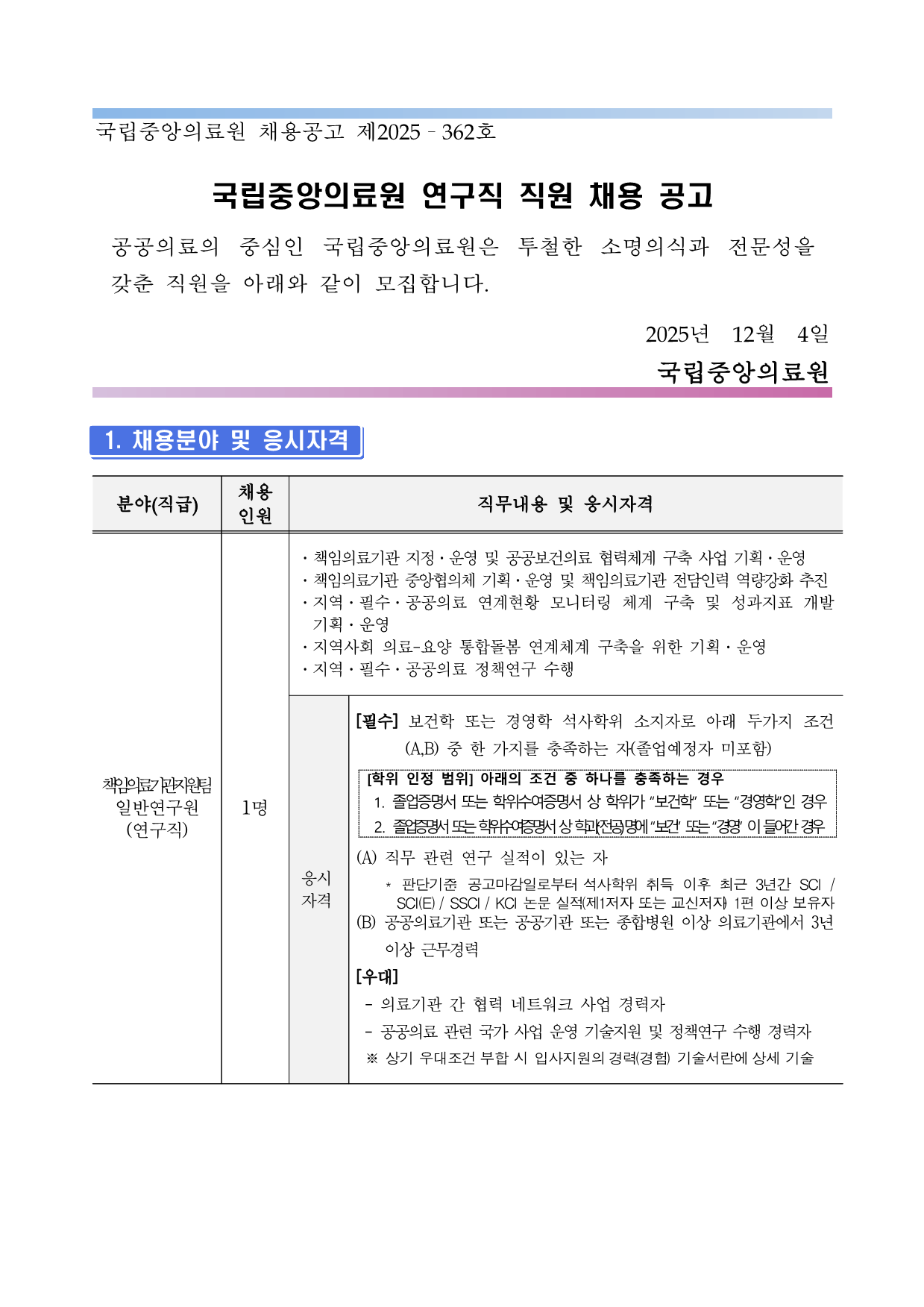 ±¹¸³Áß¾ÓÀÇ·á¿ø ä¿ë°ø°í Á¦2025–362È£ ±¹¸³Áß¾ÓÀÇ·á¿ø ¿¬±¸Á÷ Á÷¿ø ä¿ë °ø°í °ø°øÀÇ·áÀÇ Áß½ÉÀÎ ±¹¸³Áß¾ÓÀÇ·á¿øÀº ÅõöÇÑ ¼Ò¸íÀǽİú Àü¹®¼ºÀ» °®Ãá Á÷¿øÀ» ¾Æ·¡¿Í °°ÀÌ ¸ðÁýÇÕ´Ï´Ù. 2025³â 12¿ù 4Àϱ¹¸³Áß¾ÓÀÇ·á¿ø1. ä¿ëºÐ¾ß ¹× ÀÀ½ÃÀÚ°Ý ºÐ¾ß(Á÷±Þ) ä¿ë Àοø Á÷¹«³»¿ë ¹× ÀÀ½ÃÀÚ°Ý Ã¥ÀÓÀÇ·á±â°üÁö¿øÆÀ ÀϹݿ¬±¸¿ø (¿¬±¸Á÷) 1¸í ¡¤Ã¥ÀÓÀÇ·á±â°ü ÁöÁ¤¡¤¿î¿µ ¹× °ø°øº¸°ÇÀÇ·á Çù·Âü°è ±¸Ãà »ç¾÷ ±âȹ¡¤¿î¿µ¡¤Ã¥ÀÓÀÇ·á±â°ü Áß¾ÓÇùÀÇü ±âȹ¡¤¿î¿µ ¹× Ã¥ÀÓÀÇ·á±â°ü Àü´ãÀη ¿ª·®°È ÃßÁø¡¤Áö¿ª¡¤Çʼö¡¤°ø°øÀÇ·á ¿¬°èÇöȲ ¸ð´ÏÅ͸µ ü°è ±¸Ãà ¹× ¼º°úÁöÇ¥ °³¹ß ±âȹ¡¤¿î¿µ ¡¤Áö¿ª»çȸ ÀÇ·á-¿ä¾ç ÅëÇÕµ¹º½ ¿¬°èü°è ±¸ÃàÀ» À§ÇÑ ±âȹ¡¤¿î¿µ ¡¤Áö¿ª¡¤Çʼö¡¤°ø°øÀÇ·á Á¤Ã¥¿¬±¸ ¼öÇà ÀÀ½Ã ÀÚ°Ý [Çʼö] º¸°ÇÇÐ ¶Ç´Â °æ¿µÇÐ ¼®»çÇÐÀ§ ¼ÒÁöÀÚ·Î ¾Æ·¡ µÎ°¡Áö Á¶°Ç(A,B) Áß ÇÑ °¡Áö¸¦ ÃæÁ·ÇÏ´Â ÀÚ(Á¹¾÷¿¹Á¤ÀÚ ¹ÌÆ÷ÇÔ) [ÇÐÀ§ ÀÎÁ¤ ¹üÀ§] ¾Æ·¡ÀÇ Á¶°Ç Áß Çϳª¸¦ ÃæÁ·ÇÏ´Â °æ¿ì 1. Á¹¾÷Áõ¸í¼ ¶Ç´Â ÇÐÀ§¼ö¿©Áõ¸í¼ »ó ÇÐÀ§°¡ ¡°º¸°ÇÇС± ¶Ç´Â ¡°°æ¿µÇС±ÀÎ °æ¿ì2. Á¹¾÷Áõ¸í¼ ¶Ç´Â ÇÐÀ§¼ö¿©Áõ¸í¼ »ó Çаú(Àü°ø)¸í¿¡ ¡°º¸°Ç¡± ¶Ç´Â ¡°°æ¿µ¡± ÀÌ µé¾î°£ °æ¿ì(A) Á÷¹« °ü·Ã ¿¬±¸ ½ÇÀûÀÌ ÀÖ´Â ÀÚ * ÆÇ´Ü±âÁØ: °ø°í¸¶°¨ÀϷκÎÅÍ ¼®»çÇÐÀ§ Ãëµæ ÀÌÈÄ ÃÖ±Ù 3³â°£ SCI / SCI(E) / SSCI / KCI ³í¹® ½ÇÀû(Á¦1ÀúÀÚ ¶Ç´Â ±³½ÅÀúÀÚ) 1Æí ÀÌ»ó º¸À¯ÀÚ(B) °ø°øÀÇ·á±â°ü ¶Ç´Â °ø°ø±â°ü ¶Ç´Â Á¾ÇÕº´¿ø ÀÌ»ó ÀÇ·á±â°ü¿¡¼ 3³â ÀÌ»ó ±Ù¹«°æ·Â [¿ì´ë] - ÀÇ·á±â°ü °£ Çù·Â ³×Æ®¿öÅ© »ç¾÷ °æ·ÂÀÚ - °ø°øÀÇ·á °ü·Ã ±¹°¡ »ç¾÷ ¿î¿µ ±â¼úÁö¿ø ¹× Á¤Ã¥¿¬±¸ ¼öÇà °æ·ÂÀÚ¡Ø »ó±â ¿ì´ëÁ¶°Ç ºÎÇÕ ½Ã ÀÔ»çÁö¿øÀÇ °æ·Â(°æÇè) ±â¼ú¼¶õ¿¡ »ó¼¼ ±â¼ú
