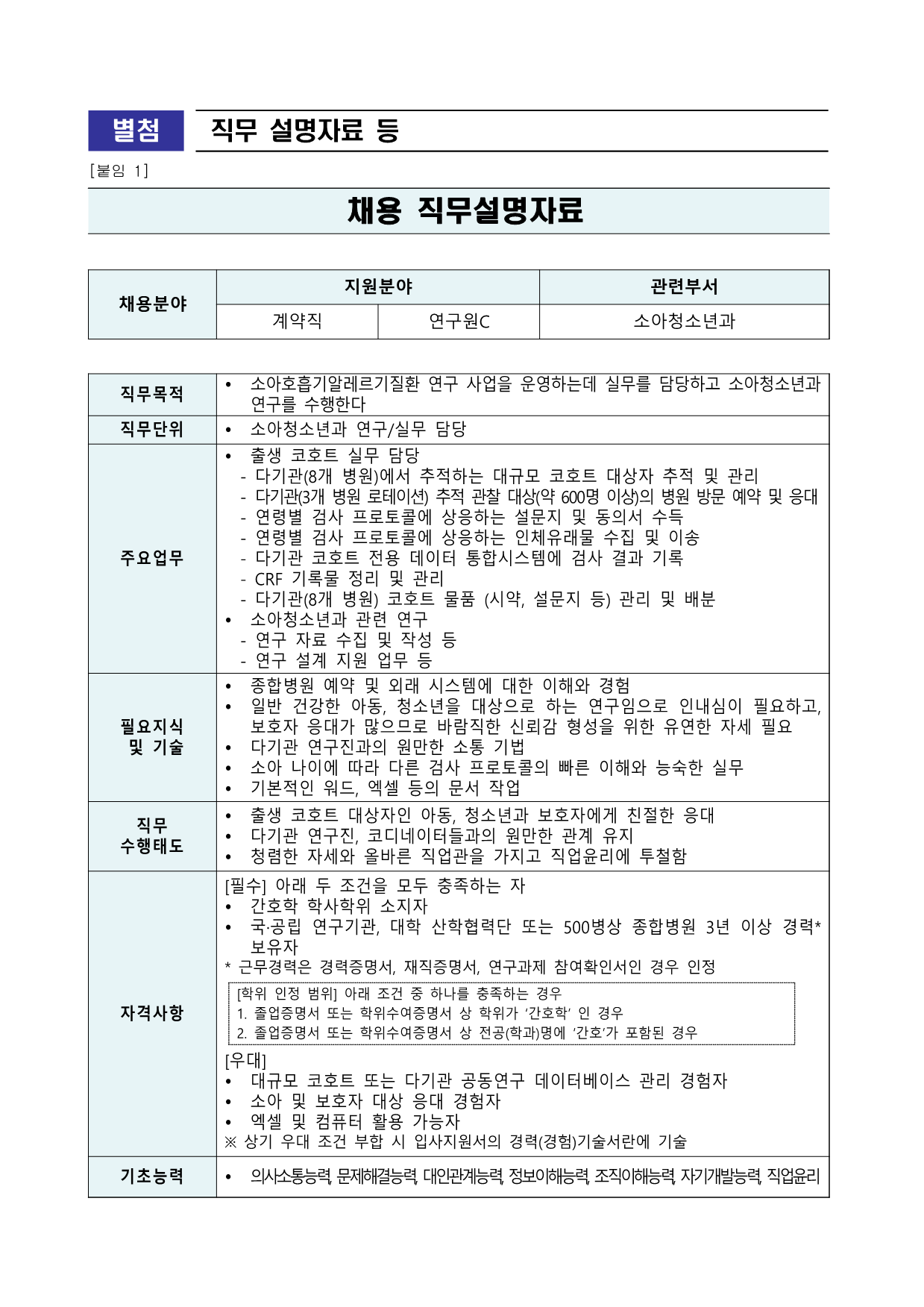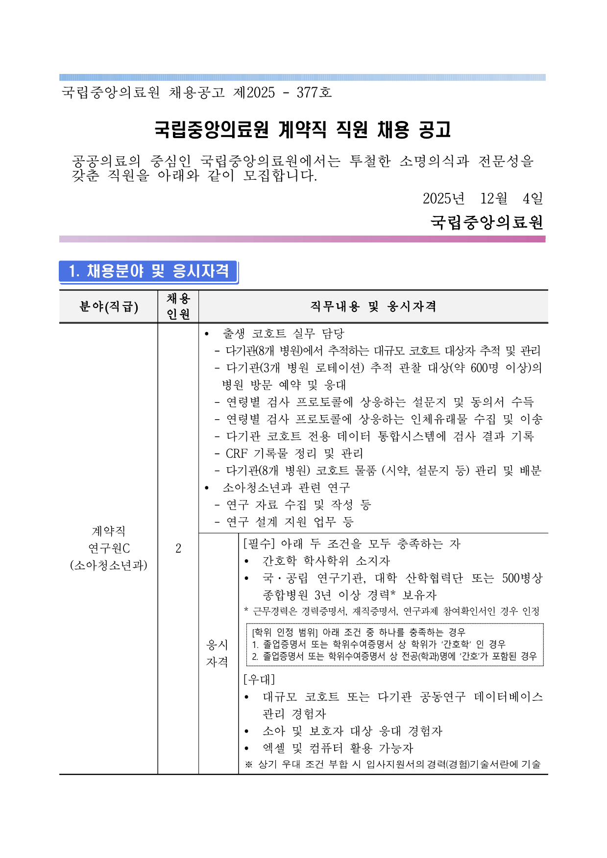 ±¹¸³Áß¾ÓÀÇ·á¿ø ä¿ë°ø°í Á¦2025 - 377È£ ±¹¸³Áß¾ÓÀÇ·á¿ø °è¾àÁ÷ Á÷¿ø ä¿ë °ø°í °ø°øÀÇ·áÀÇ Áß½ÉÀÎ ±¹¸³Áß¾ÓÀÇ·á¿ø¿¡¼´Â ÅõöÇÑ ¼Ò¸íÀǽİú Àü¹®¼ºÀ»°®Ãá Á÷¿øÀ» ¾Æ·¡¿Í °°ÀÌ ¸ðÁýÇÕ´Ï´Ù. 2025³â 12¿ù 4Àϱ¹¸³Áß¾ÓÀÇ·á¿ø1. ä¿ëºÐ¾ß ¹× ÀÀ½ÃÀÚ°Ý ºÐ¾ß(Á÷±Þ) ä¿ë Àοø Á÷¹«³»¿ë ¹× ÀÀ½ÃÀÚ°Ý °è¾àÁ÷ ¿¬±¸¿øC (¼Ò¾ÆÃ»¼Ò³â°ú) 2 Ÿ Ãâ»ý ÄÚȣƮ ½Ç¹« ´ã´ç - ´Ù±â°ü(8°³ º´¿ø)¿¡¼ ÃßÀûÇÏ´Â ´ë±Ô¸ð ÄÚȣƮ ´ë»óÀÚ ÃßÀû ¹× °ü¸®- ´Ù±â°ü(3°³ º´¿ø ·ÎÅ×À̼Ç) ÃßÀû °üÂû ´ë»ó(¾à 600¸í ÀÌ»ó)ÀÇ º´¿ø ¹æ¹® ¿¹¾à ¹× ÀÀ´ë - ¿¬·Éº° °Ë»ç ÇÁ·ÎÅäÄÝ¿¡ »óÀÀÇÏ´Â ¼³¹®Áö ¹× µ¿ÀǼ ¼öµæ- ¿¬·Éº° °Ë»ç ÇÁ·ÎÅäÄÝ¿¡ »óÀÀÇÏ´Â ÀÎüÀ¯·¡¹° ¼öÁý ¹× À̼Û- ´Ù±â°ü ÄÚȣƮ Àü¿ë µ¥ÀÌÅÍ ÅëÇսýºÅÛ¿¡ °Ë»ç °á°ú ±â·Ï- CRF ±â·Ï¹° Á¤¸® ¹× °ü¸® - ´Ù±â°ü(8°³ º´¿ø) ÄÚȣƮ ¹°Ç° (½Ã¾à, ¼³¹®Áö µî) °ü¸® ¹× ¹èºÐŸ ¼Ò¾ÆÃ»¼Ò³â°ú °ü·Ã ¿¬±¸ - ¿¬±¸ ÀÚ·á ¼öÁý ¹× ÀÛ¼º µî - ¿¬±¸ ¼³°è Áö¿ø ¾÷¹« µî ÀÀ½Ã ÀÚ°Ý [Çʼö] ¾Æ·¡ µÎ Á¶°ÇÀ» ¸ðµÎ ÃæÁ·ÇÏ´Â ÀÚ Ÿ °£È£ÇÐ ÇлçÇÐÀ§ ¼ÒÁöÀÚ Ÿ ±¹¡¤°ø¸³ ¿¬±¸±â°ü, ´ëÇÐ »êÇÐÇù·Â´Ü ¶Ç´Â 500º´»ó Á¾ÇÕº´¿ø 3³â ÀÌ»ó °æ·Â* º¸À¯ÀÚ * ±Ù¹«°æ·ÂÀº °æ·ÂÁõ¸í¼, ÀçÁ÷Áõ¸í¼, ¿¬±¸°úÁ¦ Âü¿©È®ÀμÀÎ °æ¿ì ÀÎÁ¤[ÇÐÀ§ ÀÎÁ¤ ¹üÀ§] ¾Æ·¡ Á¶°Ç Áß Çϳª¸¦ ÃæÁ·ÇÏ´Â °æ¿ì 1. Á¹¾÷Áõ¸í¼ ¶Ç´Â ÇÐÀ§¼ö¿©Áõ¸í¼ »ó ÇÐÀ§°¡ ¡®°£È£ÇС¯ ÀÎ °æ¿ì 2. Á¹¾÷Áõ¸í¼ ¶Ç´Â ÇÐÀ§¼ö¿©Áõ¸í¼ »ó Àü°ø(Çаú)¸í¿¡ ¡®°£È£¡¯°¡ Æ÷ÇÔµÈ °æ¿ì [¿ì´ë] Ÿ ´ë±Ô¸ð ÄÚȣƮ ¶Ç´Â ´Ù±â°ü °øµ¿¿¬±¸ µ¥ÀÌÅͺ£À̽º °ü¸® °æÇèÀÚ Ÿ ¼Ò¾Æ ¹× º¸È£ÀÚ ´ë»ó ÀÀ´ë °æÇèÀÚ Ÿ ¿¢¼¿ ¹× ÄÄÇ»ÅÍ È°¿ë °¡´ÉÀÚ ¡Ø »ó±â ¿ì´ë Á¶°Ç ºÎÇÕ ½Ã ÀÔ»çÁö¿ø¼ÀÇ °æ·Â(°æÇè)±â¼ú¼¶õ¿¡ ±â¼ú