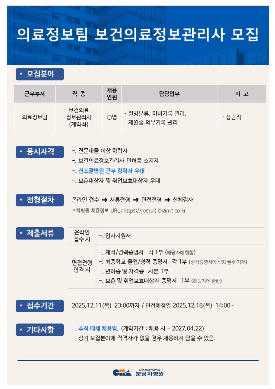 [ºÐ´çÂ÷º´¿ø] ÀÇ·áÁ¤º¸ÆÀ º¸°ÇÀÇ·áÁ¤º¸°ü¸®»ç ¸ðÁý