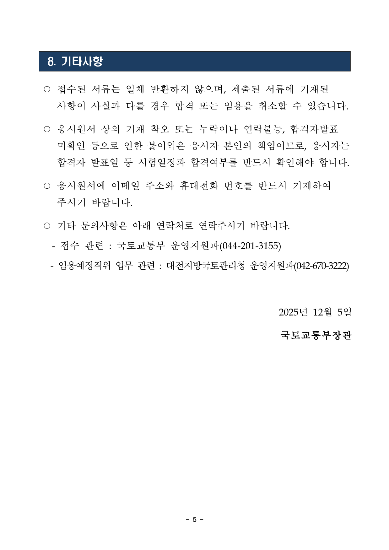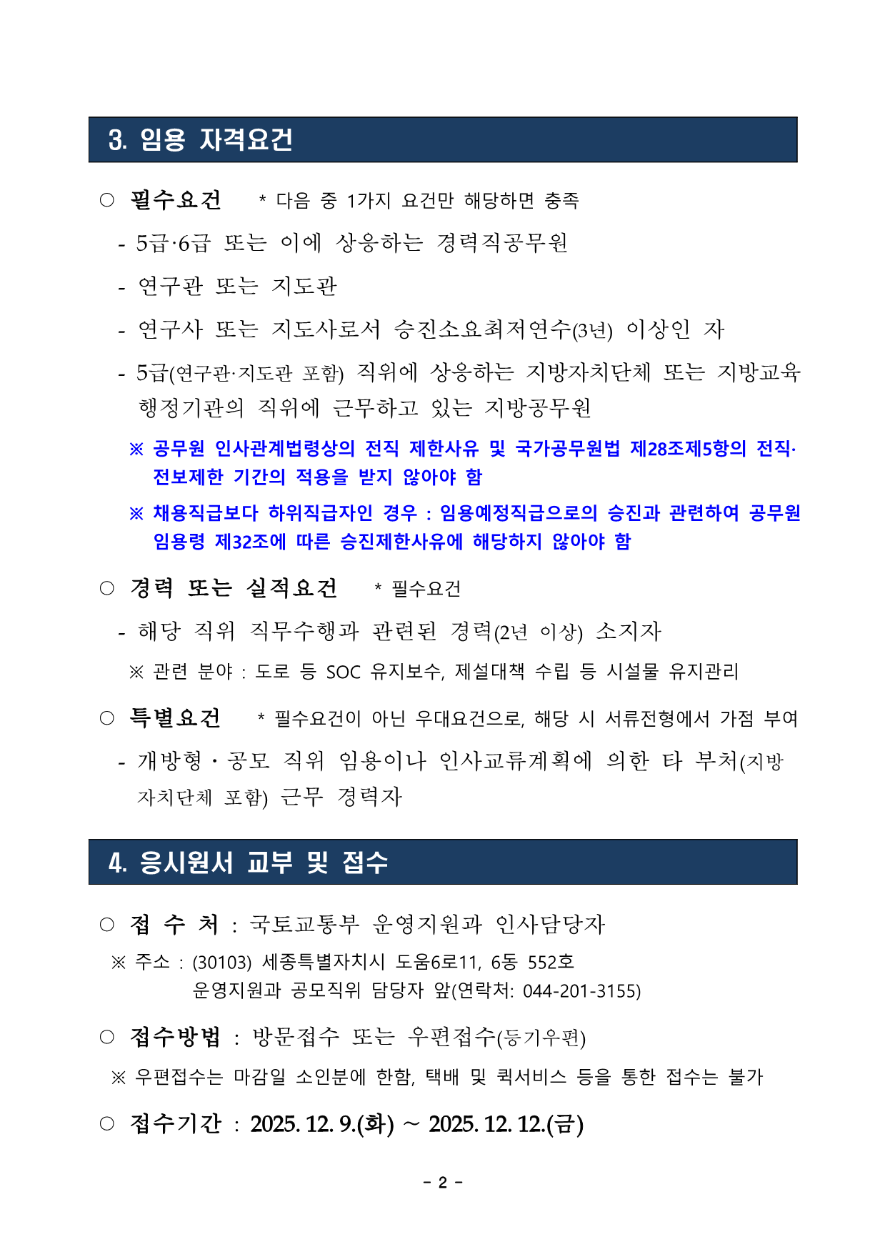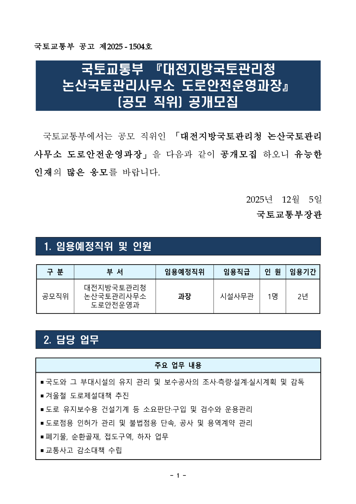 ±¹Åä±³ÅëºÎ °ø°í Á¦2025 - 1504È£ ±¹Åä±³ÅëºÎ ¡º´ëÀüÁö¹æ±¹Åä°ü¸®Ã» ³í»ê±¹Åä°ü¸®»ç¹«¼Ò µµ·Î¾ÈÀü¿î¿µ°úÀå¡» (°ø¸ð Á÷À§) °ø°³¸ðÁý ±¹Åä±³ÅëºÎ¿¡¼´Â °ø¸ð Á÷À§ÀÎ ¡¸´ëÀüÁö¹æ±¹Åä°ü¸®Ã» ³í»ê±¹Åä°ü¸®»ç¹«¼Ò µµ·Î¾ÈÀü¿î¿µ°úÀ塹À» ´ÙÀ½°ú °°ÀÌ °ø°³¸ðÁý ÇÏ¿À´Ï À¯´ÉÇÑÀÎÀçÀÇ ¸¹Àº ÀÀ¸ð¸¦ ¹Ù¶ø´Ï´Ù. 2025³â 12¿ù5Àϱ¹Åä±³ÅëºÎÀå°ü1. Àӿ뿹Á¤Á÷À§ ¹× Àοø ±¸ ºÐ ºÎ ¼ Àӿ뿹Á¤Á÷À§ ÀÓ¿ëÁ÷±Þ ÀÎ ¿ø ÀÓ¿ë±â°£°ø¸ðÁ÷À§ ´ëÀüÁö¹æ±¹Åä°ü¸®Ã» ³í»ê±¹Åä°ü¸®»ç¹«¼Ò µµ·Î¾ÈÀü¿î¿µ°ú °úÀå ½Ã¼³»ç¹«°ü 1¸í 2³â2. ´ã´ç ¾÷¹« ÁÖ¿ä ¾÷¹« ³»¿ë ▪±¹µµ¿Í ±× ºÎ´ë½Ã¼³ÀÇ À¯Áö °ü¸® ¹× º¸¼ö°ø»çÀÇ Á¶»ç¡¤Ãø·®¡¤¼³°è¡¤½Ç½Ã°èȹ ¹× °¨µ¶▪°Ü¿ïö µµ·ÎÁ¦¼³´ëÃ¥ ÃßÁø ▪µµ·Î À¯Áöº¸¼ö¿ë °Ç¼³±â°è µî ¼Ò¿äÆÇ´Ü¡¤±¸ÀÔ ¹× °Ë¼ö¿Í ¿î¿ë°ü¸® ▪µµ·ÎÁ¡¿ë ÀÎÇã°¡ °ü¸® ¹× ºÒ¹ýÁ¡¿ë ´Ü¼Ó, °ø»ç ¹× ¿ë¿ª°è¾à °ü¸® ▪Æó±â¹°, ¼øÈ¯°ñÀç, Á¢µµ±¸¿ª, ÇÏÀÚ ¾÷¹« ▪±³Åë»ç°í °¨¼Ò´ëÃ¥ ¼ö¸³