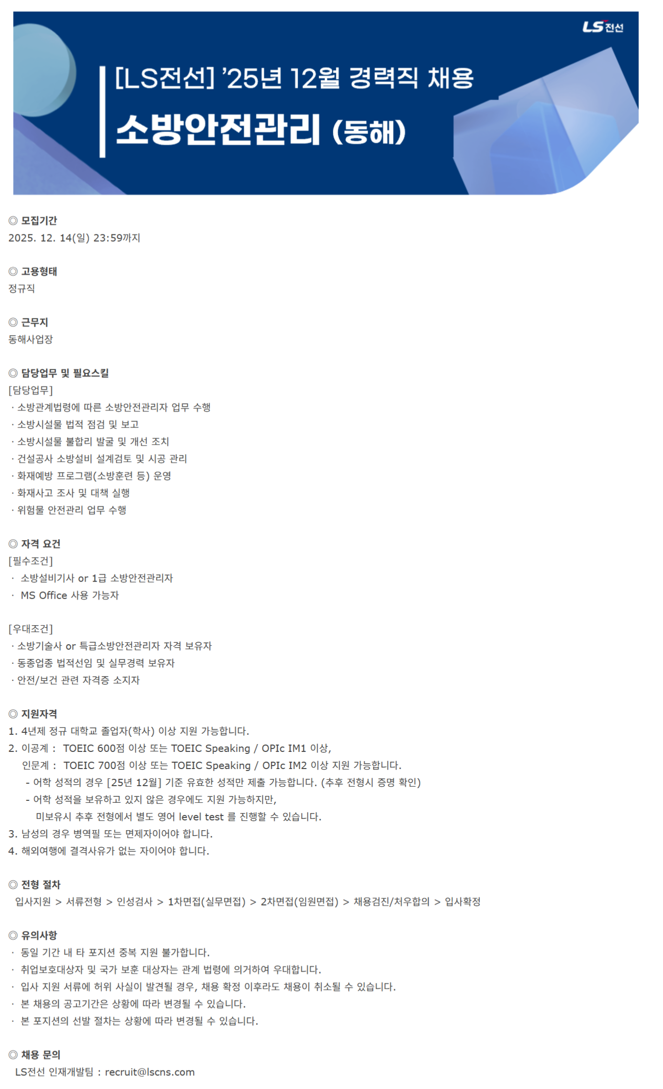 ¸ðÁý°ø°í[LSÀü¼±] ¼Ò¹æ¾ÈÀü°ü¸®(µ¿ÇØ) °æ·Â ä¿ë('25³â 12¿ù)