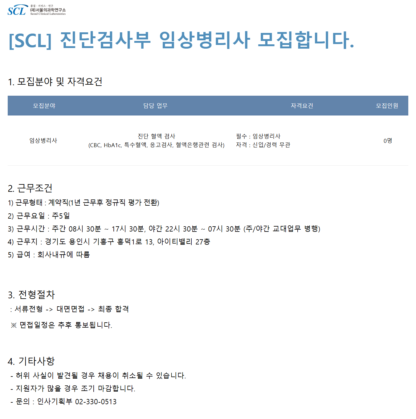 [SCL] Áø´Ü°Ë»çºÎ ÀÓ»óº´¸®»ç ¸ðÁýÇÕ´Ï´Ù.