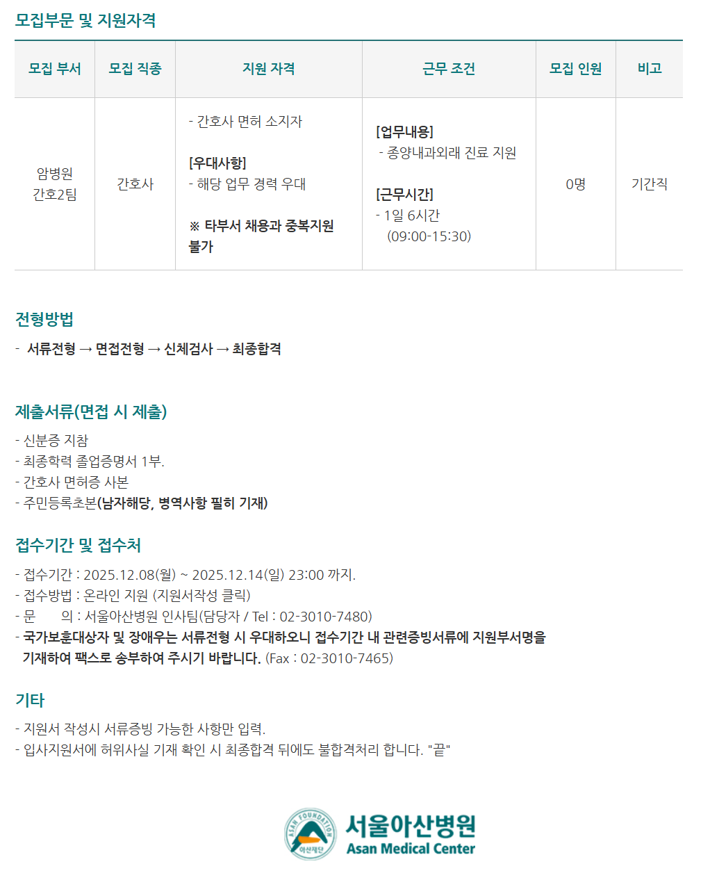 ¸ðÁýºÎ¹® ¹× Áö¿øÀÚ°Ý ¸ðÁý ºÎ¼­ ¸ðÁý Á÷Á¾ Áö¿ø ÀÚ°Ý ±Ù¹« Á¶°Ç ¸ðÁý Àοø ºñ°í ¾Ïº´¿ø °£È£2ÆÀ °£È£»ç - °£È£»ç ¸éÇã ¼ÒÁöÀÚ [¿ì´ë»çÇ×] - ÇØ´ç ¾÷¹« °æ·Â ¿ì´ë ¡Ø ŸºÎ¼­ ä¿ë°ú Áߺ¹Áö¿ø ºÒ°¡ [¾÷¹«³»¿ë] - Á¾¾ç³»°ú¿Ü·¡ Áø·á Áö¿ø [±Ù¹«½Ã°£] - 1ÀÏ 6½Ã°£ (09:00-15:30) 0¸í ±â°£Á÷ ÀüÇü¹æ¹ý - ¼­·ùÀüÇü ¡æ ¸éÁ¢ÀüÇü ¡æ ½Åü°Ë»ç ¡æ ÃÖÁ¾ÇÕ°Ý Á¦Ãâ¼­·ù(¸éÁ¢ ½Ã Á¦Ãâ) - ½ÅºÐÁõ ÁöÂü - ÃÖÁ¾Çз Á¹¾÷Áõ¸í¼­ 1ºÎ. - °£È£»ç ¸éÇãÁõ »çº» - Áֹεî·ÏÃʺ»(³²ÀÚÇØ´ç, º´¿ª»çÇ× ÇÊÈ÷ ±âÀç) Á¢¼ö±â°£ ¹× Á¢¼öó - Á¢¼ö±â°£ : 2025.12.08(¿ù) ~ 2025.12.14(ÀÏ) 23:00 ±îÁö. - Á¢¼ö¹æ¹ý : ¿Â¶óÀÎ Áö¿ø (Áö¿ø¼­ÀÛ¼º Ŭ¸¯) - ¹® ÀÇ : ¼­¿ï¾Æ»êº´¿ø ÀλçÆÀ(´ã´çÀÚ / Tel : ***-****-****) - ±¹°¡º¸ÈÆ´ë»óÀÚ ¹× Àå¾Ö¿ì´Â ¼­·ùÀüÇü ½Ã ¿ì´ëÇÏ¿À´Ï Á¢¼ö±â°£ ³» °ü·ÃÁõºù¼­·ù¿¡ Áö¿øºÎ¼­¸íÀ» ±âÀçÇÏ¿© ÆÑ½º·Î ¼ÛºÎÇÏ¿© Áֽñ⠹ٶø´Ï´Ù. (Fax : ***-****-****) ±âŸ - Áö¿ø¼­ ÀÛ¼º½Ã ¼­·ùÁõºù °¡´ÉÇÑ »çÇ׸¸ ÀÔ·Â. - ÀÔ»çÁö¿ø¼­¿¡ ÇãÀ§»ç½Ç ±âÀç È®ÀÎ ½Ã ÃÖÁ¾ÇÕ°Ý µÚ¿¡µµ ºÒÇÕ°Ýó¸® ÇÕ´Ï´Ù. "³¡"