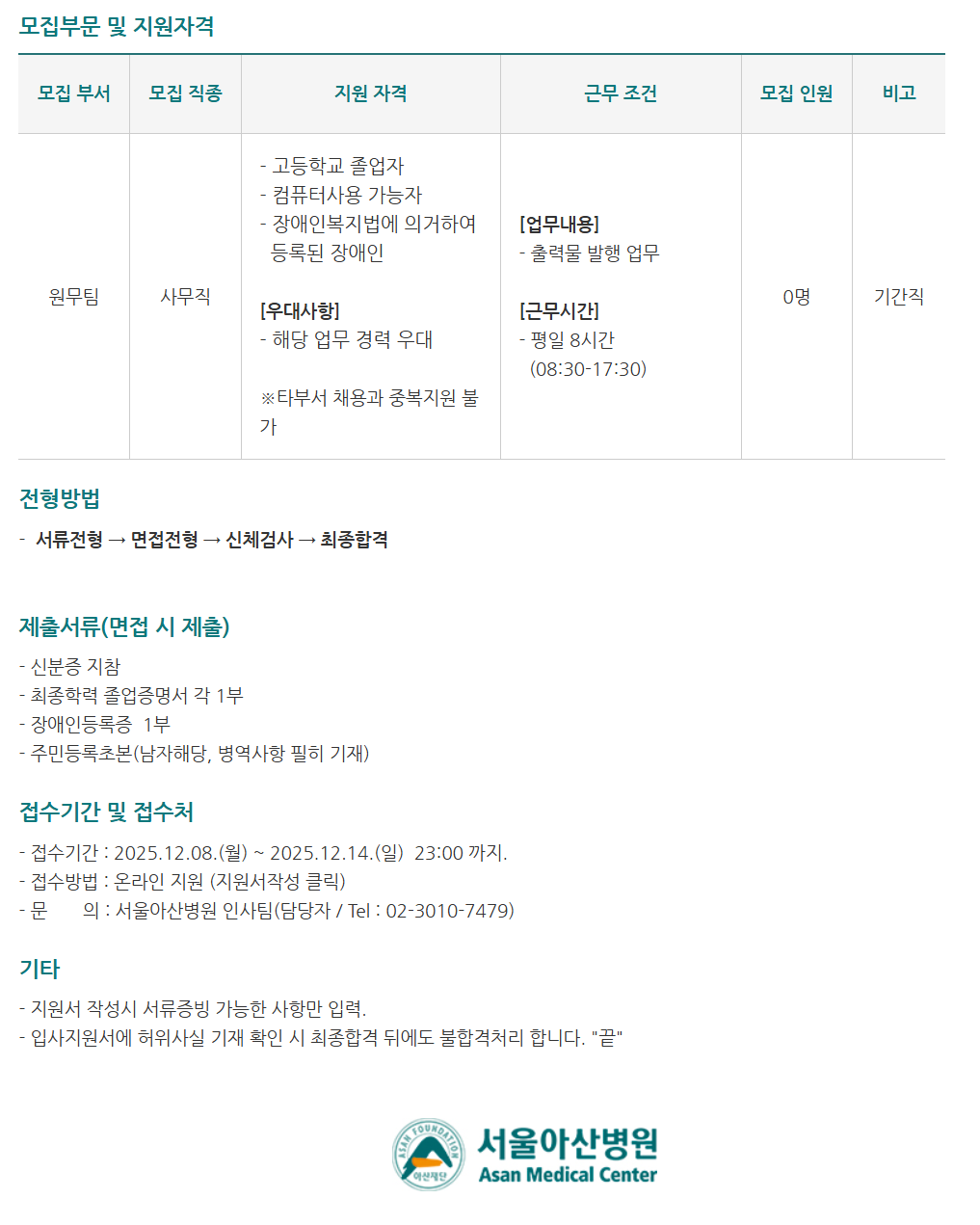 ¸ðÁýºÎ¹® ¹× Áö¿øÀÚ°Ý ¸ðÁý ºÎ¼­ ¸ðÁý Á÷Á¾ Áö¿ø ÀÚ°Ý ±Ù¹« Á¶°Ç ¸ðÁý Àοø ºñ°í ¿ø¹«ÆÀ »ç¹«Á÷ - °íµîÇб³ Á¹¾÷ÀÚ - ÄÄÇ»ÅÍ»ç¿ë °¡´ÉÀÚ - Àå¾ÖÀκ¹Áö¹ý¿¡ ÀǰÅÇÏ¿© µî·ÏµÈ Àå¾ÖÀÎ [¿ì´ë»çÇ×] - ÇØ´ç ¾÷¹« °æ·Â ¿ì´ë ¡ØÅ¸ºÎ¼­ ä¿ë°ú Áߺ¹Áö¿ø ºÒ°¡ [¾÷¹«³»¿ë] - Ãâ·Â¹° ¹ßÇà ¾÷¹« [±Ù¹«½Ã°£] - ÆòÀÏ 8½Ã°£ (08:30-17:30) 0¸í ±â°£Á÷ ÀüÇü¹æ¹ý - ¼­·ùÀüÇü ¡æ ¸éÁ¢ÀüÇü ¡æ ½Åü°Ë»ç ¡æ ÃÖÁ¾ÇÕ°Ý Á¦Ãâ¼­·ù(¸éÁ¢ ½Ã Á¦Ãâ) - ½ÅºÐÁõ ÁöÂü - ÃÖÁ¾Çз Á¹¾÷Áõ¸í¼­ °¢ 1ºÎ - Àå¾ÖÀεî·ÏÁõ 1ºÎ - Áֹεî·ÏÃʺ»(³²ÀÚÇØ´ç, º´¿ª»çÇ× ÇÊÈ÷ ±âÀç) Á¢¼ö±â°£ ¹× Á¢¼öó - Á¢¼ö±â°£ : 2025.12.08.(¿ù) ~ 2025.12.14.(ÀÏ) 23:00 ±îÁö. - Á¢¼ö¹æ¹ý : ¿Â¶óÀÎ Áö¿ø (Áö¿ø¼­ÀÛ¼º Ŭ¸¯) - ¹® ÀÇ : ¼­¿ï¾Æ»êº´¿ø ÀλçÆÀ(´ã´çÀÚ / Tel : ***-****-****) ±âŸ - Áö¿ø¼­ ÀÛ¼º½Ã ¼­·ùÁõºù °¡´ÉÇÑ »çÇ׸¸ ÀÔ·Â. - ÀÔ»çÁö¿ø¼­¿¡ ÇãÀ§»ç½Ç ±âÀç È®ÀÎ ½Ã ÃÖÁ¾ÇÕ°Ý µÚ¿¡µµ ºÒÇÕ°Ýó¸® ÇÕ´Ï´Ù. "³¡"