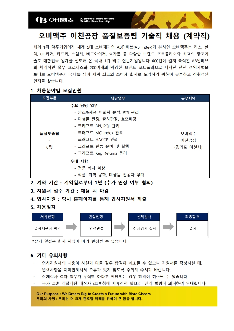 [ABInbev Korea ¿Àºñ¸ÆÁÖ] ÀÌõ°øÀå ǰÁú°ü¸®ÆÀ ±â¼úÁ÷ ä¿ë(°è¾àÁ÷)