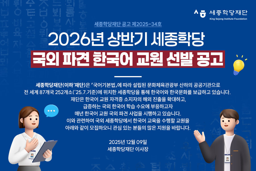 | ¾Æ·¡ »çÇ×µéÀº ¡®¼¼Á¾ÇдçÀç´Ü ±¹¿Ü ÆÄ°ß Çѱ¹¾î ±³¿ø¡¯ ä¿ë, ÆÄ°ß Ȱµ¿ °ü·ÃÇÏ¿© »çÀü¿¡ ¹Ýµå½Ã ¼÷ÁöÇØ¾ß ÇÒ »çÇ×, Áö¿øÀÚ°¡ »çÀü¿¡ °í·ÁÇÏ¿© Áö¿øÇØ¾ß ÇÒ »çÇ×À» Á¤¸®ÇØ µÐ °ÍÀ̹ǷÎ, Áö¿øÀÚ´Â °¢ Ç׸ñ¿¡ ´ëÇØ ÃæºÐÈ÷ °í·ÁÇÏ¿© Áö¿øÇØ¾ß ÇÔ. |