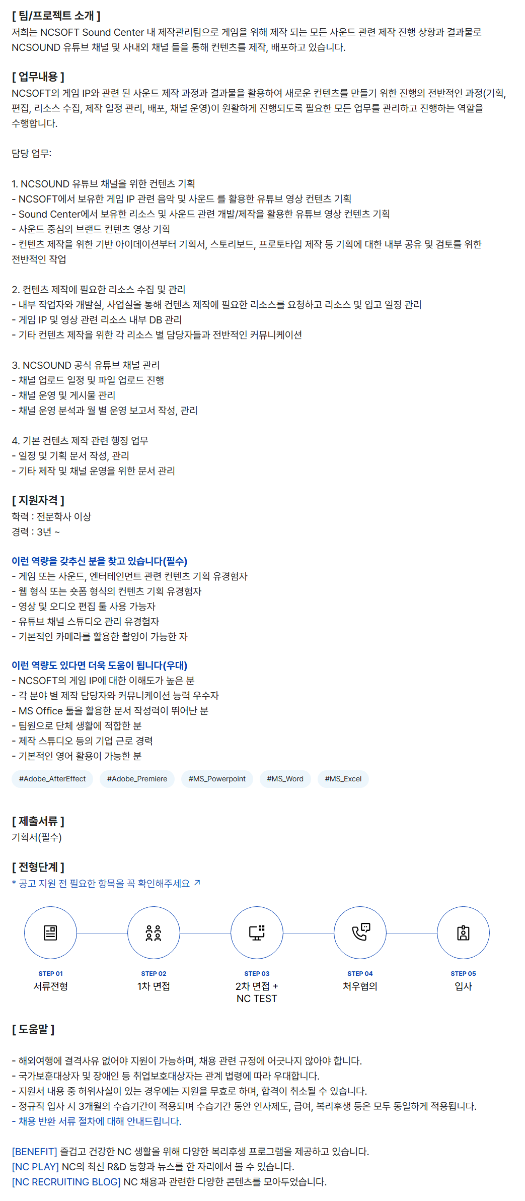 NCSOFTÀÇ °ÔÀÓ IP¿Í °ü·Ã µÈ »ç¿îµå Á¦ÀÛ °úÁ¤°ú °á°ú¹°À» Ȱ¿ëÇÏ¿© »õ·Î¿î ÄÁÅÙÃ÷¸¦ ¸¸µé±â À§ÇÑ ÁøÇàÀÇ Àü¹ÝÀûÀÎ °úÁ¤(±âȹ, ÆíÁý, ¸®¼Ò½º ¼öÁý, Á¦ÀÛ ÀÏÁ¤ °ü¸®, ¹èÆ÷, ä³Î ¿î¿µ)ÀÌ ¿øÈ°ÇÏ°Ô ÁøÇàµÇµµ·Ï ÇÊ¿äÇÑ ¸ðµç ¾÷¹«¸¦ °ü¸®Çϰí ÁøÇàÇÏ´Â ¿ªÇÒÀ» ¼öÇàÇÕ´Ï´Ù.
