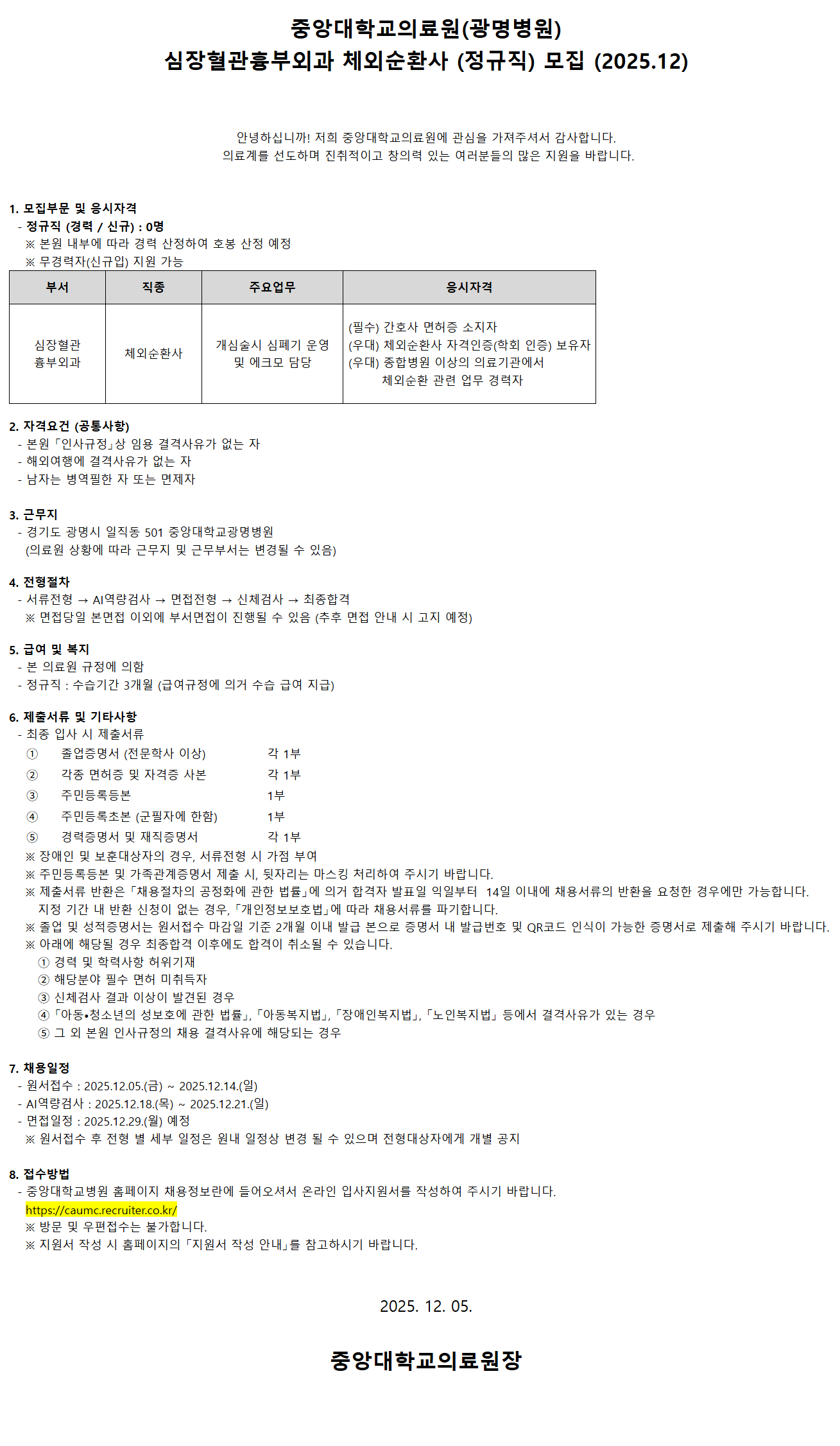 Áß¾Ó´ëÇб³ÀÇ·á¿ø(±¤¸íº´¿ø) ½ÉÀåÇ÷°üÈäºÎ¿Ü°ú ü¿Ü¼øÈ¯»ç (Á¤±ÔÁ÷) ¸ðÁý (2025.12) ¾È³çÇϽʴϱî! ÀúÈñ Áß¾Ó´ëÇб³ÀÇ·á¿ø¿¡ °ü½ÉÀ» °¡Á®Áּż­ °¨»çÇÕ´Ï´Ù. ÀÇ·á°è¸¦ ¼±µµÇϸç ÁøÃëÀûÀ̰í âÀÇ·Â ÀÖ´Â ¿©·¯ºÐµéÀÇ ¸¹Àº Áö¿øÀ» ¹Ù¶ø´Ï´Ù. 1. ¸ðÁýºÎ¹® ¹× ÀÀ½ÃÀÚ°Ý - Á¤±ÔÁ÷ (°æ·Â / ½Å±Ô) : 0¸í ¡Ø º»¿ø ³»ºÎ¿¡ µû¶ó °æ·Â »êÁ¤ÇÏ¿© È£ºÀ »êÁ¤ ¿¹Á¤ ¡Ø ¹«°æ·ÂÀÚ(½Å±ÔÀÔ) Áö¿ø °¡´É ºÎ¼­ Á÷Á¾ ÁÖ¿ä¾÷¹« ÀÀ½ÃÀÚ°Ý ½ÉÀåÇ÷°ü ÈäºÎ¿Ü°ú ü¿Ü¼øÈ¯»ç °³½É¼ú½Ã ½ÉÆó±â ¿î¿µ ¹× ¿¡Å©¸ð ´ã´ç (Çʼö) °£È£»ç ¸éÇãÁõ ¼ÒÁöÀÚ (¿ì´ë) ü¿Ü¼øÈ¯»ç ÀÚ°ÝÀÎÁõ(ÇÐȸ ÀÎÁõ) º¸À¯ÀÚ (¿ì´ë) Á¾ÇÕº´¿ø ÀÌ»óÀÇ ÀÇ·á±â°ü¿¡¼­ ü¿Ü¼øÈ¯ °ü·Ã ¾÷¹« °æ·ÂÀÚ 2. ÀÚ°Ý¿ä°Ç (°øÅë»çÇ×) - º»¿ø ¡¸Àλç±ÔÁ¤¡¹»ó ÀÓ¿ë °á°Ý»çÀ¯°¡ ¾ø´Â ÀÚ - ÇØ¿Ü¿©Çà¿¡ °á°Ý»çÀ¯°¡ ¾ø´Â ÀÚ - ³²ÀÚ´Â º´¿ªÇÊÇÑ ÀÚ ¶Ç´Â ¸éÁ¦ÀÚ 3. ±Ù¹«Áö - °æ±âµµ ±¤¸í½Ã ÀÏÁ÷µ¿ 501 Áß¾Ó´ëÇб³±¤¸íº´¿ø (ÀÇ·á¿ø »óȲ¿¡ µû¶ó ±Ù¹«Áö ¹× ±Ù¹«ºÎ¼­´Â º¯°æµÉ ¼ö ÀÖÀ½) 4. ÀüÇüÀýÂ÷ - ¼­·ùÀüÇü ¡æ AI¿ª·®°Ë»ç ¡æ ¸éÁ¢ÀüÇü ¡æ ½Åü°Ë»ç ¡æ ÃÖÁ¾ÇÕ°Ý ¡Ø ¸éÁ¢´çÀÏ º»¸éÁ¢ À̿ܿ¡ ºÎ¼­¸éÁ¢ÀÌ ÁøÇàµÉ ¼ö ÀÖÀ½ (ÃßÈÄ ¸éÁ¢ ¾È³» ½Ã °íÁö ¿¹Á¤) 5. ±Þ¿© ¹× º¹Áö - º» ÀÇ·á¿ø ±ÔÁ¤¿¡ ÀÇÇÔ - Á¤±ÔÁ÷ : ¼ö½À±â°£ 3°³¿ù (±Þ¿©±ÔÁ¤¿¡ Àǰмö½À ±Þ¿© Áö±Þ) 6. Á¦Ãâ¼­·ù ¹× ±âŸ»çÇ× - ÃÖÁ¾ ÀÔ»ç ½Ã Á¦Ãâ¼­·ù ➀ Á¹¾÷Áõ¸í¼­ (Àü¹®Çлç ÀÌ»ó) °¢ 1ºÎ ➁ °¢Á¾ ¸éÇãÁõ ¹× ÀÚ°ÝÁõ »çº» °¢ 1ºÎ ➂ Áֹεî·Ïµîº» 1ºÎ ➃ Áֹεî·ÏÃʺ» (±ºÇÊÀÚ¿¡ ÇÑÇÔ) 1ºÎ ➄ °æ·ÂÁõ¸í¼­ ¹× ÀçÁ÷Áõ¸í¼­ °¢ 1ºÎ ¡Ø Àå¾ÖÀÎ ¹× º¸ÈÆ´ë»óÀÚÀÇ °æ¿ì, ¼­·ùÀüÇü ½Ã °¡Á¡ ºÎ¿© ¡Ø Áֹεî·Ïµîº» ¹× °¡Á·°ü°èÁõ¸í¼­ Á¦Ãâ ½Ã, µÞÀÚ¸®´Â ¸¶½ºÅ· ó¸®ÇÏ¿© Áֽñ⠹ٶø´Ï´Ù. ¡Ø Á¦Ãâ¼­·ù ¹ÝȯÀº ¡¸Ã¤¿ëÀýÂ÷ÀÇ °øÁ¤È­¿¡ °üÇÑ ¹ý·ü¡¹¿¡ ÀǰŠÇÕ°ÝÀÚ ¹ßÇ¥ÀÏ ÀÍÀϺÎÅÍ 14ÀÏ À̳»¿¡ ä¿ë¼­·ùÀÇ ¹ÝȯÀ» ¿äûÇÑ °æ¿ì¿¡¸¸ °¡´ÉÇÕ´Ï´Ù. ÁöÁ¤ ±â°£ ³» ¹Ýȯ ½ÅûÀÌ ¾ø´Â °æ¿ì, ¡¸°³ÀÎÁ¤º¸º¸È£¹ý¡¹¿¡ µû¶ó ä¿ë¼­·ù¸¦ ÆÄ±âÇÕ´Ï´Ù. ¡Ø Á¹¾÷ ¹× ¼ºÀûÁõ¸í¼­´Â ¿ø¼­Á¢¼ö ¸¶°¨ÀÏ ±âÁØ 2°³¿ù À̳» ¹ß±Þ º»À¸·Î Áõ¸í¼­ ³» ¹ß±Þ¹øÈ£ ¹× QRÄÚµå ÀνÄÀÌ °¡´ÉÇÑ Áõ¸í¼­·Î Á¦ÃâÇØ Áֽñ⠹ٶø´Ï´Ù. ¡Ø ¾Æ·¡¿¡ ÇØ´çµÉ °æ¿ì ÃÖÁ¾ÇÕ°Ý ÀÌÈÄ¿¡µµ ÇÕ°ÝÀÌ Ãë¼ÒµÉ ¼ö ÀÖ½À´Ï´Ù. ➀ °æ·Â ¹× Çз»çÇ× ÇãÀ§±âÀç ➁ ÇØ´çºÐ¾ß Çʼö ¸éÇã ¹ÌÃëµæÀÚ ➂ ½Åü°Ë»ç °á°ú ÀÌ»óÀÌ ¹ß°ßµÈ °æ¿ì ➃ ¡¸¾Æµ¿•û¼Ò³âÀÇ ¼ºº¸È£¿¡ °üÇÑ ¹ý·ü¡¹, ¡¸¾Æµ¿º¹Áö¹ý¡¹, ¡¸Àå¾ÖÀκ¹Áö¹ý¡¹, ¡¸³ëÀκ¹Áö¹ý¡¹ µî¿¡¼­ °á°Ý»çÀ¯°¡ ÀÖ´Â °æ¿ì ➄ ±× ¿Ü º»¿ø Àλç±ÔÁ¤ÀÇ Ã¤¿ë °á°Ý»çÀ¯¿¡ ÇØ´çµÇ´Â °æ¿ì 7. ä¿ëÀÏÁ¤ - ¿ø¼­Á¢¼ö : 2025.12.05.(±Ý) ~ 2025.12.14.(ÀÏ) - AI¿ª·®°Ë»ç : 2025.12.18.(¸ñ) ~ 2025.12.21.(ÀÏ) - ¸éÁ¢ÀÏÁ¤ : 2025.12.29.(¿ù) ¿¹Á¤ ¡Ø ¿ø¼­Á¢¼ö ÈÄ ÀüÇü º° ¼¼ºÎ ÀÏÁ¤Àº ¿ø³» ÀÏÁ¤»ó º¯°æ µÉ ¼ö ÀÖÀ¸¸ç ÀüÇü´ë»óÀÚ¿¡°Ô °³º° °øÁö 8. Á¢¼ö¹æ¹ý - Áß¾Ó´ëÇб³º´¿ø ȨÆäÀÌÁö ä¿ëÁ¤º¸¶õ¿¡ µé¾î¿À¼Å¼­ ¿Â¶óÀÎ ÀÔ»çÁö¿ø¼­¸¦ ÀÛ¼ºÇÏ¿© Áֽñ⠹ٶø´Ï´Ù. https://caumc.recruiter.co.kr/ ¡Ø ¹æ¹® ¹× ¿ìÆíÁ¢¼ö´Â ºÒ°¡ÇÕ´Ï´Ù. ¡Ø Áö¿ø¼­ ÀÛ¼º ½Ã ȨÆäÀÌÁöÀÇ ¡¸Áö¿ø¼­ ÀÛ¼º ¾È³»¡¹¸¦ Âü°íÇϽñ⠹ٶø´Ï´Ù. 2025. 12. 05. Áß¾Ó´ëÇб³ÀÇ·á¿øÀå