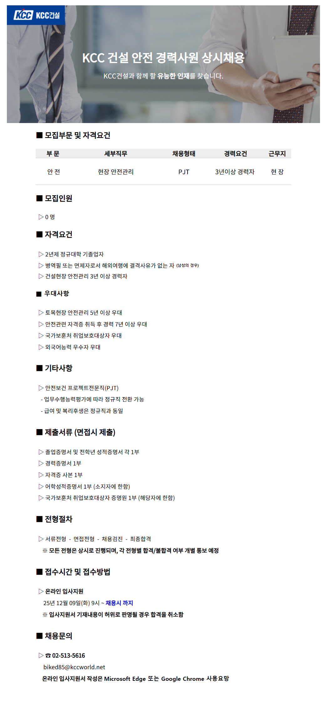 KCC °Ç¼³ ¾ÈÀü °æ·Â»ç¿ø »ó½Ãä¿ë KCC°Ç¼³°ú ÇÔ²² ÇÒ À¯´ÉÇÑ ÀÎÀ縦 ã½À´Ï´Ù. ¡á ¸ðÁýºÎ¹® ¹× ÀÚ°Ý¿ä°Ç ºÎ ¹® ¼¼ºÎÁ÷¹« ä¿ëÇüÅ °æ·Â¿ä°Ç ±Ù¹«Áö ¾È Àü ÇöÀå ¾ÈÀü°ü¸® PJT 3³âÀÌ»ó °æ·ÂÀÚ Çö Àå ¡á ¸ðÁýÀοø ¢¹ 0 ¸í