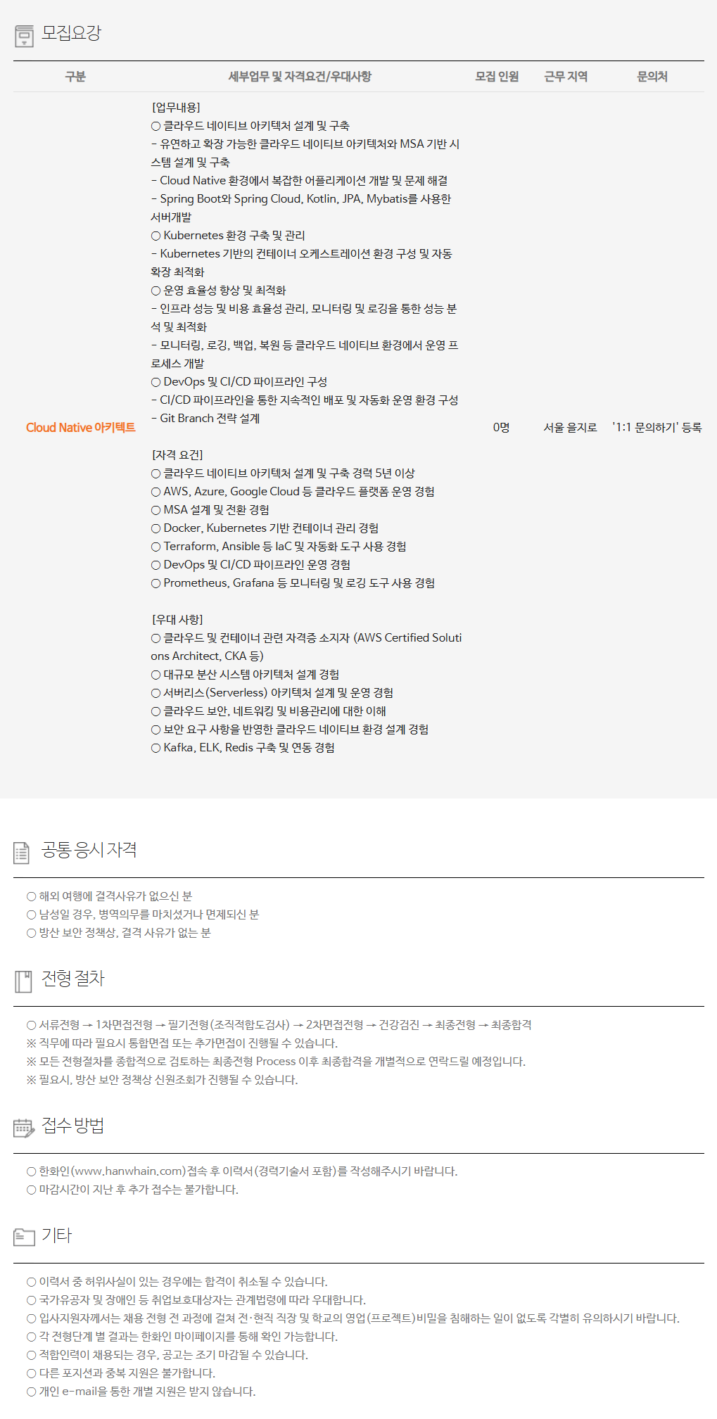 ±¸ºÐ ¼¼ºÎ¾÷¹« ¹× ÀÚ°Ý¿ä°Ç/¿ì´ë»çÇ× ¸ðÁý Àοø ±Ù¹« Áö¿ª ¹®ÀÇó Cloud Native ¾ÆÅ°ÅØÆ® [¾÷¹«³»¿ë] ¡Û Ŭ¶ó¿ìµå ³×ÀÌÆ¼ºê ¾ÆÅ°ÅØÃ³ ¼³°è ¹× ±¸Ãà - À¯¿¬Çϰí È®Àå °¡´ÉÇÑ Å¬¶ó¿ìµå ³×ÀÌÆ¼ºê ¾ÆÅ°ÅØÃ³¿Í MSA ±â¹Ý ½Ã½ºÅÛ ¼³°è ¹× ±¸Ãà - Cloud Native ȯ°æ¿¡¼­ º¹ÀâÇÑ ¾îÇø®ÄÉÀÌ¼Ç °³¹ß ¹× ¹®Á¦ ÇØ°á - Spring Boot¿Í Spring Cloud, Kotlin, JPA, Mybatis¸¦ »ç¿ëÇÑ ¼­¹ö°³¹ß ¡Û Kubernetes ȯ°æ ±¸Ãà ¹× °ü¸® - Kubernetes ±â¹ÝÀÇ ÄÁÅ×ÀÌ³Ê ¿ÀÄɽºÆ®·¹ÀÌ¼Ç È¯°æ ±¸¼º ¹× ÀÚµ¿ È®Àå ÃÖÀûÈ­ ¡Û ¿î¿µ È¿À²¼º Çâ»ó ¹× ÃÖÀûÈ­ - ÀÎÇÁ¶ó ¼º´É ¹× ºñ¿ë È¿À²¼º °ü¸®, ¸ð´ÏÅ͸µ ¹× ·Î±ëÀ» ÅëÇÑ ¼º´É ºÐ¼® ¹× ÃÖÀûÈ­ - ¸ð´ÏÅ͸µ, ·Î±ë, ¹é¾÷, º¹¿ø µî Ŭ¶ó¿ìµå ³×ÀÌÆ¼ºê ȯ°æ¿¡¼­ ¿î¿µ ÇÁ·Î¼¼½º °³¹ß ¡Û DevOps ¹× CI/CD ÆÄÀÌÇÁ¶óÀÎ ±¸¼º - CI/CD ÆÄÀÌÇÁ¶óÀÎÀ» ÅëÇÑ Áö¼ÓÀûÀÎ ¹èÆ÷ ¹× ÀÚµ¿È­ ¿î¿µ ȯ°æ ±¸¼º - Git Branch Àü·« ¼³°è [ÀÚ°Ý ¿ä°Ç] ¡Û Ŭ¶ó¿ìµå ³×ÀÌÆ¼ºê ¾ÆÅ°ÅØÃ³ ¼³°è ¹× ±¸Ãà °æ·Â 5³â ÀÌ»ó ¡Û AWS, Azure, Google Cloud µî Ŭ¶ó¿ìµå Ç÷§Æû ¿î¿µ °æÇè ¡Û MSA ¼³°è ¹× Àüȯ °æÇè ¡Û Docker, Kubernetes ±â¹Ý ÄÁÅ×ÀÌ³Ê °ü¸® °æÇè ¡Û Terraform, Ansible µî IaC ¹× ÀÚµ¿È­ µµ±¸ »ç¿ë °æÇè ¡Û DevOps ¹× CI/CD ÆÄÀÌÇÁ¶óÀÎ ¿î¿µ °æÇè ¡Û Prometheus, Grafana µî ¸ð´ÏÅ͸µ ¹× ·Î±ë µµ±¸ »ç¿ë °æÇè [¿ì´ë »çÇ×] ¡Û Ŭ¶ó¿ìµå ¹× ÄÁÅ×ÀÌ³Ê °ü·Ã ÀÚ°ÝÁõ ¼ÒÁöÀÚ (AWS Certified Solutions Architect, CKA µî) ¡Û ´ë±Ô¸ð ºÐ»ê ½Ã½ºÅÛ ¾ÆÅ°ÅØÃ³ ¼³°è °æÇè ¡Û ¼­¹ö¸®½º(Serverless) ¾ÆÅ°ÅØÃ³ ¼³°è ¹× ¿î¿µ °æÇè ¡Û Å¬¶ó¿ìµå º¸¾È, ³×Æ®¿öÅ· ¹× ºñ¿ë°ü¸®¿¡ ´ëÇÑ ÀÌÇØ ¡Û º¸¾È ¿ä±¸ »çÇ×À» ¹Ý¿µÇÑ Å¬¶ó¿ìµå ³×ÀÌÆ¼ºê ȯ°æ ¼³°è °æÇè ¡Û Kafka, ELK, Redis ±¸Ãà ¹× ¿¬µ¿ °æÇè 0¸í ¼­¿ï À»Áö·Î '1:1 ¹®ÀÇÇϱâ' µî·Ï