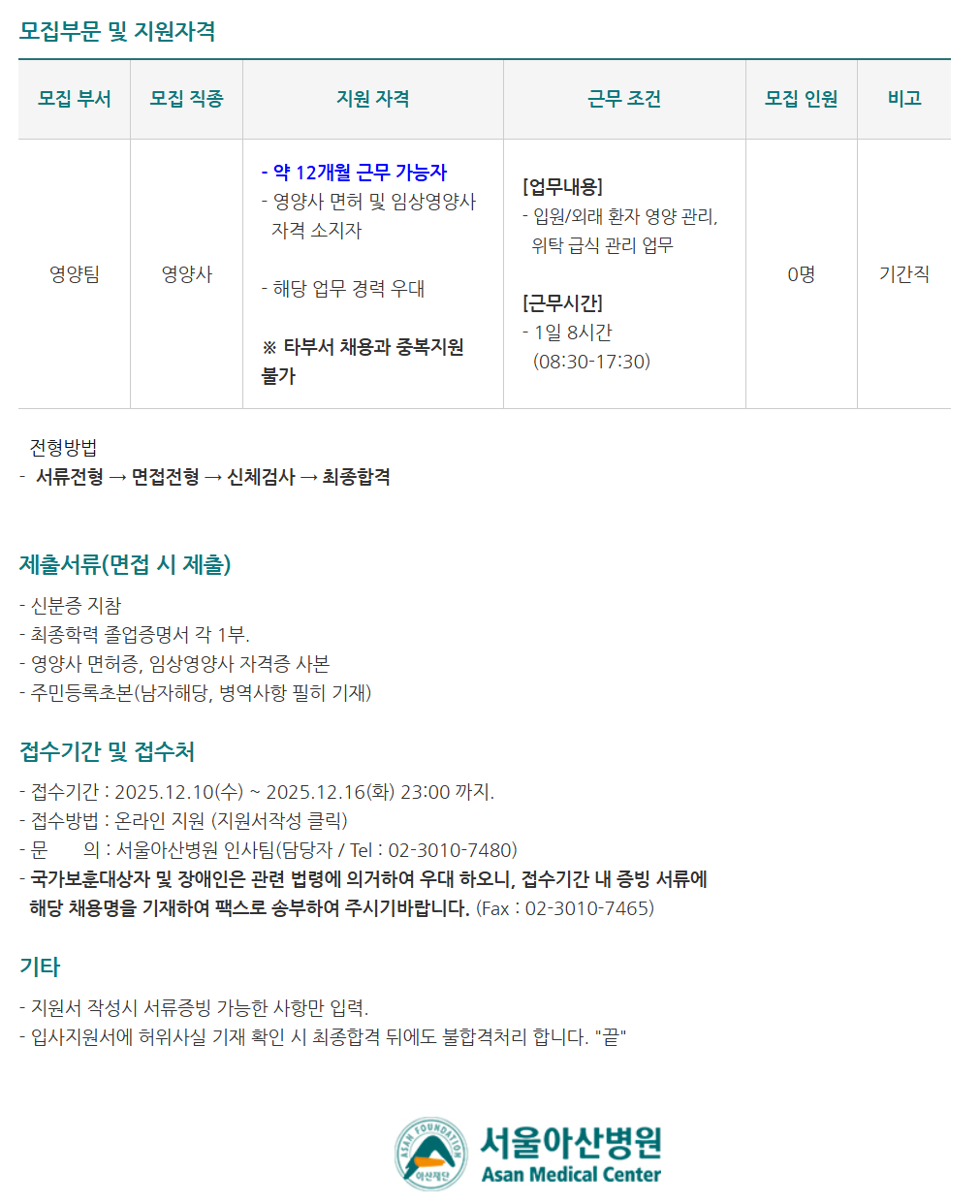 ¸ðÁýºÎ¹® ¹× Áö¿øÀÚ°Ý ¸ðÁý ºÎ¼­ ¸ðÁý Á÷Á¾ Áö¿ø ÀÚ°Ý ±Ù¹« Á¶°Ç ¸ðÁý Àοø ºñ°í ¿µ¾çÆÀ ¿µ¾ç»ç - ¾à 12°³¿ù ±Ù¹« °¡´ÉÀÚ - ¿µ¾ç»ç ¸éÇã ¹× ÀÓ»ó¿µ¾ç»ç ÀÚ°Ý ¼ÒÁöÀÚ - ÇØ´ç ¾÷¹« °æ·Â ¿ì´ë ¡Ø ŸºÎ¼­ ä¿ë°ú Áߺ¹Áö¿ø ºÒ°¡ [¾÷¹«³»¿ë] - ÀÔ¿ø/¿Ü·¡ ȯÀÚ ¿µ¾ç °ü¸®, À§Å¹ ±Þ½Ä °ü¸® ¾÷¹« [±Ù¹«½Ã°£] - 1ÀÏ 8½Ã°£ (08:30-17:30) 0¸í ±â°£Á÷ ÀüÇü¹æ¹ý - ¼­·ùÀüÇü ¡æ ¸éÁ¢ÀüÇü ¡æ ½Åü°Ë»ç ¡æ ÃÖÁ¾ÇÕ°Ý Á¦Ãâ¼­·ù(¸éÁ¢ ½Ã Á¦Ãâ) - ½ÅºÐÁõ ÁöÂü - ÃÖÁ¾Çз Á¹¾÷Áõ¸í¼­ °¢ 1ºÎ. - ¿µ¾ç»ç ¸éÇãÁõ, ÀÓ»ó¿µ¾ç»ç ÀÚ°ÝÁõ »çº» - Áֹεî·ÏÃʺ»(³²ÀÚÇØ´ç, º´¿ª»çÇ× ÇÊÈ÷ ±âÀç) Á¢¼ö±â°£ ¹× Á¢¼öó - Á¢¼ö±â°£ : 2025.12.10(¼ö) ~ 2025.12.16(È­) 23:00 ±îÁö. - Á¢¼ö¹æ¹ý : ¿Â¶óÀÎ Áö¿ø (Áö¿ø¼­ÀÛ¼º Ŭ¸¯) - ¹® ÀÇ : ¼­¿ï¾Æ»êº´¿ø ÀλçÆÀ(´ã´çÀÚ / Tel : ***-****-****) - ±¹°¡º¸ÈÆ´ë»óÀÚ ¹× Àå¾ÖÀÎÀº °ü·Ã ¹ý·É¿¡ ÀǰÅÇÏ¿© ¿ì´ë ÇÏ¿À´Ï, Á¢¼ö±â°£ ³» Áõºù ¼­·ù¿¡ ÇØ´ç ä¿ë¸íÀ» ±âÀçÇÏ¿© ÆÑ½º·Î ¼ÛºÎÇÏ¿© Áֽñâ¹Ù¶ø´Ï´Ù. (Fax : ***-****-****) ±âŸ - Áö¿ø¼­ ÀÛ¼º½Ã ¼­·ùÁõºù °¡´ÉÇÑ »çÇ׸¸ ÀÔ·Â. - ÀÔ»çÁö¿ø¼­¿¡ ÇãÀ§»ç½Ç ±âÀç È®ÀÎ ½Ã ÃÖÁ¾ÇÕ°Ý µÚ¿¡µµ ºÒÇÕ°Ýó¸® ÇÕ´Ï´Ù. "³¡"