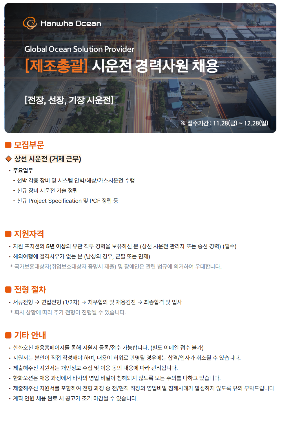 ¡á ¸ðÁýºÎ¹® 🔸 ​»ó¼± ​½Ã¿îÀü ​(°ÅÁ¦ ±Ù¹«) ÁÖ¿ä¾÷¹« - ​¼±¹Ú °¢Á¾ Àåºñ ¹× ​½Ã½ºÅÛ ​¾Èº®/ÇØ»ó/°¡½º½Ã¿îÀü ¼öÇà - ​½Å±Ô Àåºñ ½Ã¿îÀü ​±â¼ú Á¤¸³ - ​½Å±Ô ​Project Specification ​¹× ​PCF ​Á¤¸³ µî ¡á Áö¿øÀÚ°Ý Áö¿ø ​Æ÷Áö¼ÇÀÇ ​5³â ÀÌ»óÀÇ À¯°ü ​Á÷¹« ​°æ·ÂÀ» ​º¸À¯ÇϽŠºÐ (»ó¼± ​½Ã¿îÀü °ü¸®ÀÚ ​¶Ç´Â ​½Â¼± °æ·Â) ​(Çʼö) ÇØ¿Ü¿©Çà¿¡ °á°Ý»çÀ¯°¡ ​¾ø´Â ​ºÐ (³²¼ºÀÇ °æ¿ì, ​±ºÇÊ ¶Ç´Â ​¸éÁ¦) * ±¹°¡º¸ÈÆ´ë»óÀÚ(Ãë¾÷º¸È£´ë»óÀÚ Áõ¸í¼­ Á¦Ãâ) ¹× Àå¾ÖÀÎÀº °ü·Ã ¹ý±Ô¿¡ ÀǰÅÇÏ¿© ¿ì´ëÇÕ´Ï´Ù. ¡á ÀüÇü ÀýÂ÷ ¼­·ùÀüÇü ¡æ ¸éÁ¢ÀüÇü (1/2Â÷) ¡æ ó¿ìÇùÀÇ ¹× ä¿ë°ËÁø ¡æ ÃÖÁ¾ÇÕ°Ý ¹× ÀÔ»ç * ȸ»ç »óȲ¿¡ µû¶ó Ãß°¡ ÀüÇüÀÌ ÁøÇàµÉ ¼ö ÀÖ½À´Ï´Ù. ¡á ±âŸ ¾È³» ÇÑÈ­¿À¼Ç ä¿ëȨÆäÀÌÁö¸¦ ÅëÇØ Áö¿ø¼­ µî·Ï/Á¢¼ö °¡´ÉÇÕ´Ï´Ù. (º°µµ À̸ÞÀÏ Á¢¼ö ºÒ°¡) Áö¿ø¼­´Â º»ÀÎÀÌ Á÷Á¢ ÀÛ¼ºÇØ¾ß Çϸç, ³»¿ëÀÌ ÇãÀ§·Î ÆÇ¸íµÉ °æ¿ì¿¡´Â ÇÕ°Ý/ÀԻ簡 Ãë¼ÒµÉ ¼ö ÀÖ½À´Ï´Ù. Á¦ÃâÇØÁֽŠÁö¿ø¼­´Â °³ÀÎÁ¤º¸ ¼öÁý ¹× ÀÌ¿ë µ¿ÀÇ ³»¿ë¿¡ µû¶ó °ü¸®µË´Ï´Ù. ÇÑÈ­¿À¼ÇÀº ä¿ë °úÁ¤¿¡¼­ Ÿ»çÀÇ ¿µ¾÷ ºñ¹ÐÀÌ Ä§ÇØµÇÁö ¾Êµµ·Ï ¸ðµç ÁÖÀǸ¦ ´ÙÇϰí ÀÖ½À´Ï´Ù. Á¦ÃâÇØÁֽŠÁö¿ø¼­¸¦ Æ÷ÇÔÇÏ¿© ÀüÇü °úÁ¤ Áß Àü/ÇöÁ÷ Á÷ÀåÀÇ ¿µ¾÷ºñ¹Ð Ä§ÇØ»ç·Ê°¡ ¹ß»ýÇÏÁö ¾Êµµ·Ï À¯ÀÇ ºÎʵ右´Ï´Ù. °èȹ Àοø ä¿ë ¿Ï·á ½Ã °ø°í°¡ Á¶±â ¸¶°¨µÉ ¼ö ÀÖ½À´Ï´Ù.