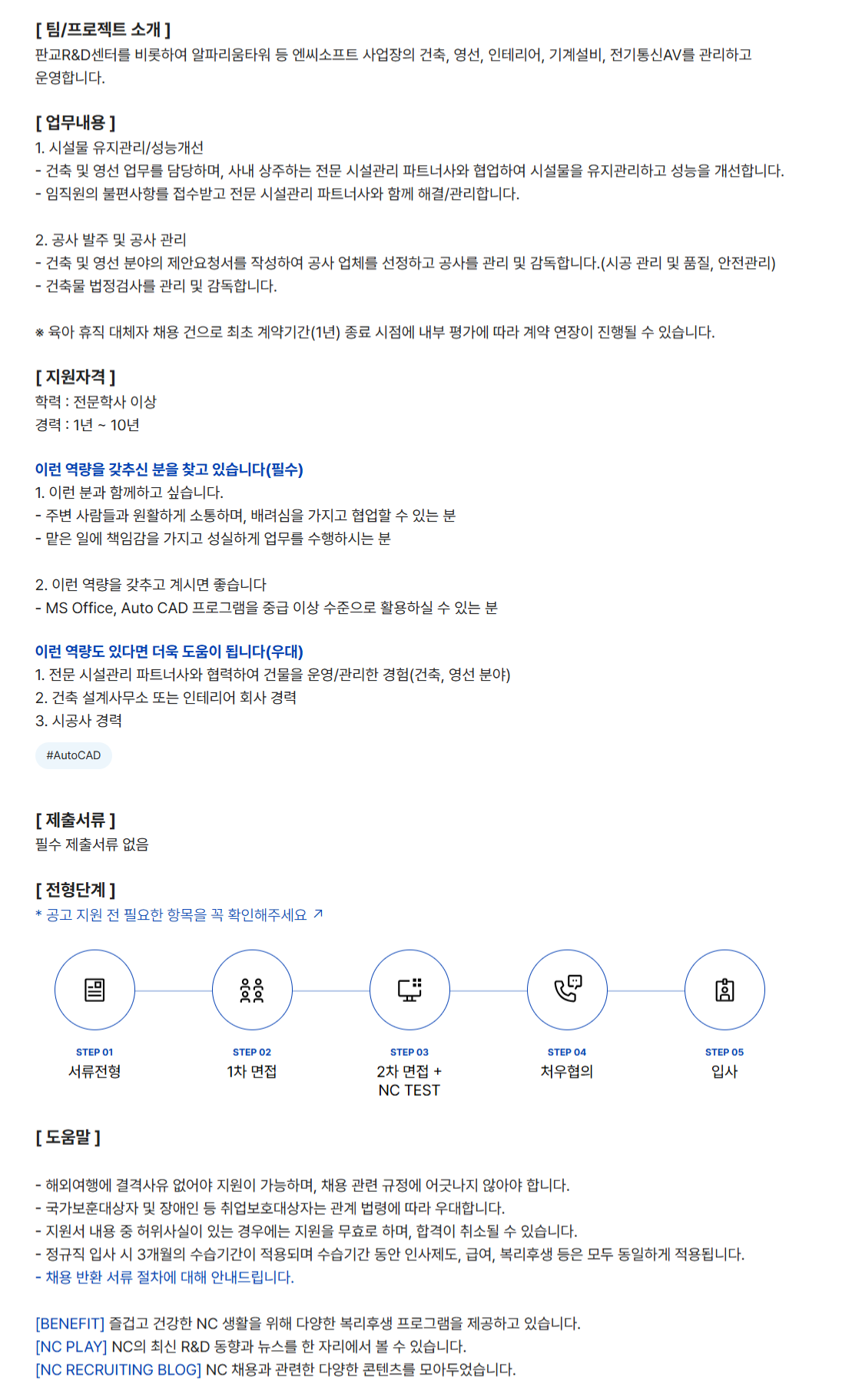 [ ÆÀ/ÇÁ·ÎÁ§Æ® ¼Ò°³ ] ÆÇ±³R&D¼¾Å͸¦ ºñ·ÔÇÏ¿© ¾ËÆÄ¸®¿òŸ¿ö µî ¿£¾¾¼ÒÇÁÆ® »ç¾÷ÀåÀÇ °ÇÃà, ¿µ¼±, ÀÎÅ׸®¾î, ±â°è¼³ºñ, Àü±âÅë½ÅAV¸¦ °ü¸®ÇÏ°í ¿î¿µÇÕ´Ï´Ù. [ ¾÷¹«³»¿ë ] 1. ½Ã¼³¹° À¯Áö°ü¸®/¼º´É°³¼± - °ÇÃà ¹× ¿µ¼± ¾÷¹«¸¦ ´ã´çÇϸç, »ç³» »óÁÖÇÏ´Â Àü¹® ½Ã¼³°ü¸® ÆÄÆ®³Ê»ç¿Í Çù¾÷ÇÏ¿© ½Ã¼³¹°À» À¯Áö°ü¸®ÇÏ°í ¼º´ÉÀ» °³¼±ÇÕ´Ï´Ù. - ÀÓÁ÷¿øÀÇ ºÒÆí»çÇ׸¦ Á¢¼ö¹Þ°í Àü¹® ½Ã¼³°ü¸® ÆÄÆ®³Ê»ç¿Í ÇÔ²² ÇØ°á/°ü¸®ÇÕ´Ï´Ù. 2. °ø»ç ¹ßÁÖ ¹× °ø»ç °ü¸® - °ÇÃà ¹× ¿µ¼± ºÐ¾ßÀÇ Á¦¾È¿äû¼­¸¦ ÀÛ¼ºÇÏ¿© °ø»ç ¾÷ü¸¦ ¼±Á¤ÇÏ°í °ø»ç¸¦ °ü¸® ¹× °¨µ¶ÇÕ´Ï´Ù.(½Ã°ø °ü¸® ¹× ǰÁú, ¾ÈÀü°ü¸®) - °ÇÃ๰ ¹ýÁ¤°Ë»ç¸¦ °ü¸® ¹× °¨µ¶ÇÕ´Ï´Ù. ¡Ø À°¾Æ ÈÞÁ÷ ´ëüÀÚ Ã¤¿ë °ÇÀ¸·Î ÃÖÃÊ °è¾à±â°£(1³â) Á¾·á ½ÃÁ¡¿¡ ³»ºÎ Æò°¡¿¡ µû¶ó °è¾à ¿¬ÀåÀÌ ÁøÇàµÉ ¼ö ÀÖ½À´Ï´Ù. [ Áö¿øÀÚ°Ý ] Çз : Àü¹®Çлç ÀÌ»ó °æ·Â : 1³â ~ 10³â ÀÌ·± ¿ª·®À» °®Ã߽ŠºÐÀ» ã°í ÀÖ½À´Ï´Ù(Çʼö) 1. ÀÌ·± ºÐ°ú ÇÔ²²ÇÏ°í ½Í½À´Ï´Ù. - ÁÖº¯ »ç¶÷µé°ú ¿øÈ°ÇÏ°Ô ¼ÒÅëÇϸç, ¹è·Á½ÉÀ» °¡Áö°í Çù¾÷ÇÒ ¼ö ÀÖ´Â ºÐ - ¸ÃÀº ÀÏ¿¡ Ã¥ÀÓ°¨À» °¡Áö°í ¼º½ÇÇÏ°Ô ¾÷¹«¸¦ ¼öÇàÇϽô ºÐ 2. ÀÌ·± ¿ª·®À» °®Ãß°í °è½Ã¸é ÁÁ½À´Ï´Ù - MS Office, Auto CAD ÇÁ·Î±×·¥À» Áß±Þ ÀÌ»ó ¼öÁØÀ¸·Î Ȱ¿ëÇÏ½Ç ¼ö ÀÖ´Â ºÐ