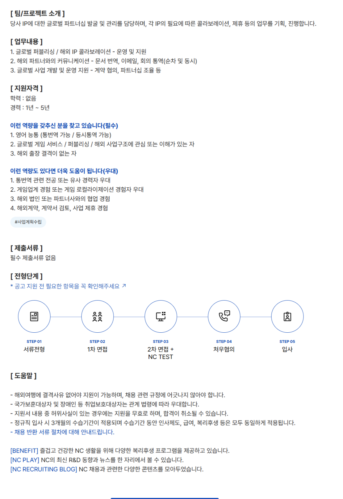 [ ÆÀ/ÇÁ·ÎÁ§Æ® ¼Ò°³ ] ´ç»ç IP¿¡ ´ëÇÑ ±Û·Î¹ú ÆÄÆ®³Ê½Ê ¹ß±¼ ¹× °ü¸®¸¦ ´ã´çÇϸç, °¢ IPÀÇ Çʿ信 µû¸¥ Äݶ󺸷¹À̼Ç, Á¦ÈÞ µîÀÇ ¾÷¹«¸¦ ±âȹ, ÁøÇàÇÕ´Ï´Ù. [ ¾÷¹«³»¿ë ] 1. ±Û·Î¹ú ÆÛºí¸®½Ì / ÇØ¿Ü IP Äݶ󺸷¹ÀÌ¼Ç - ¿î¿µ ¹× Áö¿ø 2. ÇØ¿Ü ÆÄÆ®³Ê¿ÍÀÇ Ä¿¹Â´ÏÄÉÀÌ¼Ç - ¹®¼­ ¹ø¿ª, À̸ÞÀÏ, ȸÀÇ Å뿪(¼øÂ÷ ¹× µ¿½Ã) 3. ±Û·Î¹ú »ç¾÷ °³¹ß ¹× ¿î¿µ Áö¿ø - °è¾à ÇùÀÇ, ÆÄÆ®³Ê½Ê Á¶À² µî [ Áö¿øÀÚ°Ý ] Çз : ¾øÀ½ °æ·Â : 1³â ~ 5³â ÀÌ·± ¿ª·®À» °®Ã߽ŠºÐÀ» ã°í ÀÖ½À´Ï´Ù(Çʼö) 1. ¿µ¾î ´ÉÅë (Åë¹ø¿ª °¡´É / µî½ÃÅ뿪 °¡´É) 2. ±Û·Î¹ú °ÔÀÓ ¼­ºñ½º / ÆÛºí¸®½Ì / ÇØ¿Ü »ç¾÷±¸Á¶¿¡ °ü½É ¶Ç´Â ÀÌÇØ°¡ ÀÖ´Â ÀÚ 3. ÇØ¿Ü ÃâÀå °á°ÝÀÌ ¾ø´Â ÀÚ ÀÌ·± ¿ª·®µµ ÀÖ´Ù¸é ´õ¿í µµ¿òÀÌ µË´Ï´Ù(¿ì´ë) 1. Åë¹ø¿ª °ü·Ã Àü°ø ¶Ç´Â À¯»ç °æ·ÂÀÚ ¿ì´ë 2. °ÔÀÓ¾÷°è °æÇè ¶Ç´Â °ÔÀÓ ·ÎÄöóÀÌÁ¦ÀÌ¼Ç °æÇèÀÚ ¿ì´ë 3. ÇØ¿Ü ¹ýÀÎ ¶Ç´Â ÆÄÆ®³Ê»ç¿ÍÀÇ Çù¾÷ °æÇè 4. ÇØ¿Ü°è¾à, °è¾à¼­ °ËÅä, »ç¾÷ Á¦ÈÞ °æÇè »ç¾÷°èȹ¼ö¸³