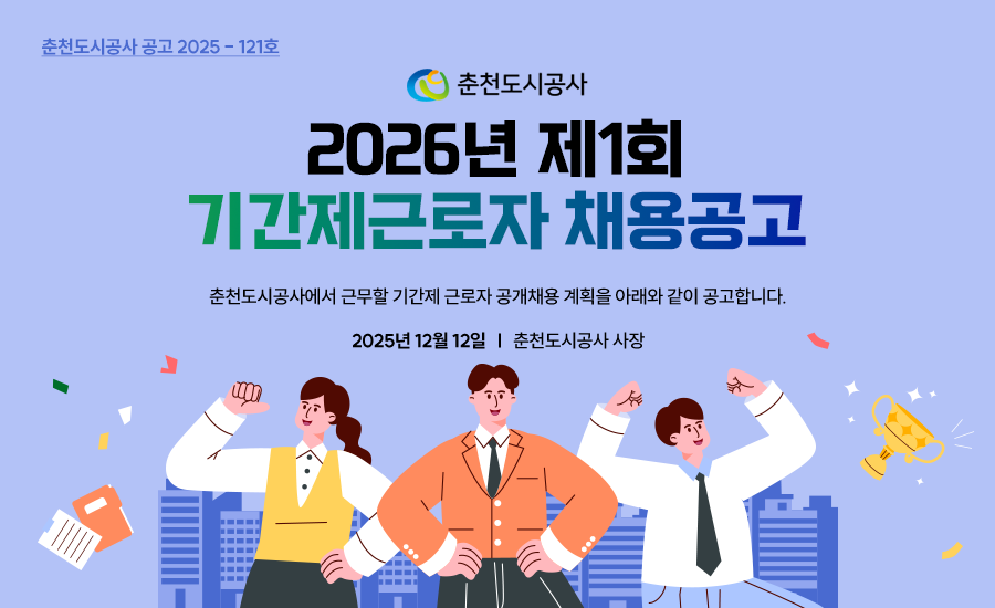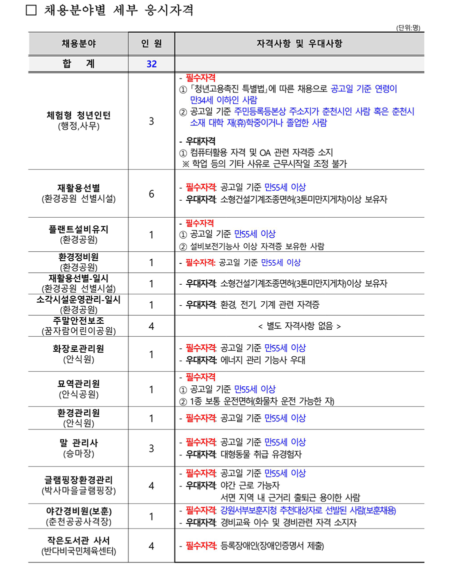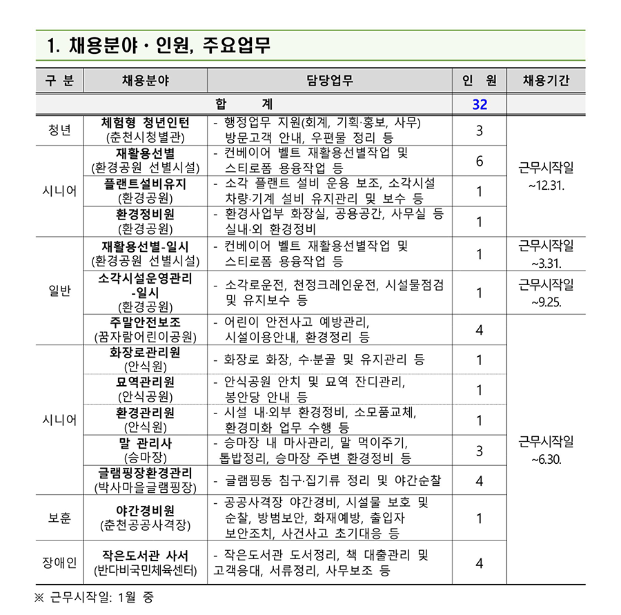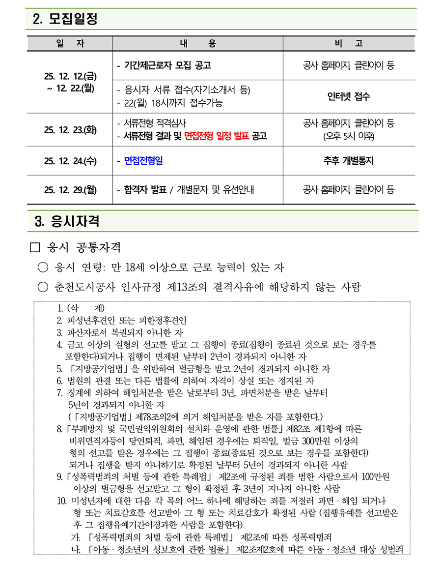 Ãáõµµ½Ã°ø»ç 2026³â Á¦1ȸ ±â°£Á¦±Ù·ÎÀÚ Ã¤¿ë°ø°í Ãáõµµ½Ã°ø»ç¿¡¼­ ±Ù¹«ÇÒ ±â°£Á¦ ±Ù·ÎÀÚ °ø°³Ã¤¿ë °èȹÀ» ¾Æ·¡¿Í °°ÀÌ °ø°íÇÕ´Ï´Ù. 2025³â 12¿ù 12ÀÏ Ãáõµµ½Ã°ø»ç »çÀå 1. ä¿ëºÐ¾ß ¡¤ Àοø, ÁÖ¿ä¾÷¹« ±¸ ºÐ ä¿ëºÐ¾ß ´ã´ç¾÷¹« ÀÎ ¿ø ä¿ë±â°£ ÇÕ °è 32 üÇèÇü û³âÀÎÅÏ - ÇàÁ¤¾÷¹« Áö¿ø(ȸ°è, ±âȹ¡¤È«º¸, »ç¹«) û³â 3 (Ãáõ½Ãûº°°ü) ¹æ¹®°í°´ ¾È³», ¿ìÆí¹° Á¤¸® µî ÀçȰ¿ë¼±º° - ÄÁº£ÀÌ¾î º§Æ® ÀçȰ¿ë¼±º°ÀÛ¾÷ ¹× 6 (ȯ°æ°ø¿ø ¼±º°½Ã¼³) ½ºÆ¼·ÎÆû ¿ëÀ¶ÀÛ¾÷ µî ±Ù¹«½ÃÀÛÀÏ Ç÷£Æ®¼³ºñÀ¯Áö - ¼Ò°¢ Ç÷£Æ® ¼³ºñ ¿î¿ë º¸Á¶, ¼Ò°¢½Ã¼³ ~12.31. ½Ã´Ï¾î 1 (ȯ°æ°ø¿ø) Â÷·®¡¤±â°è ¼³ºñ À¯Áö°ü¸® ¹× º¸¼ö µî ȯ°æÁ¤ºñ¿ø - ȯ°æ»ç¾÷ºÎ È­Àå½Ç, °ø¿ë°ø°£, »ç¹«½Ç µî 1 (ȯ°æ°ø¿ø) ½Ç³»¡¤¿Ü ȯ°æÁ¤ºñ ÀçȰ¿ë¼±º°-ÀϽà - ÄÁº£ÀÌ¾î º§Æ® ÀçȰ¿ë¼±º°ÀÛ¾÷ ¹× ±Ù¹«½ÃÀÛÀÏ 1 (ȯ°æ°ø¿ø ¼±º°½Ã¼³) ½ºÆ¼·ÎÆû ¿ëÀ¶ÀÛ¾÷ µî ~3.31. ¼Ò°¢½Ã¼³¿î¿µ°ü¸® ¼Ò°¢·Î¿îÀü, õÁ¤Å©·¹ÀοîÀü, ½Ã¼³¹°Á¡°Ë ±Ù¹«½ÃÀÛÀÏ ÀÏ¹Ý -ÀϽà 1 ¹× À¯Áöº¸¼ö µî ~9.25. (ȯ°æ°ø¿ø) ÁÖ¸»¾ÈÀüº¸Á¶ - ¾î¸°ÀÌ ¾ÈÀü»ç°í ¿¹¹æ°ü¸®, 4 (²ÞÀÚ¶÷¾î¸°À̰ø¿ø) ½Ã¼³ÀÌ¿ë¾È³», ȯ°æÁ¤¸® µî È­Àå·Î°ü¸®¿ø - È­Àå·Î È­Àå, ¼ö¡¤ºÐ°ñ ¹× À¯Áö°ü¸® µî 1 (¾È½Ä¿ø) ¹¦¿ª°ü¸®¿ø - ¾È½Ä°ø¿ø ¾ÈÄ¡ ¹× ¹¦¿ª Àܵð°ü¸®, 1 (¾È½Ä°ø¿ø) ºÀ¾È´ç ¾È³» µî ȯ°æ°ü¸®¿ø ¡¤ ½Ã¼³ ³»¡¤¿ÜºÎ ȯ°æÁ¤ºñ, ¼Ò¸ðǰ±³Ã¼, ½Ã´Ï¾î 1 (¾È½Ä¿ø) ȯ°æ¹ÌÈ­ ¾÷¹« ¼öÇà µî ¸» °ü¸®»ç - ½Â¸¶Àå ³» ¸¶»ç°ü¸®, ¸» ¸ÔÀÌÁÖ±â, ±Ù¹«½ÃÀÛÀÏ 3 (½Â¸¶Àå) Åé¹äÁ¤¸®, ½Â¸¶Àå ÁÖº¯ ȯ°æÁ¤ºñ µî ~6.30. ±Û·¥ÇÎÀåȯ°æ°ü¸® - ±Û·¥Çε¿ ħ±¸¡¤Áý±â·ù Á¤¸® ¹× ¾ß°£¼øÂû 4 (¹Ú»ç¸¶À»±Û·¥ÇÎÀå) - °ø°ø»ç°ÝÀå ¾ß°£°æºñ, ½Ã¼³¹° º¸È£ ¹× ¾ß°£°æºñ¿ø º¸ÈÆ ¼øÂû, ¹æ¹üº¸¾È, È­À翹¹æ, ÃâÀÔÀÚ 1 (Ãáõ°ø°ø»ç°ÝÀå) º¸¾ÈÁ¶Ä¡, »ç°Ç»ç°í Ãʱâ´ëÀÀ µî ÀÛÀºµµ¼­°ü »ç¼­ - ÀÛÀºµµ¼­°ü µµ¼­Á¤¸®, Ã¥ ´ëÃâ°ü¸® ¹× Àå¾ÖÀÎ 4 (¹Ý´Ùºñ±¹¹ÎüÀ°¼¾ÅÍ) °í°´ÀÀ´ë, ¼­·ùÁ¤¸®, »ç¹«º¸Á¶ µî ¡Ø ±Ù¹«½ÃÀÛÀÏ: 1¿ù Áß 2. ¸ðÁýÀÏÁ¤ ÀÏ ÀÚ ³» ¿ë ºñ °í - ±â°£Á¦±Ù·ÎÀÚ ¸ðÁý °ø°í °ø»ç ȨÆäÀÌÁö, Ŭ¸°¾ÆÀÌ µî 25. 12. 12.(±Ý) ~ 12. 22.(¿ù) - ÀÀ½ÃÀÚ ¼­·ù Á¢¼ö(ÀÚ±â¼Ò°³¼­ µî) ÀÎÅÍ³Ý Á¢¼ö - 22(¿ù) 18½Ã±îÁö Á¢¼ö°¡´É - ¼­·ùÀüÇü Àû°Ý½É»ç °ø»ç ȨÆäÀÌÁö, Ŭ¸°¾ÆÀÌ µî 25. 12. 23.(È­) - ¼­·ùÀüÇü °á°ú ¹× ¸éÁ¢ÀüÇü ÀÏÁ¤ ¹ßÇ¥ °ø°í (¿ÀÈÄ 5½Ã ÀÌÈÄ) 25. 12. 24.(¼ö) - ¸éÁ¢ÀüÇüÀÏ ÃßÈÄ °³º°ÅëÁö 25. 12. 29.(¿ù) - ÇÕ°ÝÀÚ ¹ßÇ¥ / °³º°¹®ÀÚ ¹× À¯¼±¾È³» °ø»ç ȨÆäÀÌÁö, Ŭ¸°¾ÆÀÌ µî 3. ÀÀ½ÃÀÚ°Ý ¡à ÀÀ½Ã °øÅëÀÚ°Ý ¡Û ÀÀ½Ã ¿¬·É: ¸¸ 18¼¼ ÀÌ»óÀ¸·Î ±Ù·Î ´É·ÂÀÌ ÀÖ´Â ÀÚ ¡Û Ãáõµµ½Ã°ø»ç Àλç±ÔÁ¤ Á¦13Á¶ÀÇ °á°Ý»çÀ¯¿¡ ÇØ´çÇÏÁö ¾Ê´Â »ç¶÷ 1. (»è Á¦) 2. ÇǼº³âÈİßÀÎ ¶Ç´Â ÇÇÇÑÁ¤ÈİßÀÎ 3. ÆÄ»êÀڷμ­ º¹±ÇµÇÁö ¾Æ´ÏÇÑ ÀÚ 4. ±Ý°í ÀÌ»óÀÇ ½ÇÇüÀÇ ¼±°í¸¦ ¹Þ°í ±× ÁýÇàÀÌ Á¾·á(ÁýÇàÀÌ Á¾·áµÈ °ÍÀ¸·Î º¸´Â °æ¿ì¸¦ Æ÷ÇÔÇÑ´Ù)µÇ°Å³ª ÁýÇàÀÌ ¸éÁ¦µÈ ³¯ºÎÅÍ 2³âÀÌ °æ°úµÇÁö ¾Æ´ÏÇÑ ÀÚ 5. ¡¸Áö¹æ°ø±â¾÷¹ý¡¹ À» À§¹ÝÇÏ¿© ¹ú±ÝÇüÀ» ¹Þ°í 2³âÀÌ °æ°úµÇÁö ¾Æ´ÏÇÑ ÀÚ 6. ¹ý¿øÀÇ ÆÇ°á ¶Ç´Â ´Ù¸¥ ¹ý·ü¿¡ ÀÇÇÏ¿© ÀÚ°ÝÀÌ »ó½Ç ¶Ç´Â Á¤ÁöµÈ ÀÚ 7. ¡°è¿¡ ÀÇÇÏ¿© ÇØÀÓóºÐÀ» ¹ÞÀº ³¯·ÎºÎÅÍ 3³â, ÆÄ¸éóºÐÀ» ¹ÞÀº ³¯ºÎÅÍ 5³âÀÌ °æ°úµÇÁö ¾Æ´ÏÇÑ ÀÚ (¡¸Áö¹æ°ø±â¾÷¹ý¡¹ Á¦78Á¶ÀÇ2¿¡ ÀÇ°Å ÇØÀÓóºÐÀ» ¹ÞÀº ÀÚ¸¦ Æ÷ÇÔÇÑ´Ù.) 8. ¡¸ºÎÆÐ¹æÁö ¹× ±¹¹Î±ÇÀÍÀ§¿øÈ¸ÀÇ ¼³Ä¡¿Í ¿î¿µ¿¡ °üÇÑ ¹ý·ü¡¹ Á¦82Á¶ Á¦1Ç׿¡ µû¸¥ ºñÀ§¸éÁ÷ÀÚµîÀÌ ´ç¿¬ÅðÁ÷, ÆÄ¸é, ÇØÀÓµÈ °æ¿ì¿¡´Â ÅðÁ÷ÀÏ, ¹ú±Ý 300¸¸¿ø ÀÌ»óÀÇ ÇüÀÇ ¼±°í¸¦ ¹ÞÀº °æ¿ì¿¡´Â ±× ÁýÇàÀÌ Á¾·á(Á¾·áµÈ °ÍÀ¸·Î º¸´Â °æ¿ì¸¦ Æ÷ÇÔÇÑ´Ù) µÇ°Å³ª ÁýÇàÀ» ¹ÞÁö ¾Æ´ÏÇϱâ·Î È®Á¤µÈ ³¯ºÎÅÍ 5³âÀÌ °æ°úµÇÁö ¾Æ´ÏÇÑ »ç¶÷ 9. ¡¸¼ºÆø·Â¹üÁËÀÇ Ã³¹ú µî¿¡ °üÇÑ Æ¯·Ê¹ý¡¹ Á¦2Á¶¿¡ ±ÔÁ¤µÈ Á˸¦ ¹üÇÑ »ç¶÷À¸·Î¼­ 100¸¸¿ø ÀÌ»óÀÇ ¹ú±ÝÇüÀ» ¼±°í¹Þ°í ±× ÇüÀÌ È®Á¤µÈ ÈÄ 3³âÀÌ Áö³ªÁö ¾Æ´ÏÇÑ »ç¶÷ 10. ¹Ì¼º³âÀÚ¿¡ ´ëÇÑ ´ÙÀ½ °¢ ¸ñÀÇ ¾î´À Çϳª¿¡ ÇØ´çÇÏ´Â Á˸¦ ÀúÁú·¯ ÆÄ¸é * ÇØÀÓ µÇ°Å³ª Çü ¶Ç´Â Ä¡·á°¨È£¸¦ ¼±°í¹Þ¾Æ ±× Çü ¶Ç´Â Ä¡·á°¨È£°¡ È®Á¤µÈ »ç¶÷ (ÁýÇàÀ¯¿¹¸¦ ¼±°í¹ÞÀº ÈÄ ±× ÁýÇàÀ¯¿¹±â°£À̰æ°úÇÑ »ç¶÷À» Æ÷ÇÔÇÑ´Ù) °¡. ¡¸¼ºÆø·Â¹üÁËÀÇ Ã³¹ú µî¿¡ °üÇÑ Æ¯·Ê¹ý¡¹ Á¦2Á¶