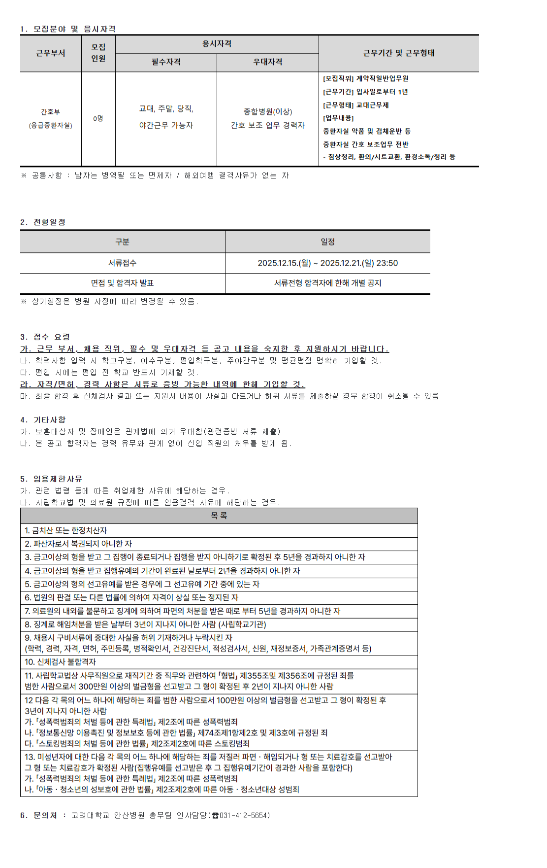 ±Ù¹«ºÎ¼­ ¸ðÁý Àοø ÀÀ½ÃÀÚ°Ý ±Ù¹«±â°£ ¹× ±Ù¹«ÇüÅ ÇʼöÀÚ°Ý ¿ì´ëÀÚ°Ý °£È£ºÎ (ÀÀ±ÞÁßȯÀÚ½Ç) 0¸í ±³´ë, ÁÖ¸», ´çÁ÷, ¾ß°£±Ù¹« °¡´ÉÀÚ Á¾ÇÕº´¿ø(ÀÌ»ó) °£È£ º¸Á¶ ¾÷¹« °æ·ÂÀÚ [¸ðÁýÁ÷À§] °è¾àÁ÷ÀϹݾ÷¹«¿ø [±Ù¹«±â°£] ÀÔ»çÀϷκÎÅÍ 1³â [±Ù¹«ÇüÅÂ] ±³´ë±Ù¹«Á¦ [¾÷¹«³»¿ë] ÁßȯÀÚ½Ç ¾àǰ ¹× °Ëü¿î¹Ý µî ÁßȯÀÚ½Ç °£È£ º¸Á¶¾÷¹« Àü¹Ý - ħ»óÁ¤¸®, ȯÀÇ/½ÃÆ®±³È¯, ȯ°æ¼Òµ¶/Á¤¸® µî