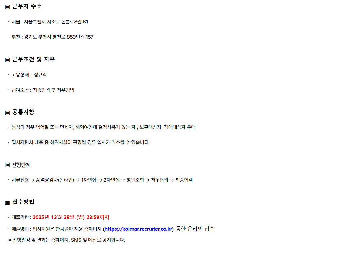 ¤ý Á¦Ãâ¹æ¹ý : ÀÔ»çÁö¿øÀº Çѱ¹Äݸ¶ ä¿ë ȨÆäÀÌÁö (https://kolmar.recruiter.co.kr) ÅëÇÑ ¿Â¶óÀÎ Á¢¼ö
