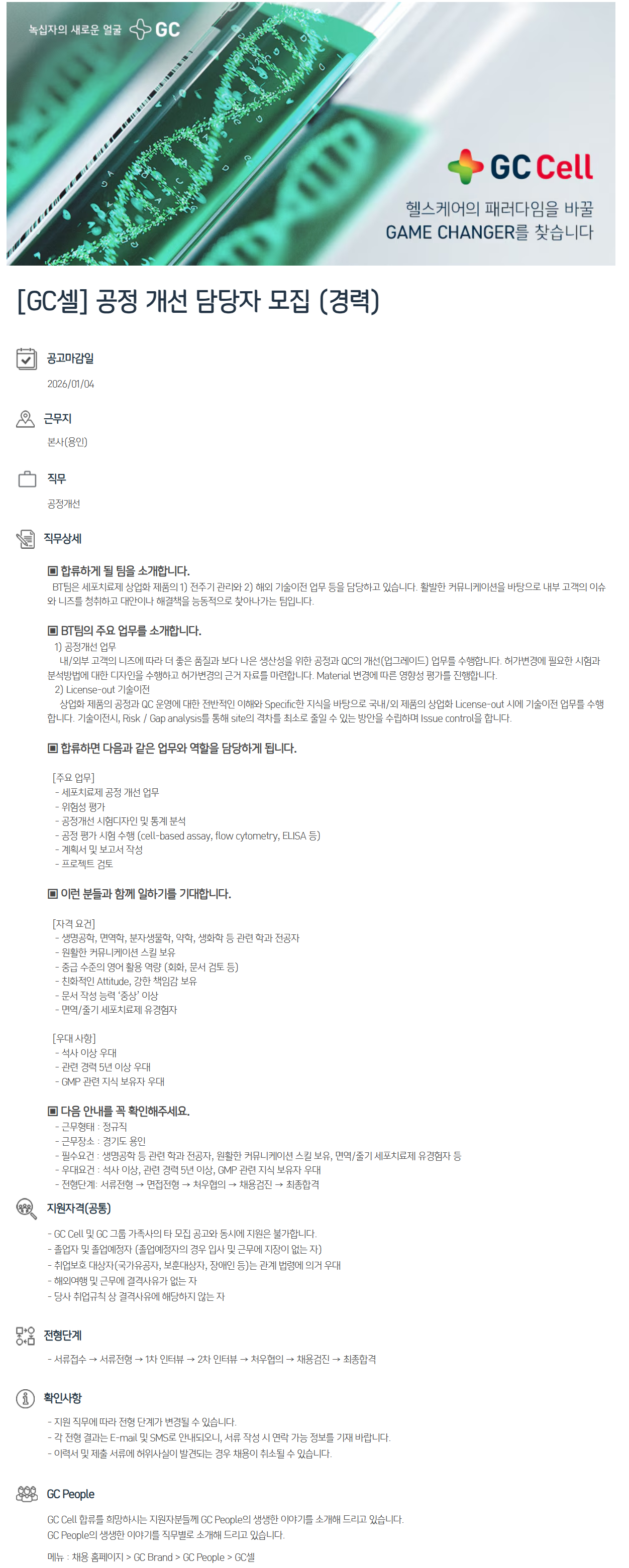 - Çʼö¿ä°Ç : »ý¸í°øÇÐ µî °ü·Ã Çаú Àü°øÀÚ, ¿øÈ°ÇÑ Ä¿¹Â´ÏÄÉÀÌ¼Ç ½ºÅ³ º¸À¯, ¸é¿ª/Áٱ⠼¼Æ÷Ä¡·áÁ¦ À¯°æÇèÀÚ µî