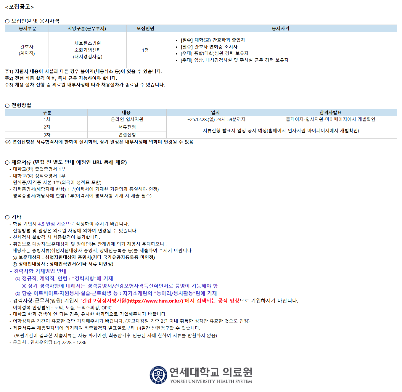 <¸ðÁý°ø°í> ¡Û ¸ðÁýÀοø ¹× ÀÀ½ÃÀÚ°Ý ÀÀ½ÃºÎ¹® Áö¸Á±¸ºÐ(±Ù¹«ºÎ¼­) ¸ðÁýÀοø ÀÀ½ÃÀÚ°Ý °£È£»ç (°è¾àÁ÷) ¼¼ºê¶õ½ºº´¿ø ¼ÒÈ­±âº´¼¾ÅÍ (³»½Ã°æ°Ë»ç½Ç) 1¸í [Çʼö] ´ëÇÐ(±³) °£È£Çаú Á¹¾÷ÀÚ [Çʼö] °£È£»ç ¸éÇãÁõ ¼ÒÁöÀÚ [¿ì´ë] Á¾ÇÕ(´ëÇÐ)º´¿ø °æ·Â º¸À¯ÀÚ [¿ì´ë] ÀÓ»ó, ³»½Ã°æ°Ë»ç½Ç ¹× ÁÖ»ç½Ç ±Ù¹« °æ·Â º¸À¯ÀÚ ÁÖ1) Áö¿ø¼­ ³»¿ëÀÌ »ç½Ç°ú ´Ù¸¥ °æ¿ì ºÒÀÌÀÍ(ä¿ëÃë¼Ò µî)ÀÌ ÀÖÀ» ¼ö ÀÖ½À´Ï´Ù. ÁÖ2) ÀüÇü ÃÖÁ¾ ÇÕ°Ý ÀÌÈÄ, Áï½Ã ±Ù¹« °¡´ÉÇÏ¿©¾ß ÇÕ´Ï´Ù. ÁÖ3) ä¿ë ÀýÂ÷ ÁøÇà Áß ÀÇ·á¿ø ³»ºÎ»çÁ¤¿¡ µû¶ó ä¿ëÀýÂ÷°¡ Á¾·áµÉ ¼ö ÀÖ½À´Ï´Ù. ¡Û ÀüÇü¹æ¹ý ±¸ºÐ ³»¿ë ÀϽà ÇÕ°ÝÀÚ¹ßÇ¥ 1Â÷ ¿Â¶óÀÎ ÀÔ»çÁö¿ø ~25.12.28.(ÀÏ) 23½Ã 59ºÐ±îÁö ȨÆäÀÌÁö-ÀÔ»çÁö¿ø-¸¶ÀÌÆäÀÌÁö¿¡¼­ °³º°È®ÀÎ 2Â÷ ¼­·ùÀüÇü ¼­·ùÀüÇü ¹ßÇ¥½Ã ÀÏÁ¤ °øÁö ¿¹Á¤(ȨÆäÀÌÁö-ÀÔ»çÁö¿ø-¸¶ÀÌÆäÀÌÁö¿¡¼­ °³º°È®ÀÎ) 3Â÷ ¸éÁ¢ÀüÇü ÁÖ) ¸éÁ¢ÀüÇüÀº ¼­·ùÇÕ°ÝÀÚ¿¡ ÇÑÇÏ¿© ½Ç½ÃÇϸç, »ó±â ÀÏÁ¤Àº ³»ºÎ»çÁ¤¿¡ ÀÇÇÏ¿© º¯°æµÉ ¼ö ÀÖÀ½ ​ ¡Û Á¦Ãâ¼­·ù (¸éÁ¢ Àü º°µµ ¾È³» ¿¹Á¤ÀÎ URL ÅëÇØ Á¦Ãâ) - ​´ëÇб³(¿ø) Á¹¾÷Áõ¸í¼­ 1ºÎ - ´ëÇб³(¿ø) ¼ºÀûÁõ¸í¼­ 1ºÎ - ¸éÇãÁõ/ÀÚ°ÝÁõ »çº» 1ºÎ(¿Ü±¹¾î ¼ºÀûÇ¥ Æ÷ÇÔ) - °æ·ÂÁõ¸í¼­(ÇØ´çÀÚ¿¡ ÇÑÇÔ) 1ºÎ(À̷¼­¿¡ ±âÀçÇÑ ±â°ü¸í°ú µ¿ÀÏÇØ¾ß ÀÎÁ¤) - º´ÀûÁõ¸í¼­(ÇØ´çÀÚ¿¡ ÇÑÇÔ) 1ºÎ(À̷¼­¿¡ º´¿ª»çÇ× ±âÀç ½Ã Á¦Ãâ Çʼö) ¡Û ±âŸ - ÇÐÁ¡ ±âÀԽà 4.5 ¸¸Á¡ ±âÁØÀ¸·Î ÀÛ¼ºÇÏ¿© Áֽñ⠹ٶø´Ï´Ù. - ÀüÇü¹æ¹ý ¹× ÀÏÁ¤Àº ÀÇ·á¿ø »çÁ¤¿¡ ÀÇÇÏ¿© º¯°æµÉ ¼ö ÀÖ½À´Ï´Ù - ½Åü°Ë»ç ºÒÇÕ°Ý ½Ã ÃÖÁ¾ÇÕ°ÝÀÌ ºÒ°¡ÇÕ´Ï´Ù. - Ãë¾÷º¸È£ ´ë»óÀÚ(º¸ÈÆ´ë»óÀÚ ¹× Àå¾ÖÀÎ)´Â °ü°è¹ý¿¡ ÀǰŠä¿ë½Ã ¿ì´ëÇÏ¿À´Ï , ÇØ´çÀÚ´Â Áõºù¼­·ù(Ãë¾÷Áö¿ø´ë»óÀÚ Áõ¸í¼­, Àå¾ÖÀεî·ÏÁõ µî)¸¦ Á¦ÃâÇÏ¿© Áֽñ⠹ٶø´Ï´Ù. ¨ç º¸ÈÆ´ë»óÀÚ : Ãë¾÷Áö¿ø´ë»óÀÚ Áõ¸í¼­(±âŸ ±¹°¡À¯°øÀÚµî·ÏÁõ ¹ÌÀÎÁ¤) ¨è Àå¾ÖÀδë»óÀÚ : Àå¾ÖÀÎÈ®Àμ­(±âŸ ¼­·ù ¹ÌÀÎÁ¤) - °æ·Â»çÇ× ±âÀç¹æ¹ý ¾È³» ¨ç Á¤±ÔÁ÷, °è¾àÁ÷, ÀÎÅÏ : "°æ·Â»çÇ×"¿¡ ±âÀç ¡Ø »ó±â °æ·Â»çÇ׿¡ ´ëÇØ¼­´Â °æ·ÂÁõ¸í¼­/°Ç°­º¸ÇèÀڰݵæ½ÇÈ®Àμ­·Î Áõ¸íÀÌ °¡´ÉÇØ¾ß ÇÔ ¨è ´Ü¼ø ¾Æ¸£¹ÙÀÌÆ®¡¤ÀÚ¿øºÀ»ç¡¤½Ç½À¡¤±Ù·ÎÇлý µî : ÀÚ±â¼Ò°³¶õÀÇ "µ¿¾Æ¸®/ºÀ»çȰµ¿"¶õ¿¡ ±âÀç - °æ·Â»çÇ×-±Ù¹«Ã³(º´¿ø) ±âÀԽà '°Ç°­º¸Çè½É»çÆò°¡¿ø(https://www.hira.or.kr/)'¿¡¼­ °Ë»öµÇ´Â °ø½Ä ¸íĪÀ¸·Î ±âÀÔÇϽñ⠹ٶø´Ï´Ù. - ¾îÇмºÀû ÀÎÁ¤¹üÀ§ : ÅäÀÍ, ÅäÇÃ, ÅäÀͽºÇÇÅ·, OPIC - ´ëÇб³ Çаú °Ë»öÀÌ ¾È µÇ´Â °æ¿ì, À¯»çÇÑ Çаú¸íÀ¸·Î ±âÀÔÇØÁֽñ⠹ٶø´Ï´Ù. - ¾îÇмºÀûÀº ±â°£ÀÌ À¯È¿ÇÑ °Í¸¸ ±âÀçÇØÁֽñ⠹ٶø´Ï´Ù. (°ø°í¸¶°¨ÀÏ ±âÁØ 2³â À̳» ÃëµæÇÑ ¼ºÀû¸¸ À¯È¿ÇÑ °ÍÀ¸·Î ÀÎÁ¤) - Á¦Ãâ¼­·ù´Â ä¿ëÀýÂ÷¹ý¿¡ ÀǰÅÇÏ¿© ÃÖÁ¾ÇÕ°ÝÀÚ ¹ßÇ¥ÀϷκÎÅÍ 14Àϰ£ ¹Ýȯû±¸ÇÒ ¼ö ÀÖ½À´Ï´Ù. (º¸°ü±â°£ÀÌ °á°úÇÑ Á¦Ãâ¼­·ù´Â ÀÚµ¿ ÆÄ±â¿¹Á¤, ÃÖÁ¾ÇÕ°ÝÈÄ ÀÓ¿ëµÈ ÀÚ¿¡ ÇÑÇÏ¿© ¼­·ù¸¦ ¹ÝȯÇÏÁö ¾ÊÀ½) - ¹®ÀÇó : Àλç¿î¿µÆÀ ***-****-****