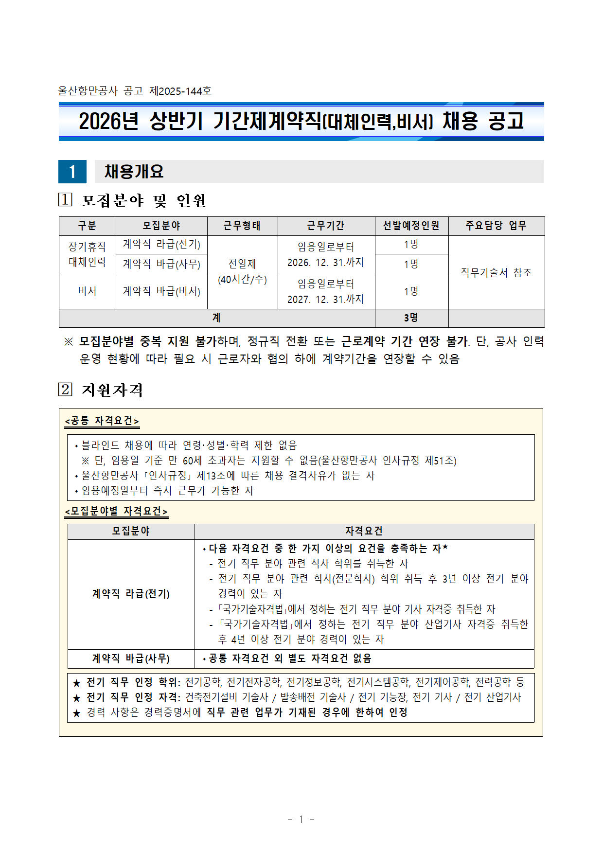 2026³â »ó¹Ý±â ±â°£Á¦°è¾àÁ÷(´ëüÀηÂ, ºñ¼) ä¿ë °ø°í