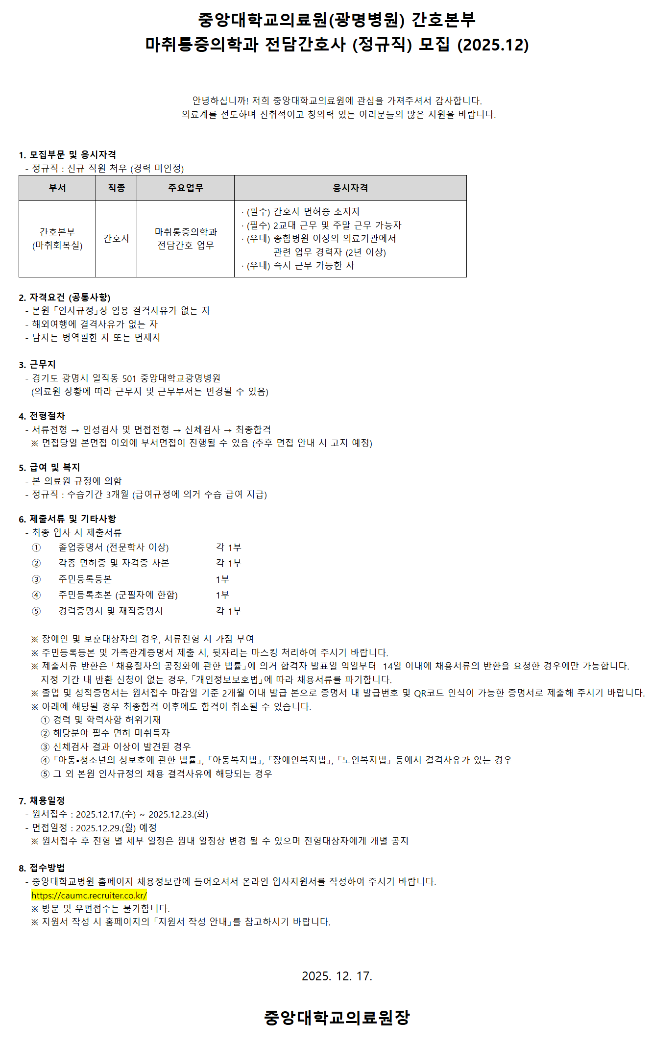 ¸¶ÃëÅëÁõÀÇÇаú Àü´ã°£È£»ç (Á¤±ÔÁ÷) ¸ðÁý (2025.12)