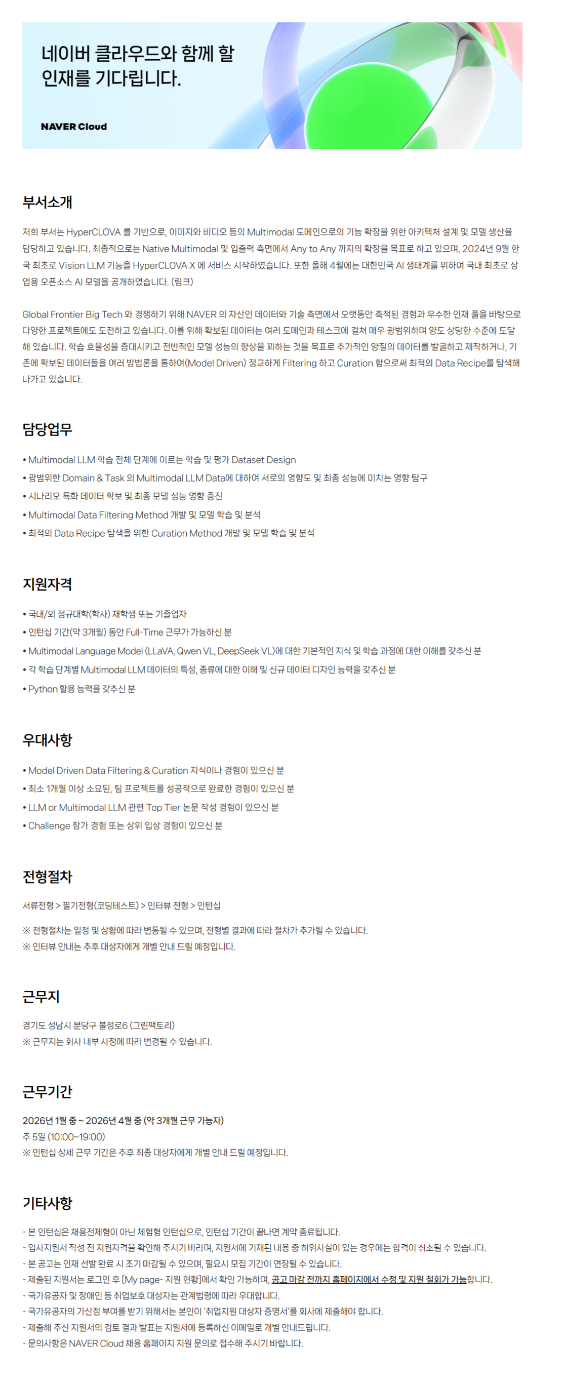 ÀúÈñ ºÎ¼´Â HyperCLOVA ¸¦ ±â¹ÝÀ¸·Î, À̹ÌÁö¿Í ºñµð¿À µîÀÇ Multimodal µµ¸ÞÀÎÀ¸·ÎÀÇ ±â´É È®ÀåÀ» À§ÇÑ ¾ÆÅ°ÅØÃ³ ¼³°è ¹× ¸ðµ¨ »ý»êÀ» ´ã´çÇϰí ÀÖ½À´Ï´Ù. ÃÖÁ¾ÀûÀ¸·Î´Â Native Multimodal ¹× ÀÔÃâ·Â Ãø¸é¿¡¼ Any to Any ±îÁöÀÇ È®ÀåÀ» ¸ñÇ¥·Î Çϰí ÀÖÀ¸¸ç, 2024³â 9¿ù Çѱ¹ ÃÖÃÊ·Î Vision LLM ±â´ÉÀ» HyperCLOVA X ¿¡ ¼ºñ½º ½ÃÀÛÇÏ¿´½À´Ï´Ù. ¶ÇÇÑ ¿ÃÇØ 4¿ù¿¡´Â ´ëÇѹα¹ AI »ýŰ踦 À§ÇÏ¿© ±¹³» ÃÖÃÊ·Î »ó¾÷¿ë ¿ÀǼҽº AI ¸ðµ¨À» °ø°³ÇÏ¿´½À´Ï´Ù. (¸µÅ©)
