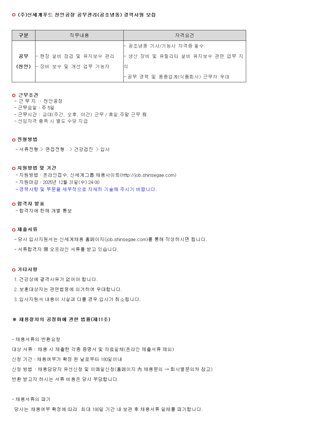 (ÁÖ)½Å¼¼°èǪµå õ¾È°øÀå °ø¹«°ü¸®(°øÁ¶³Ãµ¿) °æ·Â»ç¿ø ¸ðÁý