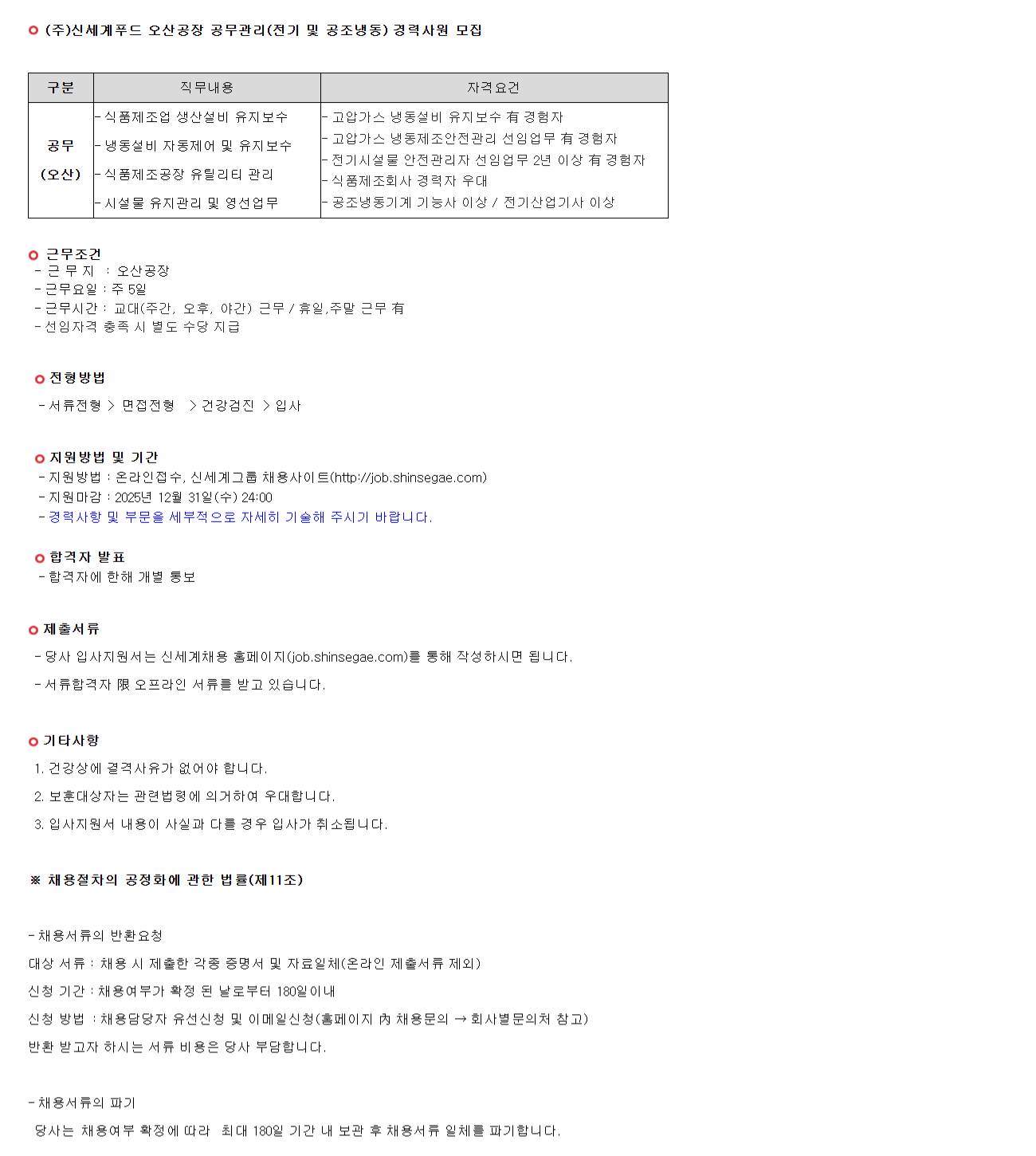 (ÁÖ)½Å¼¼°èǪµå ¿À»ê°øÀå °ø¹«°ü¸®(Àü±â ¹× °øÁ¶³Ãµ¿) °æ·Â»ç¿ø ¸ðÁý