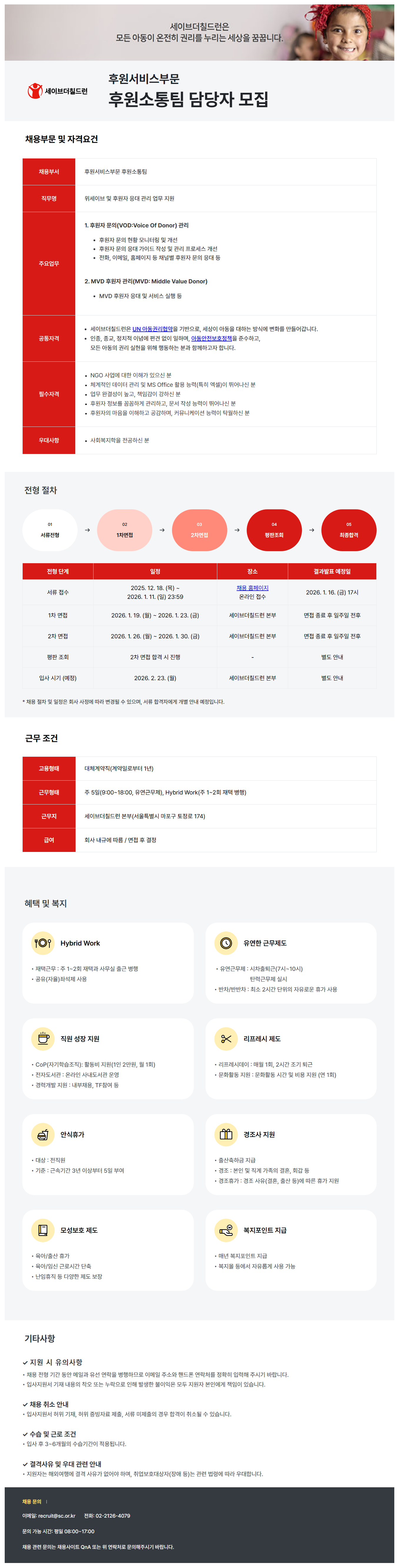 ä¿ëºÎ¹® ¹× ÀÚ°Ý¿ä°Ç ä¿ëºÎ¼­ ÈÄ¿ø¼­ºñ½ººÎ¹® ÈÄ¿ø¼ÒÅëÆÀ Á÷¹«¸í À§¼¼ÀÌºê ¹× ÈÄ¿øÀÚ ÀÀ´ë °ü¸® ¾÷¹« Áö¿ø ÁÖ¿ä¾÷¹« 1. ÈÄ¿øÀÚ ¹®ÀÇ(VOD:Voice Of Donor) °ü¸® ÈÄ¿øÀÚ ¹®ÀÇ ÇöȲ ¸ð´ÏÅ͸µ ¹× °³¼± ÈÄ¿øÀÚ ¹®ÀÇ ÀÀ´ë °¡À̵å ÀÛ¼º ¹× °ü¸® ÇÁ·Î¼¼½º °³¼± ÀüÈ­, À̸ÞÀÏ, ȨÆäÀÌÁö µî ä³Îº° ÈÄ¿øÀÚ ¹®ÀÇ ÀÀ´ë µî 2. MVD ÈÄ¿øÀÚ °ü¸®(MVD: Middle Value Donor) MVD ÈÄ¿øÀÚ ÀÀ´ë ¹× ¼­ºñ½º ½ÇÇà µî °øÅëÀÚ°Ý ¼¼À̺ê´õÄ¥µå·±Àº UN ¾Æµ¿±Ç¸®Çù¾àÀ» ±â¹ÝÀ¸·Î, ¼¼»óÀÌ ¾Æµ¿À» ´ëÇÏ´Â ¹æ½Ä¿¡ º¯È­¸¦ ¸¸µé¾î°©´Ï´Ù. ÀÎÁ¾, Á¾±³, Á¤Ä¡Àû À̳信 Æí°ß ¾øÀÌ ÀÏÇϸç, ¾Æµ¿¾ÈÀüº¸È£Á¤Ã¥À» ÁؼöÇϰí, ¸ðµç ¾Æµ¿ÀÇ ±Ç¸® ½ÇÇöÀ» À§ÇØ ÇൿÇÏ´Â ºÐ°ú ÇÔ²²ÇϰíÀÚ ÇÕ´Ï´Ù. ÇʼöÀÚ°Ý NGO »ç¾÷¿¡ ´ëÇÑ ÀÌÇØ°¡ ÀÖÀ¸½Å ºÐ ü°èÀûÀÎ µ¥ÀÌÅÍ °ü¸® ¹× MS Office Ȱ¿ë ´É·Â(ƯÈ÷ ¿¢¼¿)ÀÌ ¶Ù¾î³ª½Å ºÐ ¾÷¹« ¿Ï°á¼ºÀÌ ³ô°í, Ã¥ÀÓ°¨ÀÌ °­ÇϽŠºÐ ÈÄ¿øÀÚ Á¤º¸¸¦ ²Ä²ÄÇÏ°Ô °ü¸®Çϰí, ¹®¼­ ÀÛ¼º ´É·ÂÀÌ ¶Ù¾î³ª½Å ºÐ ÈÄ¿øÀÚÀÇ ¸¶À½À» ÀÌÇØÇÏ°í °ø°¨Çϸç, Ä¿¹Â´ÏÄÉÀÌ¼Ç ´É·ÂÀÌ Å¹¿ùÇϽŠºÐ ¿ì´ë»çÇ× »çȸº¹ÁöÇÐÀ» Àü°øÇϽŠºÐ