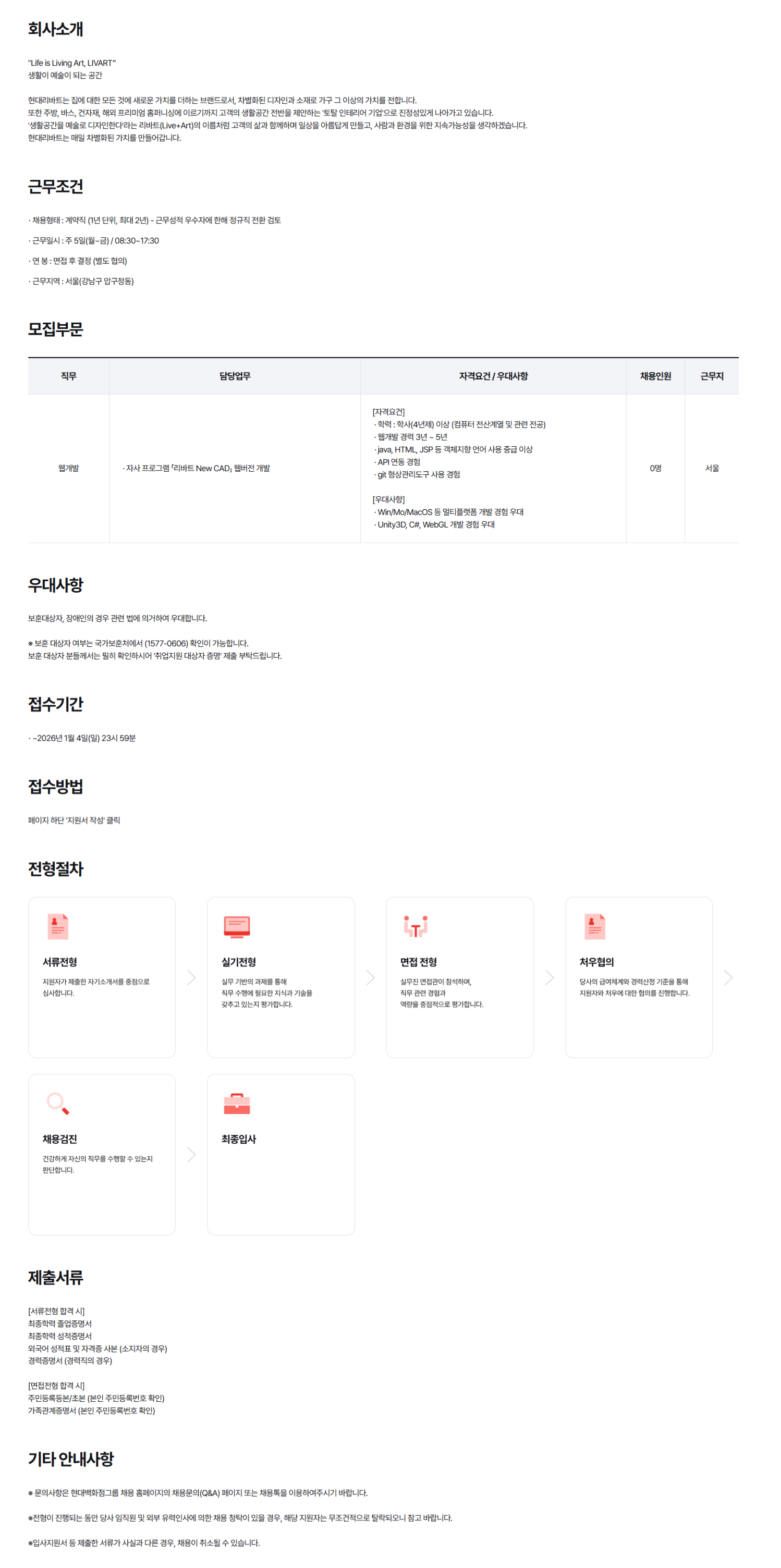 "Life is Living Art, LIVART¡± »ýȰÀÌ ¿¹¼úÀÌ µÇ´Â °ø°£ Çö´ë¸®¹ÙÆ®´Â Áý¿¡ ´ëÇÑ ¸ðµç °Í¿¡ »õ·Î¿î °¡Ä¡¸¦ ´õÇÏ´Â ºê·£µå·Î¼­, Â÷º°È­µÈ µðÀÚÀΰú ¼ÒÀç·Î °¡±¸ ±× ÀÌ»óÀÇ °¡Ä¡¸¦ ÀüÇÕ´Ï´Ù. ¶ÇÇÑ ÁÖ¹æ, ¹Ù½º, °ÇÀÚÀç, ÇØ¿Ü ÇÁ¸®¹Ì¾ö ȨÆÛ´Ï½Ì¿¡ À̸£±â±îÁö °í°´ÀÇ »ýȰ°ø°£ Àü¹ÝÀ» Á¦¾ÈÇÏ´Â 'ÅäÅ» ÀÎÅ׸®¾î ±â¾÷'À¸·Î ÁøÁ¤¼ºÀÖ°Ô ³ª¾Æ°¡°í ÀÖ½À´Ï´Ù. '»ýȰ°ø°£À» ¿¹¼ú·Î µðÀÚÀÎÇÑ´Ù'¶ó´Â ¸®¹ÙÆ®(Live+Art)ÀÇ À̸§Ã³·³ °í°´ÀÇ »î°ú ÇÔ²²Çϸç ÀÏ»óÀ» ¾Æ¸§´ä°Ô ¸¸µé°í, »ç¶÷°ú ȯ°æÀ» À§ÇÑ Áö¼Ó°¡´É¼ºÀ» »ý°¢ÇϰڽÀ´Ï´Ù. Çö´ë¸®¹ÙÆ®´Â ¸ÅÀÏ Â÷º°È­µÈ °¡Ä¡¸¦ ¸¸µé¾î°©´Ï´Ù. ±Ù¹«Á¶°Ç ä¿ëÇüÅ : °è¾àÁ÷ (1³â ´ÜÀ§, ÃÖ´ë 2³â) - ±Ù¹«¼ºÀû ¿ì¼öÀÚ¿¡ ÇÑÇØ Á¤±ÔÁ÷ Àüȯ °ËÅä ±Ù¹«ÀϽà : ÁÖ 5ÀÏ(¿ù~±Ý) / 08:30~17:30 ¿¬ ºÀ : ¸éÁ¢ ÈÄ °áÁ¤ (º°µµ ÇùÀÇ) ±Ù¹«Áö¿ª : ¼­¿ï(°­³²±¸ ¾Ð±¸Á¤µ¿) ¸ðÁýºÎ¹® ä¿ë Á÷¹«º° ¸ðÁý ºÎ¹® »ó¼¼ ¾È³» Á÷¹« ´ã´ç¾÷¹« ÀÚ°Ý¿ä°Ç / ¿ì´ë»çÇ× Ã¤¿ëÀοø ±Ù¹«Áö À¥°³¹ß ¡¤ ÀÚ»ç ÇÁ·Î±×·¥ ¡¸¸®¹ÙÆ® New CAD¡¹ À¥¹öÀü °³¹ß [ÀÚ°Ý¿ä°Ç] ¡¤ Çз : Çлç(4³âÁ¦) ÀÌ»ó (ÄÄÇ»ÅÍ Àü»ê°è¿­ ¹× °ü·Ã Àü°ø) ¡¤ À¥°³¹ß °æ·Â 3³â ~ 5³â ¡¤ java, HTML, JSP µî °´Ã¼ÁöÇâ ¾ð¾î »ç¿ë Áß±Þ ÀÌ»ó ¡¤ API ¿¬µ¿ °æÇè ¡¤ git Çü»ó°ü¸®µµ±¸ »ç¿ë °æÇè [¿ì´ë»çÇ×] ¡¤ Win/Mo/MacOS µî ¸ÖƼÇ÷§Æû °³¹ß °æÇè ¿ì´ë ¡¤ Unity3D, C#, WebGL °³¹ß °æÇè ¿ì´ë 0¸í ¼­¿ï