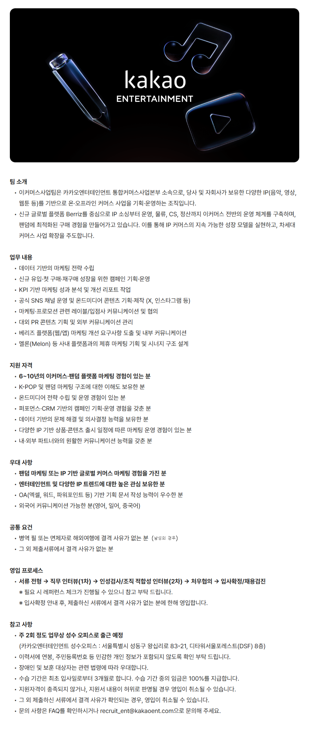 ÀÌÄ¿¸Ó½º»ç¾÷ÆÀÀº īī¿À¿£ÅÍÅ×ÀÎ¸ÕÆ® ÅëÇÕÄ¿¸Ó½º»ç¾÷º»ºÎ ¼Ò¼ÓÀ¸·Î, ´ç»ç ¹× ÀÚȸ»ç°¡ º¸À¯ÇÑ ´Ù¾çÇÑ IP(À½¾Ç, ¿µ»ó, À¥Å÷ µî)¸¦ ±â¹ÝÀ¸·Î ¿Â¡¤¿ÀÇÁ¶óÀÎ Ä¿¸Ó½º »ç¾÷À» ±âȹ¡¤¿î¿µÇÏ´Â Á¶Á÷ÀÔ´Ï´Ù.