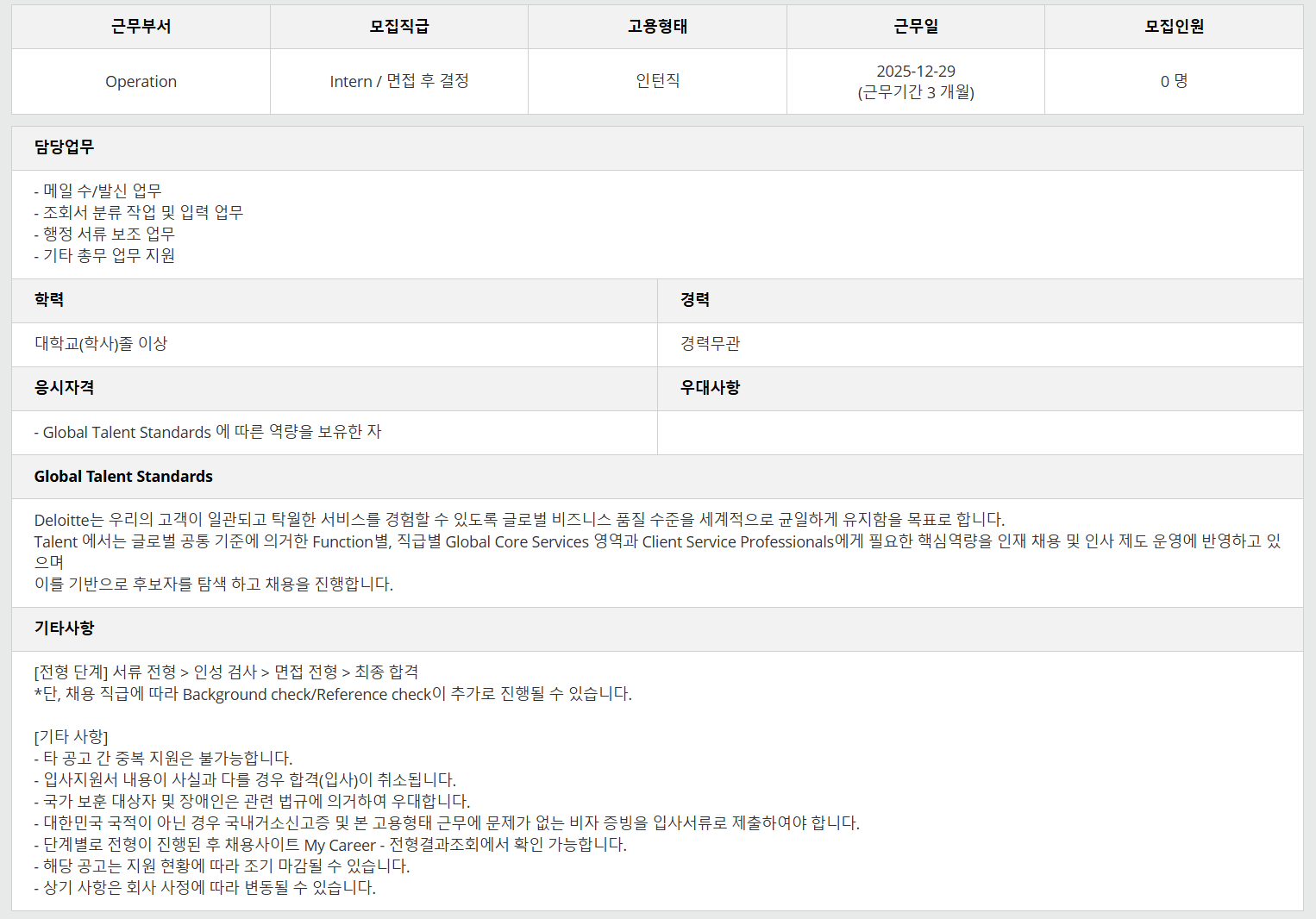 Á¢¼ö±â°£ 2025-12-18 00:00 ~ 2025-12-23 16:00 ±Þ¿©Á¶°Ç ȸ»ç ³»±Ô¿¡ µû¸§ ¸ðÁýºÎ¹® ÀÏ¹Ý ±Ù¹«Áö¿ª ¼­¿ï ¿©Àǵµ ÀüÇü´Ü°è ¼­·ù ÀüÇü ´ÙÀ½ÀüÇü ¸éÁ¢ ÀüÇü ´ÙÀ½ÀüÇü Àμº °Ë»ç ´ÙÀ½ÀüÇü ÃÖÁ¾ ÇÕ°Ý ´ÙÀ½ÀüÇü ÃÖÁ¾ ½ÂÀÎ ±Ù¹«ºÎ¼­ ¸ðÁýÁ÷±Þ °í¿ëÇüÅ ±Ù¹«ÀÏ ¸ðÁýÀοø Operation Intern / ¸éÁ¢ ÈÄ °áÁ¤ ÀÎÅÏÁ÷ 2025-12-29 (±Ù¹«±â°£ 3 °³¿ù) 0 ¸í ´ã´ç¾÷¹« - ¸ÞÀÏ ¼ö/¹ß½Å ¾÷¹« - Á¶È¸¼­ ºÐ·ù ÀÛ¾÷ ¹× ÀÔ·Â ¾÷¹« - ÇàÁ¤ ¼­·ù º¸Á¶ ¾÷¹« - ±âŸ Ãѹ« ¾÷¹« Áö¿ø Çз °æ·Â ´ëÇб³(Çлç)Á¹ ÀÌ»ó °æ·Â¹«°ü ÀÀ½ÃÀÚ°Ý ¿ì´ë»çÇ× - Global Talent Standards ¿¡ µû¸¥ ¿ª·®À» º¸À¯ÇÑ ÀÚ Global Talent Standards Deloitte´Â ¿ì¸®ÀÇ °í°´ÀÌ ÀϰüµÇ°í Ź¿ùÇÑ ¼­ºñ½º¸¦ °æÇèÇÒ ¼ö ÀÖµµ·Ï ±Û·Î¹ú ºñÁî´Ï½º ǰÁú ¼öÁØÀ» ¼¼°èÀûÀ¸·Î ±ÕÀÏÇÏ°Ô À¯ÁöÇÔÀ» ¸ñÇ¥·Î ÇÕ´Ï´Ù. Talent ¿¡¼­´Â ±Û·Î¹ú °øÅë ±âÁØ¿¡ ÀǰÅÇÑ Functionº°, Á÷±Þº° Global Core Services ¿µ¿ª°ú Client Service Professionals¿¡°Ô ÇÊ¿äÇÑ Çٽɿª·®À» ÀÎÀç ä¿ë ¹× Àλç Á¦µµ ¿î¿µ¿¡ ¹Ý¿µÇϰí ÀÖÀ¸¸ç À̸¦ ±â¹ÝÀ¸·Î Èĺ¸ÀÚ¸¦ Ž»ö Çϰí ä¿ëÀ» ÁøÇàÇÕ´Ï´Ù. ±âŸ»çÇ× [ÀüÇü ´Ü°è] ¼­·ù ÀüÇü > Àμº °Ë»ç > ¸éÁ¢ ÀüÇü > ÃÖÁ¾ ÇÕ°Ý *´Ü, ä¿ë Á÷±Þ¿¡ µû¶ó Background check/Reference checkÀÌ Ãß°¡·Î ÁøÇàµÉ ¼ö ÀÖ½À´Ï´Ù. [±âŸ »çÇ×] - Ÿ °ø°í °£ Áߺ¹ Áö¿øÀº ºÒ°¡´ÉÇÕ´Ï´Ù. - ÀÔ»çÁö¿ø¼­ ³»¿ëÀÌ »ç½Ç°ú ´Ù¸¦ °æ¿ì ÇÕ°Ý(ÀÔ»ç)ÀÌ Ãë¼ÒµË´Ï´Ù. - ±¹°¡ º¸ÈÆ ´ë»óÀÚ ¹× Àå¾ÖÀÎÀº °ü·Ã ¹ý±Ô¿¡ ÀǰÅÇÏ¿© ¿ì´ëÇÕ´Ï´Ù. - ´ëÇѹα¹ ±¹ÀûÀÌ ¾Æ´Ñ °æ¿ì ±¹³»°Å¼Ò½Å°íÁõ ¹× º» °í¿ëÇüÅ ±Ù¹«¿¡ ¹®Á¦°¡ ¾ø´Â ºñÀÚ ÁõºùÀ» ÀԻ缭·ù·Î Á¦ÃâÇÏ¿©¾ß ÇÕ´Ï´Ù. - ´Ü°èº°·Î ÀüÇüÀÌ ÁøÇàµÈ ÈÄ Ã¤¿ë»çÀÌÆ® My Career - ÀüÇü°á°úÁ¶È¸¿¡¼­ È®ÀÎ °¡´ÉÇÕ´Ï´Ù. - ÇØ´ç °ø°í´Â Áö¿ø ÇöȲ¿¡ µû¶ó Á¶±â ¸¶°¨µÉ ¼ö ÀÖ½À´Ï´Ù. - »ó±â »çÇ×Àº ȸ»ç »çÁ¤¿¡ µû¶ó º¯µ¿µÉ ¼ö ÀÖ½À´Ï´Ù.