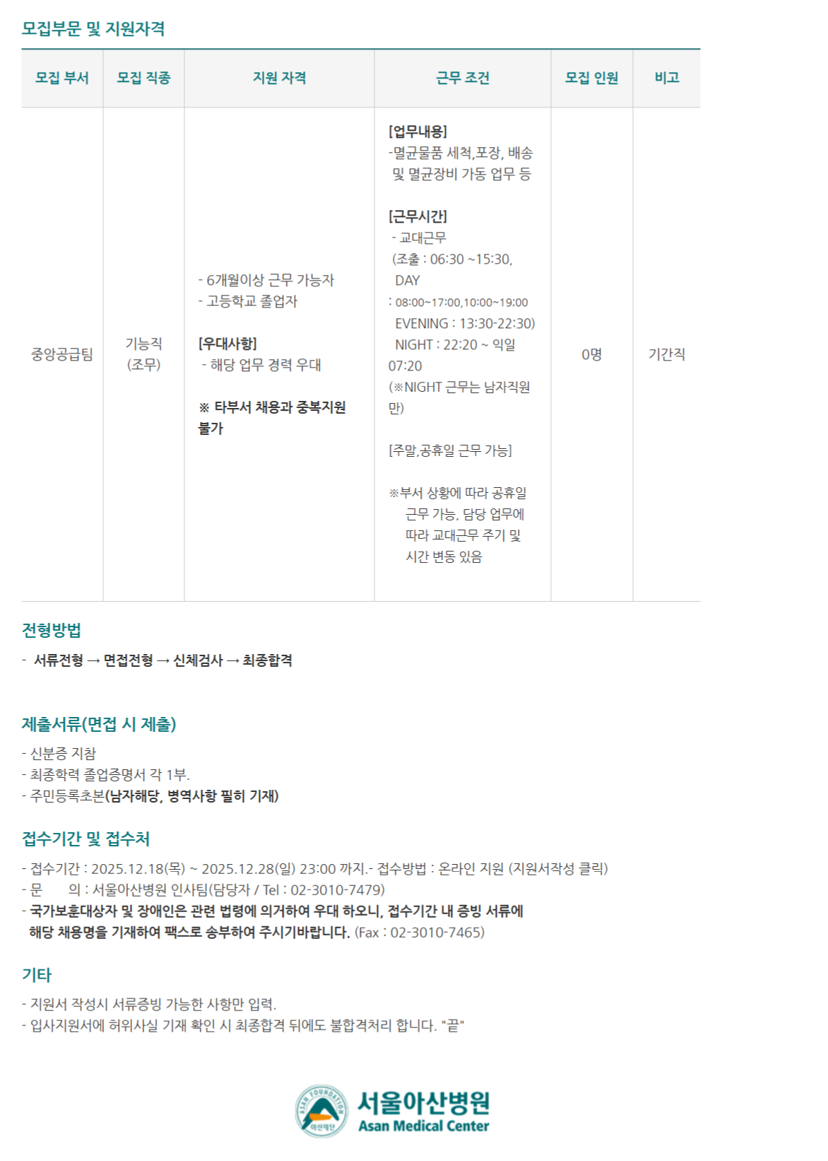 ¸ðÁý ºÎ¼­ ¸ðÁý Á÷Á¾ Áö¿ø ÀÚ°Ý ±Ù¹« Á¶°Ç ¸ðÁý Àοø ºñ°í Áß¾Ó°ø±ÞÆÀ ±â´ÉÁ÷ (Á¶¹«) - 6°³¿ùÀÌ»ó ±Ù¹« °¡´ÉÀÚ - °íµîÇб³ Á¹¾÷ÀÚ [¿ì´ë»çÇ×] - ÇØ´ç ¾÷¹« °æ·Â ¿ì´ë ¡Ø ŸºÎ¼­ ä¿ë°ú Áߺ¹Áö¿ø ºÒ°¡ [¾÷¹«³»¿ë] -¸ê±Õ¹°Ç° ¼¼Ã´,Æ÷Àå, ¹è¼Û ¹× ¸ê±ÕÀåºñ °¡µ¿ ¾÷¹« µî [±Ù¹«½Ã°£] - ±³´ë±Ù¹« (Á¶Ãâ : 06:30 ~15:30, DAY : 08:00~17:00,10:00~19;00 EVENING : 13:30-22:30) NIGHT : 22:20 ~ ÀÍÀÏ 07:20 (¡ØNIGHT ±Ù¹«´Â ³²ÀÚÁ÷¿ø¸¸) [ÁÖ¸»,°øÈÞÀÏ ±Ù¹« °¡´É] ¡ØºÎ¼­ »óȲ¿¡ µû¶ó °øÈÞÀÏ ±Ù¹« °¡´É, ´ã´ç ¾÷¹«¿¡ µû¶ó ±³´ë±Ù¹« ÁÖ±â ¹× ½Ã°£ º¯µ¿ ÀÖÀ½ 0¸í ±â°£Á÷