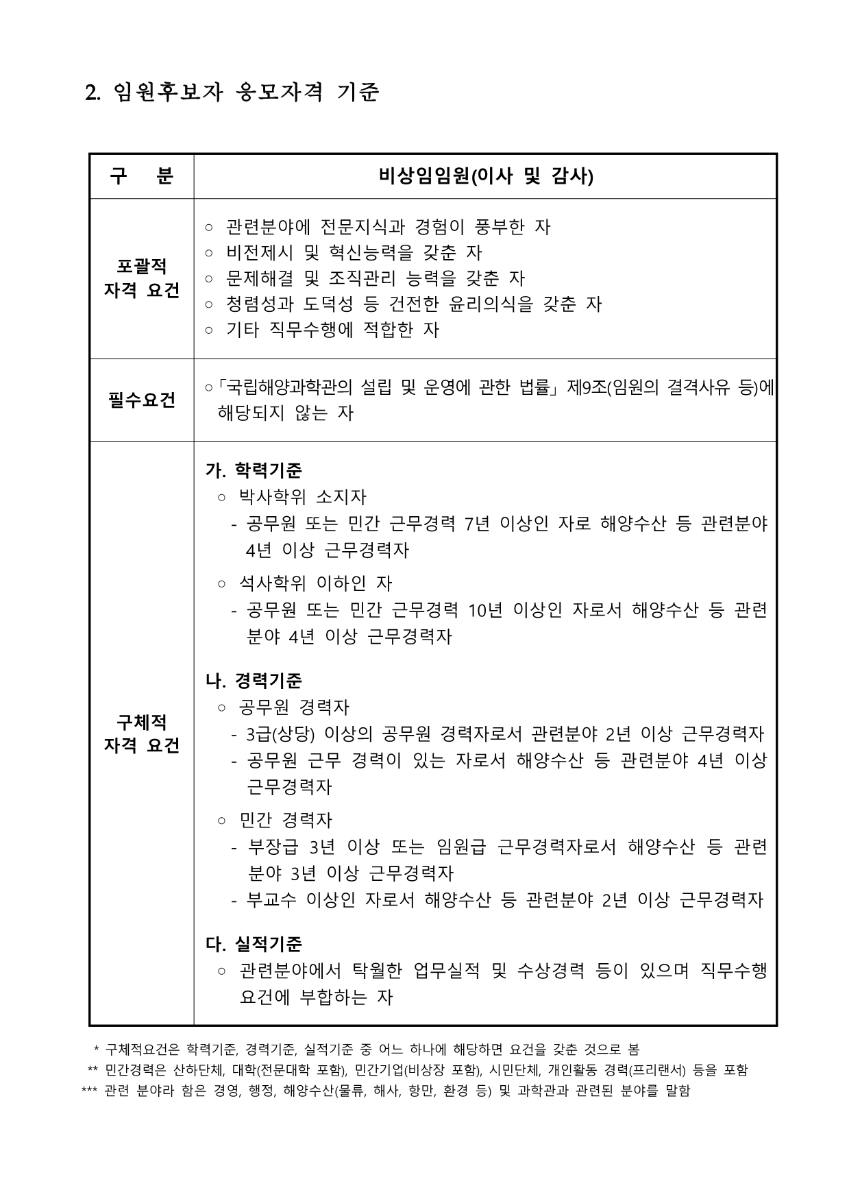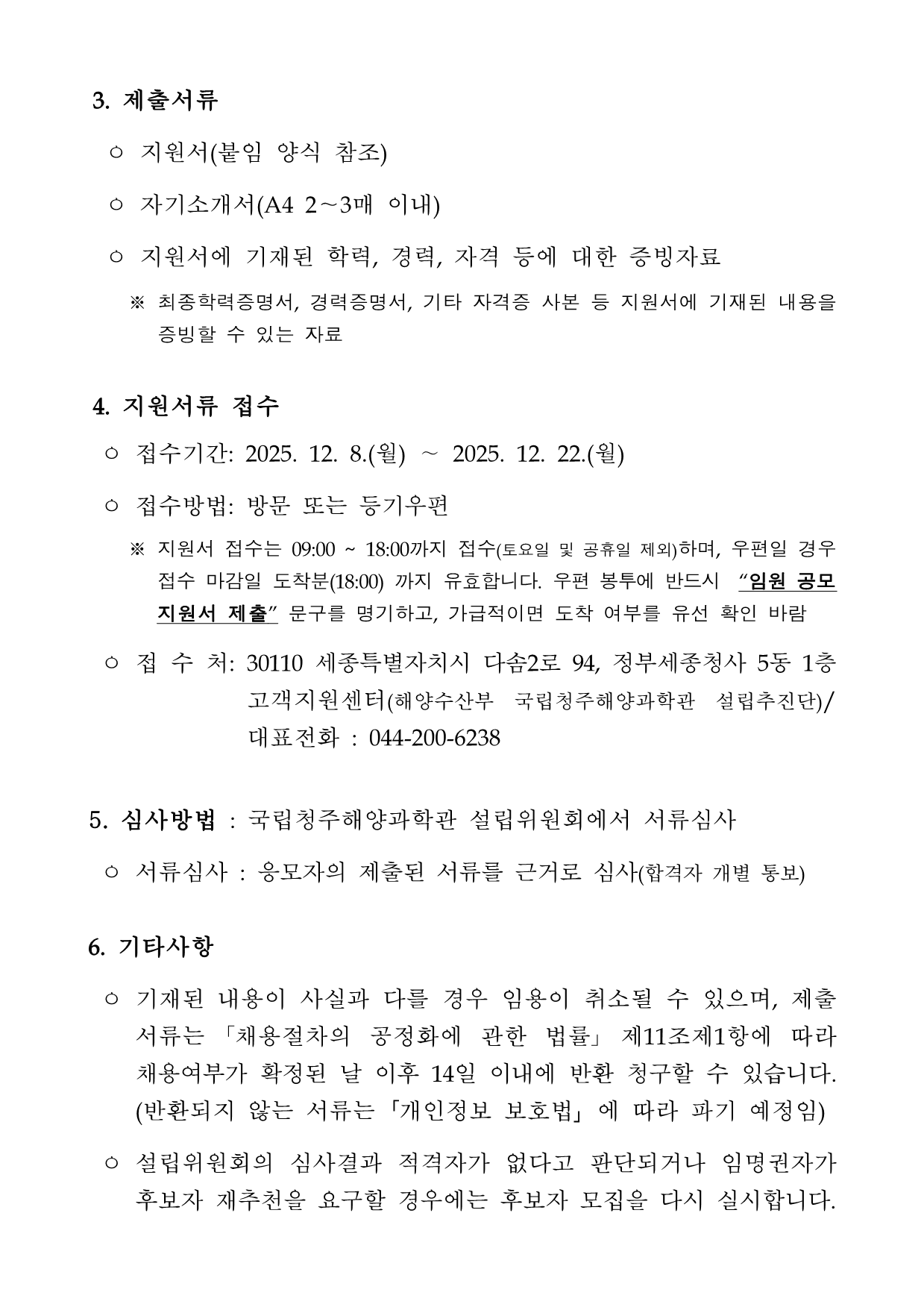 ÇØ¾ç¼ö»êºÎ °ø°í Á¦2025-1215È£ ±¹¸³Ã»ÁÖÇØ¾ç°úÇаü ÃÊ´ë ºñ»óÀÓÀÓ¿ø¸ðÁý°ø°í±¹¸³Ã»ÁÖÇØ¾ç°úÇаüÀº ÇØ¾ç°úÇп¡ °üÇÑ ÀڷḦ ¼öÁý¡¤Á¶»ç¡¤¿¬±¸ÇÏ¿©À̸¦ º¸Á¸¡¤Àü½Ã¡¤±³À°ÇÔÀ¸·Î½á ÇØ¾ç¿¡ ´ëÇÑ ÀÌÇØ¸¦ ÁõÁøÇϰí ÇØ¾ç»ê¾÷ÀǹßÀü¿¡ À̹ÙÁöÇÔÀ» ¸ñÀûÀ¸·Î ¼³¸³ ÁßÀÎ ÇØ¾ç¼ö»êºÎ »êÇÏ °ø°ø±â°ü(¿¹Á¤)ÀÔ´Ï´Ù. ±¹¸³Ã»ÁÖÇØ¾ç°úÇаü¿¡¼ ºñ»óÀÓÀÓ¿ø(ÀÌ»ç ¹× °¨»ç) Èĺ¸ÀÚ¸¦°ø°³¸ðÁýÇÏ¿À´Ï Àü¹®¼º°ú ¿ª·®À» °âºñÇÑ ¸¹Àº ºÐµéÀÇ ÀÀ¸ð¸¦ ¹Ù¶ø´Ï´Ù. 2025³â 12¿ù08ÀÏÇØ¾ç¼ö»êºÎÀå°ü1. °ø¸ðÁ÷À§, Àοø ¹× ÁÖ¿ä ´ã´çºÐ¾ß ±¸ºÐ Àοø ¿¹Á¤ Á÷¹« ÀÓ¿ë±â°£* ºñ»óÀÓÀÌ»ç 4¸í ◦ ÀÌ»çȸ ½ÉÀÇ¡¤Àǰá, ÀÚ¹® µî 2³âºñ»óÀÓ°¨»ç 1¸í ◦ ȸ°è¿Í ¾÷¹«ÁýÇà¿¡ °üÇÑ »çÇ× °¨»ç µî 2³â* Æò°¡°á°ú¿¡ µû¶ó 1³â ´ÜÀ§·Î ¿¬ÀÓ °¡´É
