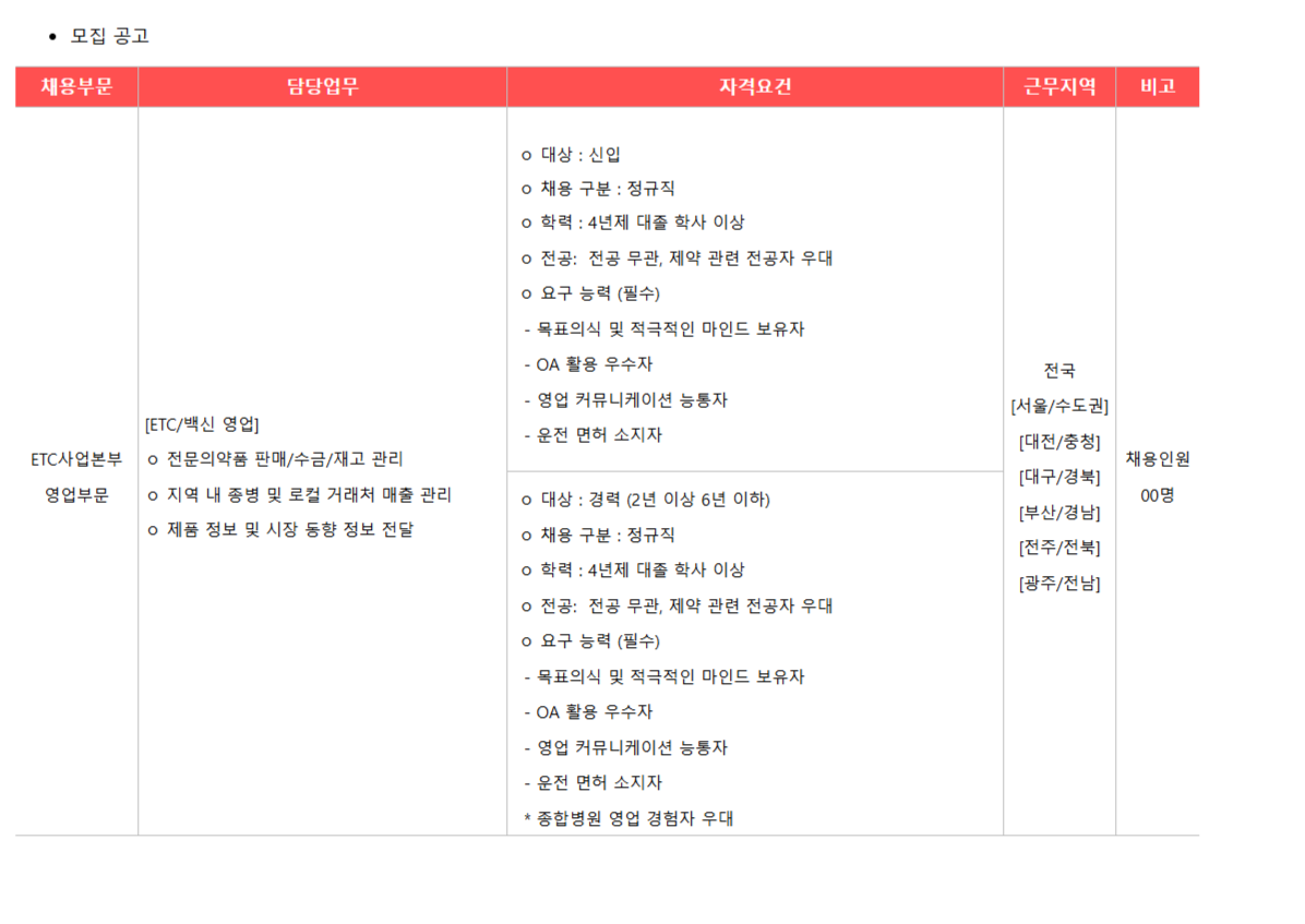 [±¤µ¿Á¦¾à] ETC»ç¾÷º»ºÎ Àü±¹ Áö¿ªº° ¿µ¾÷»ç¿ø(MR) ½ÅÀÔ ¹× °æ·ÂÁ÷¿ø ¸ðÁý
