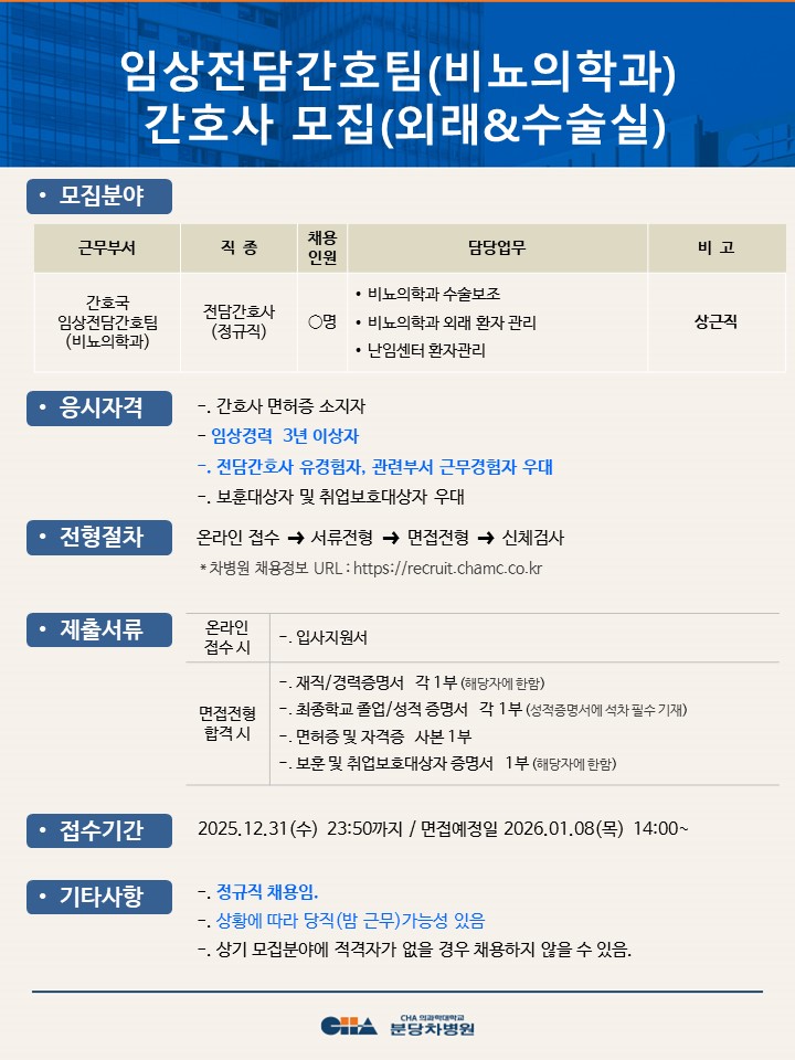 [ºÐ´çÂ÷º´¿ø] ÀÓ»óÀü´ã°£È£ÆÀ(ºñ´¢ÀÇÇаú) °£È£»ç ¸ðÁý(¿Ü·¡&¼ö¼ú½Ç)