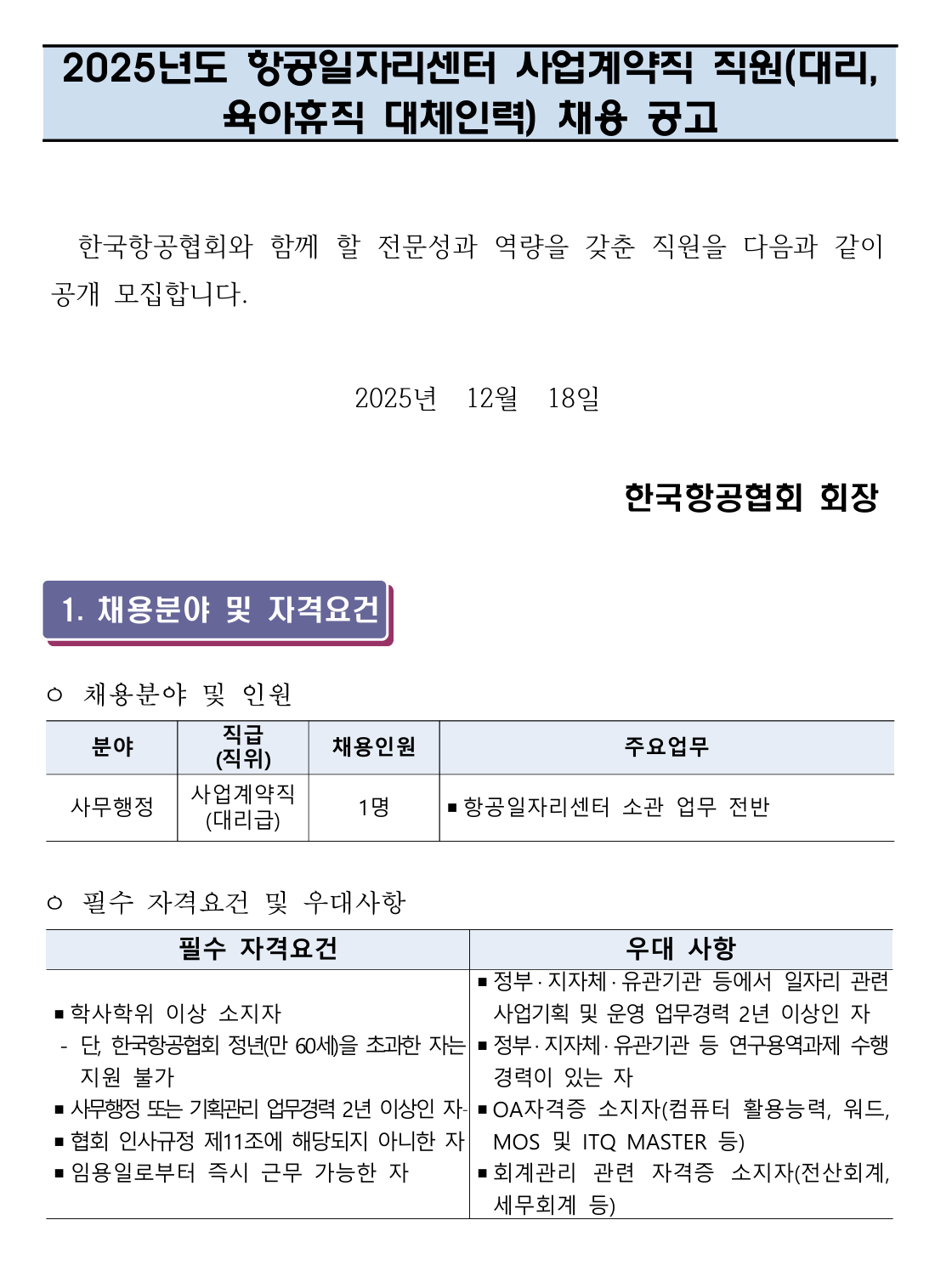 2025³âµµ Ç×°øÀÏÀÚ¸®¼¾ÅÍ »ç¾÷°è¾àÁ÷ Á÷¿ø(´ë¸®, À°¾ÆÈÞÁ÷ ´ëüÀηÂ) ä¿ë °ø°í