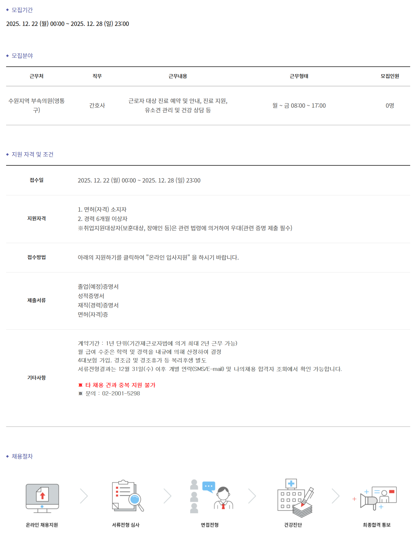 ±Ù¹«Ã³ Á÷¹« ±Ù¹«³»¿ë ±Ù¹«ÇüÅ ¸ðÁýÀοø ¼ö¿øÁö¿ª ºÎ¼ÓÀÇ¿ø(¿µÅ뱸) °£È£»ç ±Ù·ÎÀÚ ´ë»ó Áø·á ¿¹¾à ¹× ¾È³», Áø·á Áö¿ø, À¯¼Ò°ß °ü¸® ¹× °Ç° »ó´ã µî ¿ù ~ ±Ý 08:00 ~ 17:00 0¸í