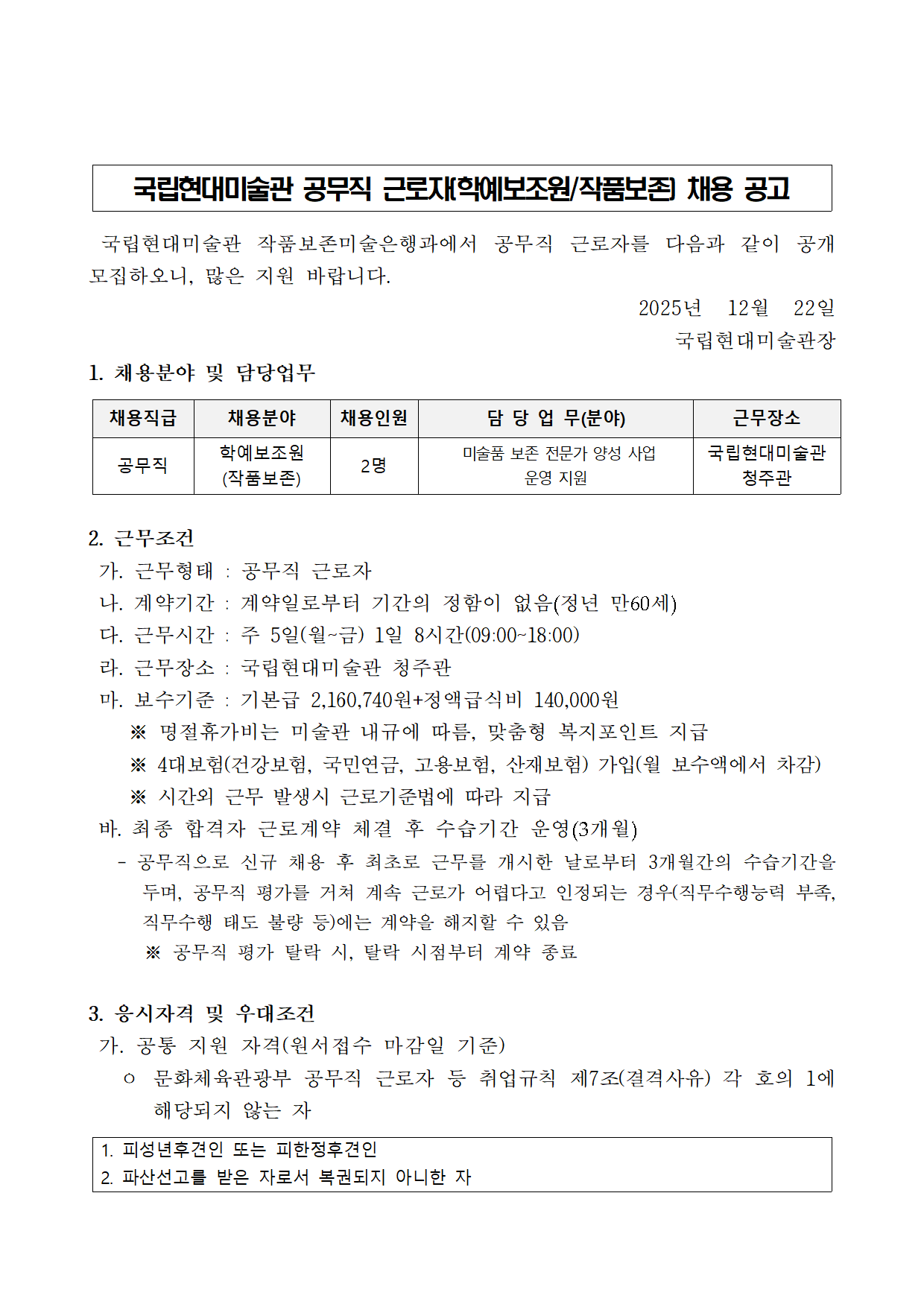 ±¹¸³Çö´ë¹Ì¼ú°ü °ø¹«Á÷ ±Ù·ÎÀÚ(Çп¹º¸Á¶¿ø/ÀÛǰº¸Á¸) ä¿ë °ø°í