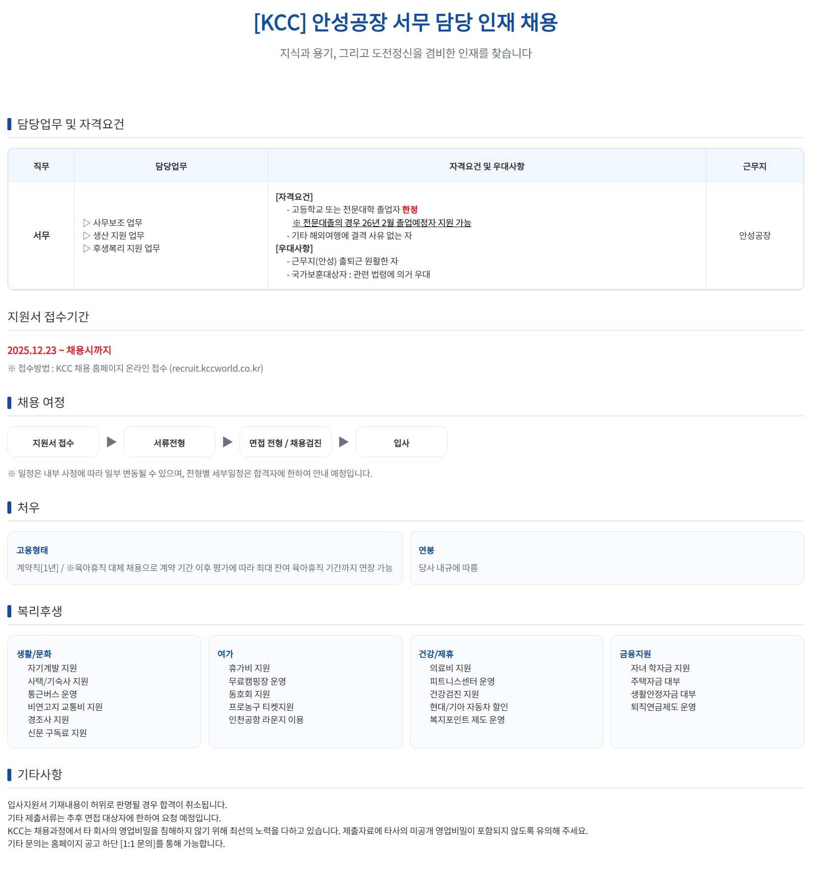 ¡Ø Á¢¼ö¹æ¹ý : KCC ä¿ë ȨÆäÀÌÁö ¿Â¶óÀÎ Á¢¼ö (recruit.kccworld.co.kr)