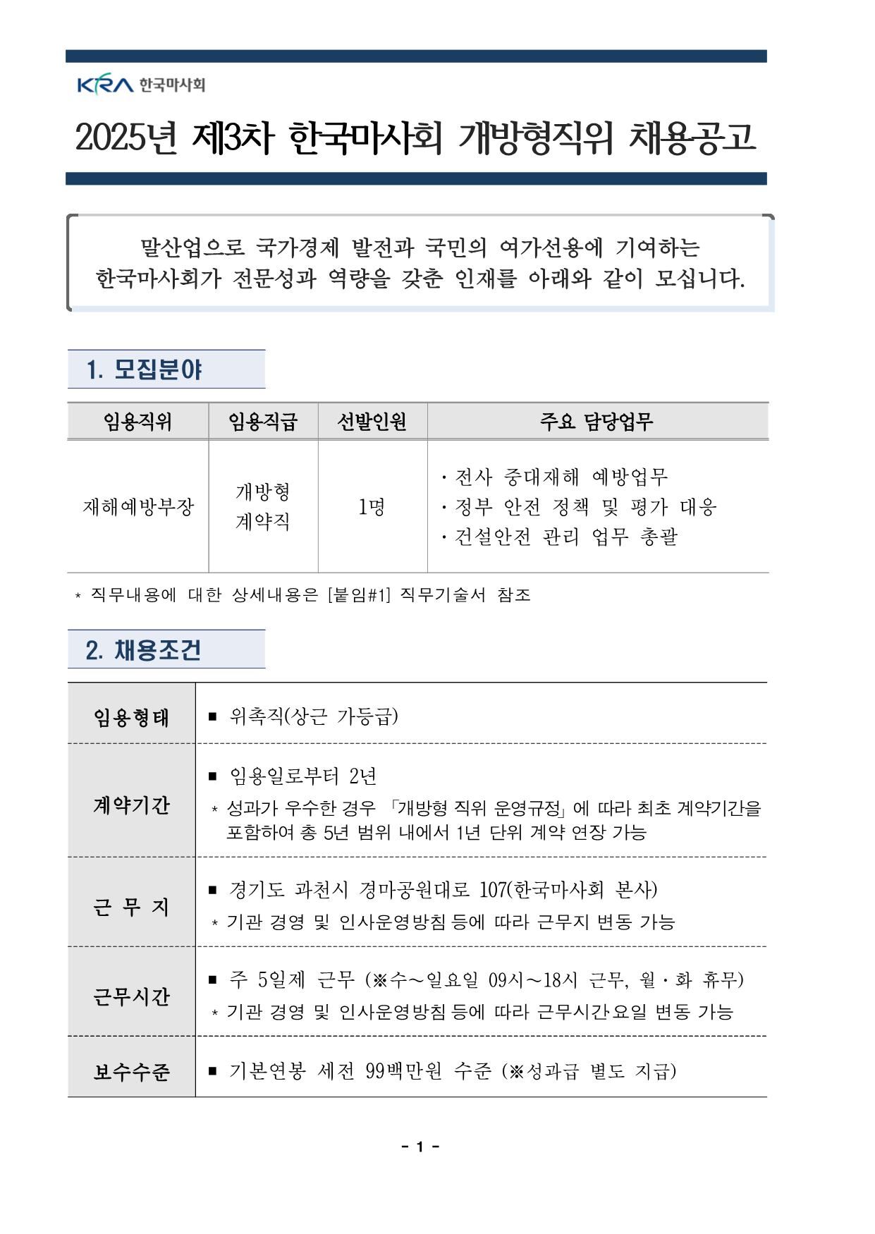 1. ¸ðÁýºÐ¾ß ÀÓ¿ëÁ÷À§ ÀÓ¿ëÁ÷±Þ ¼±¹ßÀοø ÁÖ¿ä ´ã´ç¾÷¹« ÀçÇØ¿¹¹æºÎÀå °³¹æÇü °è¾àÁ÷ 1¸í ¡¤Àü»ç Áß´ëÀçÇØ ¿¹¹æ¾÷¹« ¡¤Á¤ºÎ ¾ÈÀü Á¤Ã¥ ¹× Æò°¡ ´ëÀÀ ¡¤°Ç¼³¾ÈÀü °ü¸® ¾÷¹« ÃѰý * Á÷¹«³»¿ë¿¡ ´ëÇÑ »ó¼¼³»¿ëÀº [ºÙÀÓ#1] Á÷¹«±â¼ú¼ ÂüÁ¶