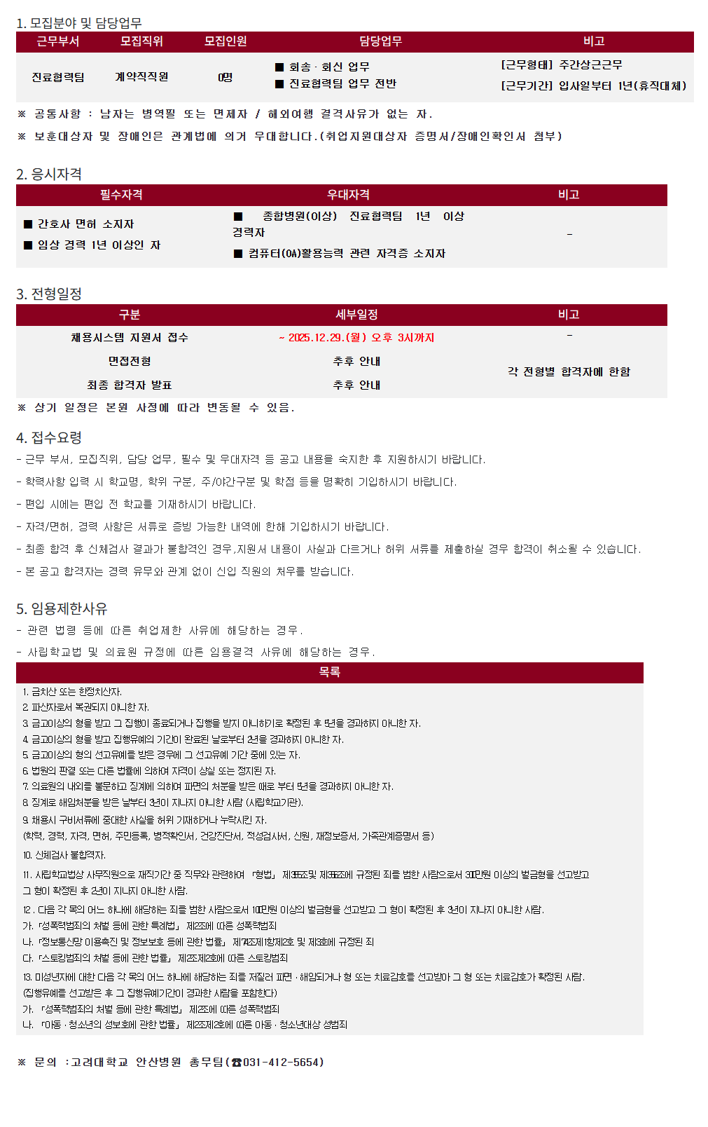 [¾È»êº´¿ø25-204] Áø·áÇù·ÂÆÀ °è¾àÁ÷Á÷¿ø ¸ðÁý(ÈÞÁ÷´ëü) 1. ¸ðÁýºÐ¾ß ¹× ´ã´ç¾÷¹« ±Ù¹«ºÎ¼­ ¸ðÁýÁ÷À§ ¸ðÁýÀοø ´ã´ç¾÷¹« ºñ°í Áø·áÇù·ÂÆÀ °è¾àÁ÷Á÷¿ø 0¸í ¡á ȸ¼Û¡¤È¸½Å ¾÷¹« ¡á Áø·áÇù·ÂÆÀ ¾÷¹« Àü¹Ý [±Ù¹«ÇüÅÂ] ÁÖ°£»ó±Ù±Ù¹« [±Ù¹«±â°£] ÀÔ»çÀϺÎÅÍ 1³â(ÈÞÁ÷´ëü) ¡Ø °øÅë»çÇ× : ³²ÀÚ´Â º´¿ªÇÊ ¶Ç´Â ¸éÁ¦ÀÚ / ÇØ¿Ü¿©Çà °á°Ý»çÀ¯°¡ ¾ø´Â ÀÚ. ¡Ø º¸ÈÆ´ë»óÀÚ ¹× Àå¾ÖÀÎÀº °ü°è¹ý¿¡ ÀǰŠ¿ì´ëÇÕ´Ï´Ù.(Ãë¾÷Áö¿ø´ë»óÀÚ Áõ¸í¼­/Àå¾ÖÀÎÈ®Àμ­ ÷ºÎ) 2. ÀÀ½ÃÀÚ°Ý ÇʼöÀÚ°Ý ¿ì´ëÀÚ°Ý ºñ°í ¡á °£È£»ç ¸éÇã ¼ÒÁöÀÚ ¡á ÀÓ»ó °æ·Â 1³â ÀÌ»óÀÎ ÀÚ ¡á Á¾ÇÕº´¿ø(ÀÌ»ó) Áø·áÇù·ÂÆÀ 1³â ÀÌ»ó °æ·ÂÀÚ ¡á ÄÄÇ»ÅÍ(OA)Ȱ¿ë´É·Â °ü·Ã ÀÚ°ÝÁõ ¼ÒÁöÀÚ - 3. ÀüÇüÀÏÁ¤ ±¸ºÐ ¼¼ºÎÀÏÁ¤ ºñ°í ä¿ë½Ã½ºÅÛ Áö¿ø¼­ Á¢¼ö ~ 2025.12.29.(¿ù) ¿ÀÈÄ 3½Ã±îÁö - ¸éÁ¢ÀüÇü ÃßÈÄ ¾È³» °¢ ÀüÇüº° ÇÕ°ÝÀÚ¿¡ ÇÑÇÔ ÃÖÁ¾ ÇÕ°ÝÀÚ ¹ßÇ¥ ÃßÈÄ ¾È³» ¡Ø »ó±â ÀÏÁ¤Àº º»¿ø »çÁ¤¿¡ µû¶ó º¯µ¿µÉ ¼ö ÀÖÀ½. 4. Á¢¼ö¿ä·É - ±Ù¹« ºÎ¼­, ¸ðÁýÁ÷À§, ´ã´ç ¾÷¹«, Çʼö ¹× ¿ì´ëÀÚ°Ý µî °ø°í ³»¿ëÀ» ¼÷ÁöÇÑ ÈÄ Áö¿øÇϽñ⠹ٶø´Ï´Ù. - Çз»çÇ× ÀÔ·Â ½Ã Çб³¸í, ÇÐÀ§ ±¸ºÐ, ÁÖ/¾ß°£±¸ºÐ ¹× ÇÐÁ¡ µîÀ» ¸íÈ®È÷ ±âÀÔÇϽñ⠹ٶø´Ï´Ù. - ÆíÀÔ ½Ã¿¡´Â ÆíÀÔ Àü Çб³¸¦ ±âÀçÇϽñ⠹ٶø´Ï´Ù. - ÀÚ°Ý/¸éÇã, °æ·Â »çÇ×Àº ¼­·ù·Î Áõºù °¡´ÉÇÑ ³»¿ª¿¡ ÇÑÇØ ±âÀÔÇϽñ⠹ٶø´Ï´Ù. - ÃÖÁ¾ ÇÕ°Ý ÈÄ ½Åü°Ë»ç °á°ú°¡ ºÒÇÕ°ÝÀÎ °æ¿ì,Áö¿ø¼­ ³»¿ëÀÌ »ç½Ç°ú ´Ù¸£°Å³ª ÇãÀ§ ¼­·ù¸¦ Á¦ÃâÇÏ½Ç °æ¿ì ÇÕ°ÝÀÌ Ãë¼ÒµÉ ¼ö ÀÖ½À´Ï´Ù. - º» °ø°í ÇÕ°ÝÀÚ´Â °æ·Â À¯¹«¿Í °ü°è ¾øÀÌ ½ÅÀÔ Á÷¿øÀÇ Ã³¿ì¸¦ ¹Þ½À´Ï´Ù. 5. ÀÓ¿ëÁ¦ÇÑ»çÀ¯ - °ü·Ã ¹ý·É µî¿¡ µû¸¥ Ãë¾÷Á¦ÇÑ »çÀ¯¿¡ ÇØ´çÇÏ´Â °æ¿ì. - »ç¸³Çб³¹ý ¹× ÀÇ·á¿ø ±ÔÁ¤¿¡ µû¸¥ ÀÓ¿ë°á°Ý »çÀ¯¿¡ ÇØ´çÇÏ´Â °æ¿ì. ¸ñ·Ï 1. ±ÝÄ¡»ê ¶Ç´Â ÇÑÁ¤Ä¡»êÀÚ. 2. ÆÄ»êÀڷμ­ º¹±ÇµÇÁö ¾Æ´ÏÇÑ ÀÚ. 3. ±Ý°íÀÌ»óÀÇ ÇüÀ» ¹Þ°í ±× ÁýÇàÀÌ Á¾·áµÇ°Å³ª ÁýÇàÀ» ¹ÞÁö ¾Æ´ÏÇϱâ·Î È®Á¤µÈ ÈÄ 5³âÀ» °æ°úÇÏÁö ¾Æ´ÏÇÑ ÀÚ. 4. ±Ý°íÀÌ»óÀÇ ÇüÀ» ¹Þ°í ÁýÇàÀ¯¿¹ÀÇ ±â°£ÀÌ ¿Ï·áµÈ ³¯·ÎºÎÅÍ 2³âÀ» °æ°úÇÏÁö ¾Æ´ÏÇÑ ÀÚ. 5. ±Ý°íÀÌ»óÀÇ ÇüÀÇ ¼±°íÀ¯¿¹¸¦ ¹ÞÀº °æ¿ì¿¡ ±× ¼±°íÀ¯¿¹ ±â°£ Áß¿¡ ÀÖ´Â ÀÚ. 6. ¹ý¿øÀÇ ÆÇ°á ¶Ç´Â ´Ù¸¥ ¹ý·ü¿¡ ÀÇÇÏ¿© ÀÚ°ÝÀÌ »ó½Ç ¶Ç´Â Á¤ÁöµÈ ÀÚ. 7. ÀÇ·á¿øÀÇ ³»¿Ü¸¦ ºÒ¹®Çϰí ¡°è¿¡ ÀÇÇÏ¿© ÆÄ¸éÀÇ Ã³ºÐÀ» ¹ÞÀº ¶§·Î ºÎÅÍ 5³âÀ» °æ°úÇÏÁö ¾Æ´ÏÇÑ ÀÚ. 8. ¡°è·Î ÇØÀÓóºÐÀ» ¹ÞÀº ³¯ºÎÅÍ 3³âÀÌ Áö³ªÁö ¾Æ´ÏÇÑ »ç¶÷ (»ç¸³Çб³±â°ü). 9. ä¿ë½Ã ±¸ºñ¼­·ù¿¡ Áß´ëÇÑ »ç½ÇÀ» ÇãÀ§ ±âÀçÇϰųª ´©¶ô½ÃŲ ÀÚ. (ÇзÂ, °æ·Â, ÀÚ°Ý, ¸éÇã, Áֹεî·Ï, º´ÀûÈ®Àμ­, °Ç°­Áø´Ü¼­, Àû¼º°Ë»ç¼­, ½Å¿ø, ÀçÁ¤º¸Áõ¼­, °¡Á·°ü°èÁõ¸í¼­ µî) 10. ½Åü°Ë»ç ºÒÇÕ°ÝÀÚ. 11. »ç¸³Çб³¹ý»ó »ç¹«Á÷¿øÀ¸·Î ÀçÁ÷±â°£ Áß Á÷¹«¿Í °ü·ÃÇÏ¿© ¡¸Çü¹ý¡¹ Á¦355Á¶¹× Á¦356Á¶¿¡ ±ÔÁ¤µÈ Á˸¦ ¹üÇÑ »ç¶÷À¸·Î¼­ 300¸¸¿ø ÀÌ»óÀÇ ¹ú±ÝÇüÀ» ¼±°í¹Þ°í ±× ÇüÀÌ È®Á¤µÈ ÈÄ 2³âÀÌ Áö³ªÁö ¾Æ´ÏÇÑ »ç¶÷. 12 . ´ÙÀ½ °¢ ¸ñÀÇ ¾î´À Çϳª¿¡ ÇØ´çÇÏ´Â Á˸¦ ¹üÇÑ »ç¶÷À¸·Î¼­ 100¸¸¿ø ÀÌ»óÀÇ ¹ú±ÝÇüÀ» ¼±°í¹Þ°í ±× ÇüÀÌ È®Á¤µÈ ÈÄ 3³âÀÌ Áö³ªÁö ¾Æ´ÏÇÑ »ç¶÷. °¡.¡¸¼ºÆø·Â¹üÁËÀÇ Ã³¹ú µî¿¡ °üÇÑ Æ¯·Ê¹ý¡¹ Á¦2Á¶¿¡ µû¸¥ ¼ºÆø·Â¹üÁË ³ª.¡¸Á¤º¸Åë½Å¸Á ÀÌ¿ëÃËÁø ¹× Á¤º¸º¸È£ µî¿¡ °üÇÑ ¹ý·ü¡¹ Á¦74Á¶Á¦1Ç×Á¦2È£ ¹× Á¦3È£¿¡ ±ÔÁ¤µÈ ÁË ´Ù.¡¸½ºÅäÅ·¹üÁËÀÇ Ã³¹ú µî¿¡ °üÇÑ ¹ý·ü¡¹ Á¦2Á¶Á¦2È£¿¡ µû¸¥ ½ºÅäÅ·¹üÁË 13. ¹Ì¼º³âÀÚ¿¡ ´ëÇÑ ´ÙÀ½ °¢ ¸ñÀÇ ¾î´À Çϳª¿¡ ÇØ´çÇÏ´Â Á˸¦ ÀúÁú·¯ ÆÄ¸é¤ýÇØÀӵǰųª Çü ¶Ç´Â Ä¡·á°¨È£¸¦ ¼±°í¹Þ¾Æ ±× Çü ¶Ç´Â Ä¡·á°¨È£°¡ È®Á¤µÈ »ç¶÷. (ÁýÇàÀ¯¿¹¸¦ ¼±°í¹ÞÀº ÈÄ ±× ÁýÇàÀ¯¿¹±â°£ÀÌ °æ°úÇÑ »ç¶÷À» Æ÷ÇÔÇÑ´Ù) °¡. ¡¸¼ºÆø·Â¹üÁËÀÇ Ã³¹ú µî¿¡ °üÇÑ Æ¯·Ê¹ý¡¹ Á¦2Á¶¿¡ µû¸¥ ¼ºÆø·Â¹üÁË ³ª. ¡¸¾Æµ¿¤ýû¼Ò³âÀÇ ¼ºº¸È£¿¡ °üÇÑ ¹ý·ü¡¹ Á¦2Á¶Á¦2È£¿¡ µû¸¥ ¾Æµ¿¤ýû¼Ò³â´ë»ó ¼º¹üÁË ¡Ø ¹®ÀÇ :°í·Á´ëÇб³ ¾È»êº´¿ø Ãѹ«ÆÀ(¢Ï***-****-****)