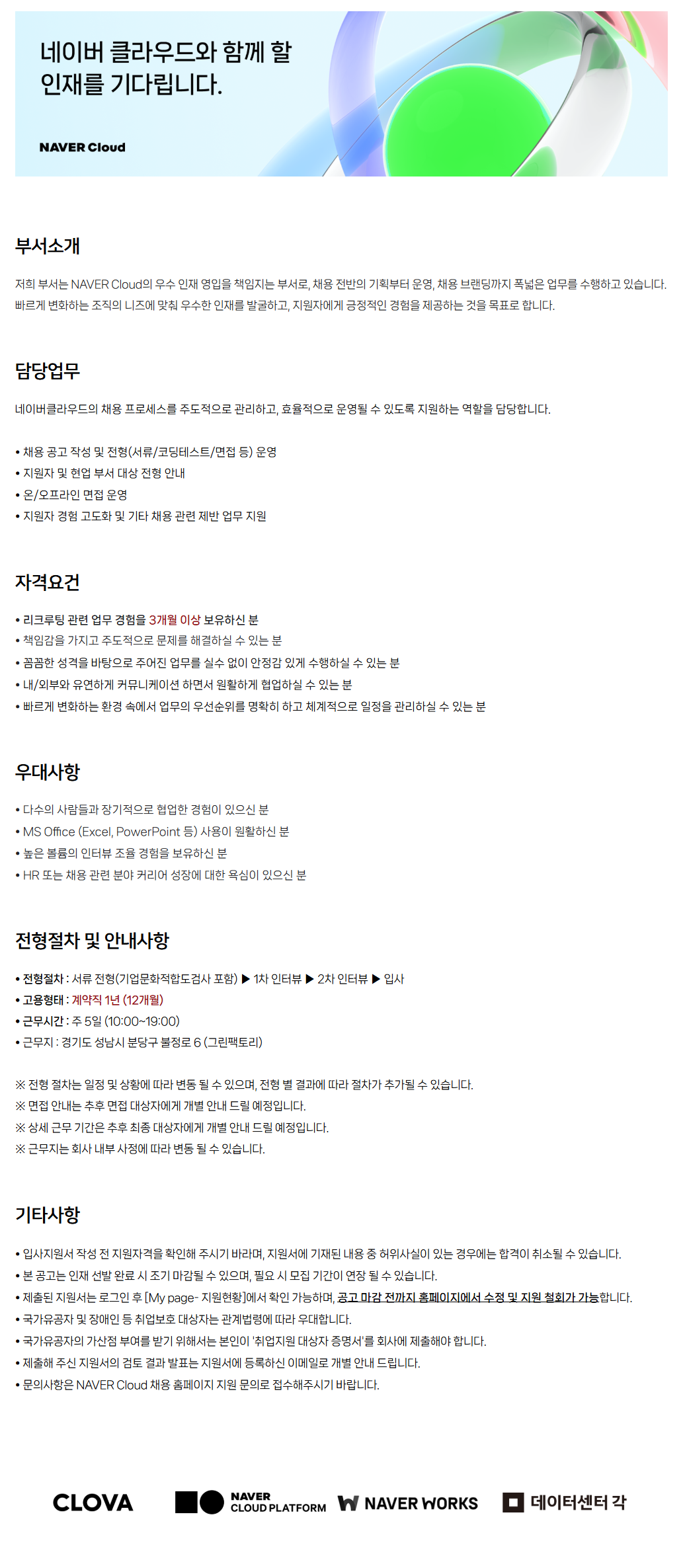 ÀúÈñ ºÎ¼´Â NAVER CloudÀÇ ¿ì¼ö ÀÎÀç ¿µÀÔÀ» Ã¥ÀÓÁö´Â ºÎ¼·Î, ä¿ë Àü¹ÝÀÇ ±âȹºÎÅÍ ¿î¿µ, ä¿ë ºê·£µù±îÁö Æø³ÐÀº ¾÷¹«¸¦ ¼öÇàÇϰí ÀÖ½À´Ï´Ù. ºü¸£°Ô º¯ÈÇÏ´Â Á¶Á÷ÀÇ ´ÏÁî¿¡ ¸ÂÃç ¿ì¼öÇÑ ÀÎÀ縦 ¹ß±¼Çϰí, Áö¿øÀÚ¿¡°Ô ±àÁ¤ÀûÀÎ °æÇèÀ» Á¦°øÇÏ´Â °ÍÀ» ¸ñÇ¥·Î ÇÕ´Ï´Ù.