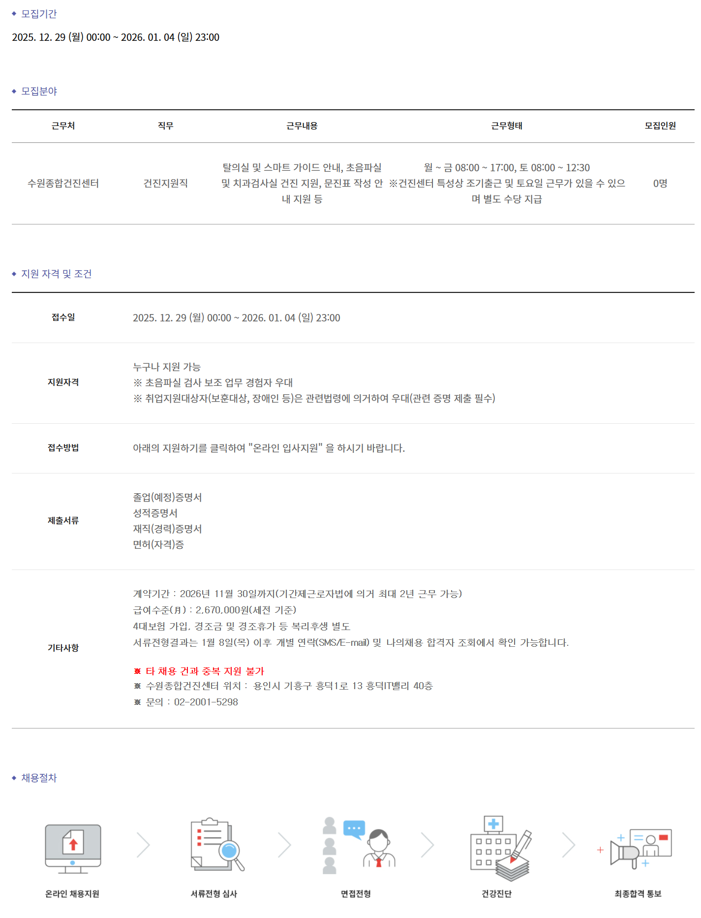 ¼ö¿øÁ¾ÇÕ°ÇÁø¼¾ÅÍ °ÇÁøÁö¿øÁ÷ Å»ÀÇ½Ç ¹× ½º¸¶Æ® °¡ÀÌµå ¾È³», ÃÊÀ½ÆÄ½Ç ¹× Ä¡°ú°Ë»ç½Ç °ÇÁø Áö¿ø, ¹®ÁøÇ¥ ÀÛ¼º ¾È³» Áö¿ø µî ¿ù ~ ±Ý 08:00 ~ 17:00, Åä 08:00 ~ 12:30