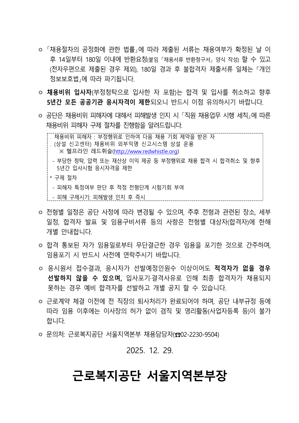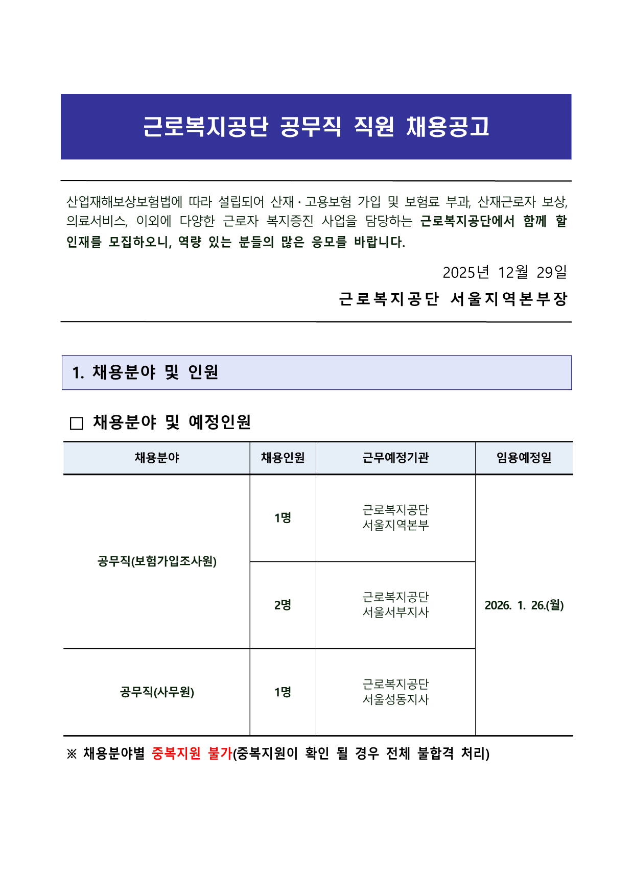 »ê¾÷ÀçÇØº¸»óº¸Çè¹ý¿¡ µû¶ó ¼³¸³µÇ¾î »êÀç・°í¿ëº¸Çè °¡ÀÔ ¹× º¸Çè·á ºÎ°ú, »êÀç±Ù·ÎÀÚ º¸»ó, ÀǷἺñ½º, À̿ܿ¡ ´Ù¾çÇÑ ±Ù·ÎÀÚ º¹ÁöÁõÁø »ç¾÷À» ´ã´çÇÏ´Â ±Ù·Îº¹Áö°ø´Ü¿¡¼ ÇÔ²² ÇÒ ÀÎÀ縦 ¸ðÁýÇÏ¿À´Ï, ¿ª·® ÀÖ´Â ºÐµéÀÇ ¸¹Àº ÀÀ¸ð¸¦ ¹Ù¶ø´Ï´Ù. 2025³â 12¿ù 29Àϱٷκ¹Áö°ø´Ü ¼¿ïÁö¿ªº»ºÎÀå¡à ä¿ëºÐ¾ß ¹× ¿¹Á¤Àοø ä¿ëºÐ¾ß ä¿ëÀοø ±Ù¹«¿¹Á¤±â°ü Àӿ뿹Á¤Àϰø¹«Á÷(º¸Çè°¡ÀÔÁ¶»ç¿ø) 1¸í ±Ù·Îº¹Áö°ø´Ü ¼¿ïÁö¿ªº»ºÎ 2¸í 2026. 1. 26.(¿ù) ±Ù·Îº¹Áö°ø´Ü ¼¿ï¼ºÎÁö»ç °ø¹«Á÷(»ç¹«¿ø) 1¸í ±Ù·Îº¹Áö°ø´Ü ¼¿ï¼ºµ¿Áö»ç ¡Ø ä¿ëºÐ¾ßº° Áߺ¹Áö¿ø ºÒ°¡(Áߺ¹Áö¿øÀÌ È®ÀÎ µÉ °æ¿ì Àüü ºÒÇÕ°Ý Ã³¸®)
