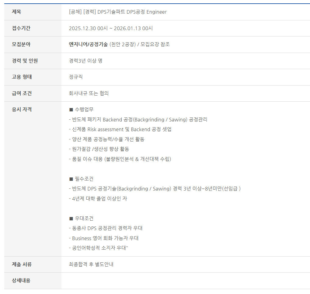 - ¹ÝµµÃ¼ DPS °øÁ¤±â¼ú(Backgrinding / Sawing) °æ·Â 3³â ÀÌ»ó~8³â¹Ì¸¸(¼±ÀÓ±Þ )