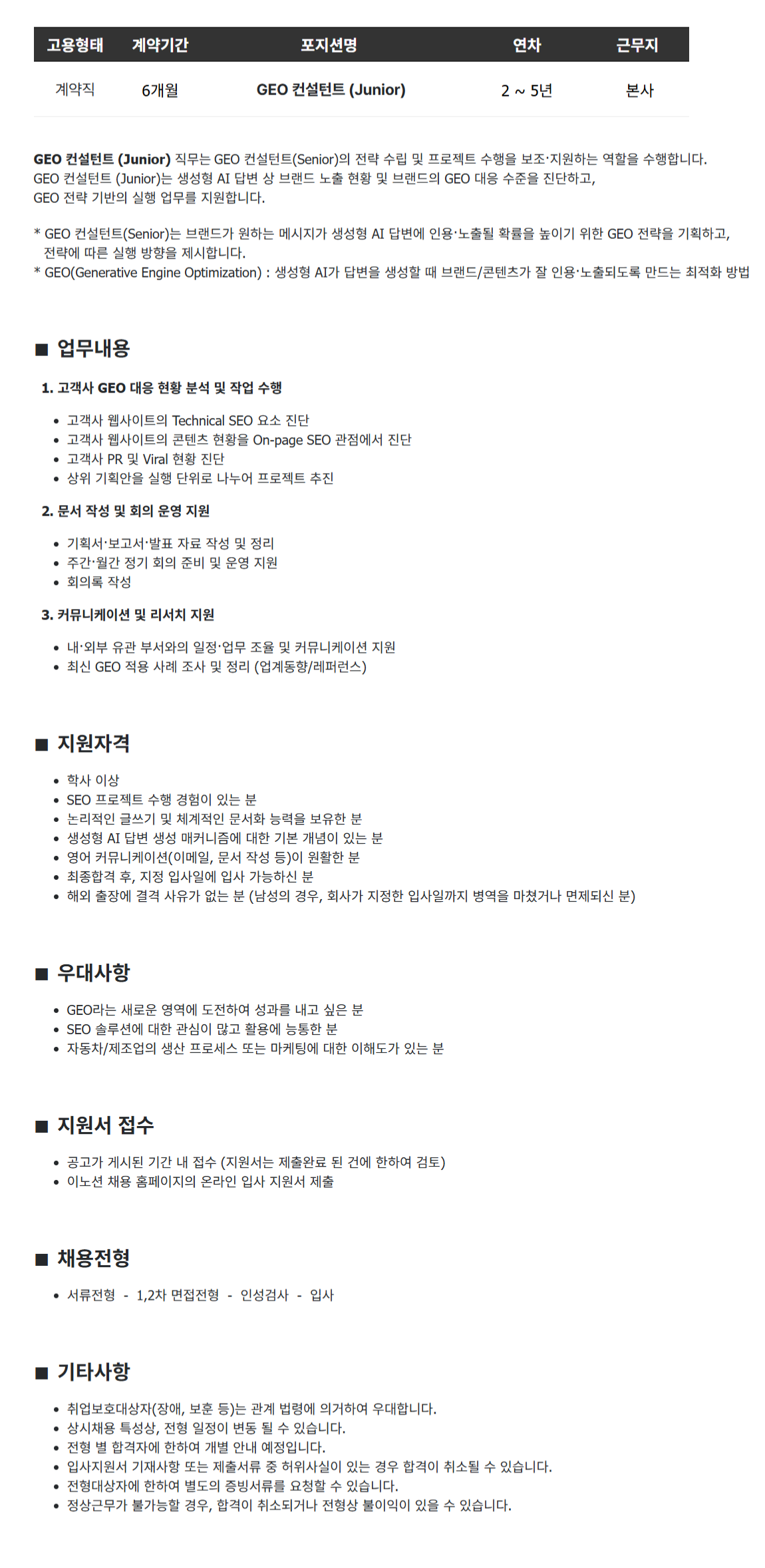 °í¿ëÇüÅ °è¾à±â°£ Æ÷Áö¼Ç¸í ¿¬Â÷ ±Ù¹«Áö °è¾àÁ÷ 6°³¿ù GEO ÄÁ¼³ÅÏÆ® (Junior) 2 ~ 5³â º»»ç